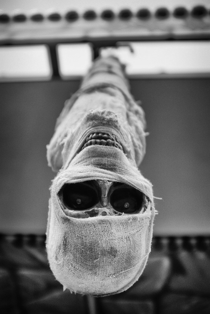 This little fella was hanging above the ghost train at the local fair one summer. The white of the bandages didn't really stand out until the image was converted to black and white.