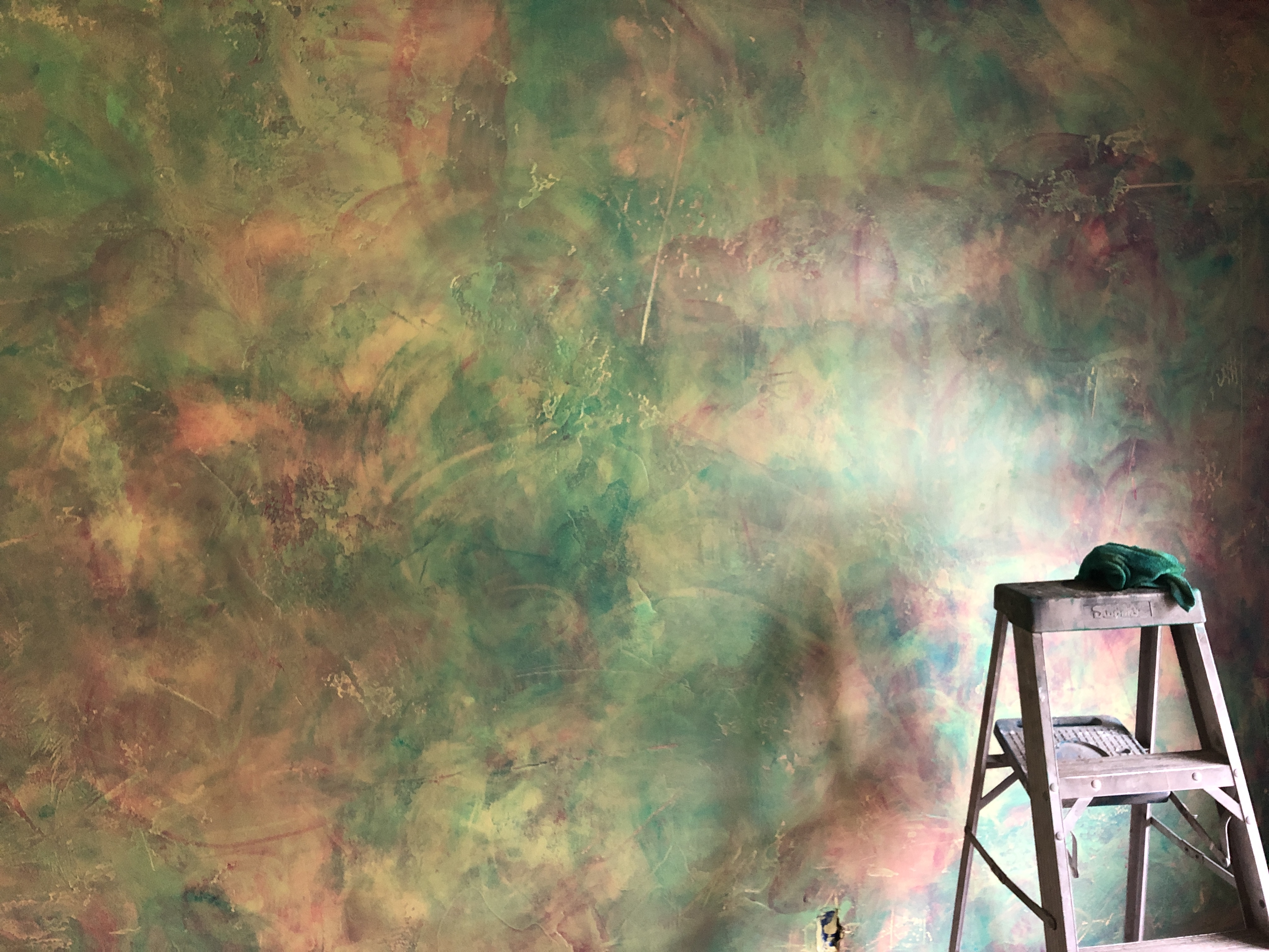 I started with a base coat of yellow/mustard/dandelion-ish. Right after finishing a wall, I took a square of an old bath towel and dipped it in water, wrung it out. Then dipped it into some rose/red latex paint and rubbed it all over in circular patterns. Then I did the same with some dark teal latex paint.