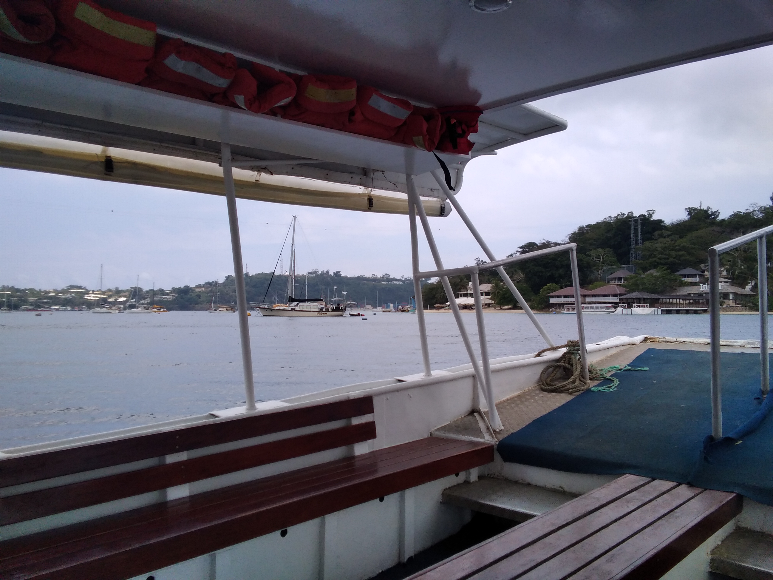 Boat traffic was high here in this part of the bay at the far end of the reef. A half kilometre over at the far end of the bay a massive cruise ship was anchored. Skips were racing back and forth every few minutes to drop off day trippers from the boat to the port. Many of the skiffs were racing past the back of Iririki Island where I was swimming taking the fastest rout to the main landing by the markets in town. I had to be weary of these boats and surfaced frequently to make sure none were heading my way. I'd bob on the surface as each approached and waved to let the captains know that there was a diver here. Most saw me and waved back. A few were taken by surprise and the expressions on their faces were as if to say "wtf a diver out here?" But they would turn their boats and give me a wide berth. Something I was thankful for. I continued diving.