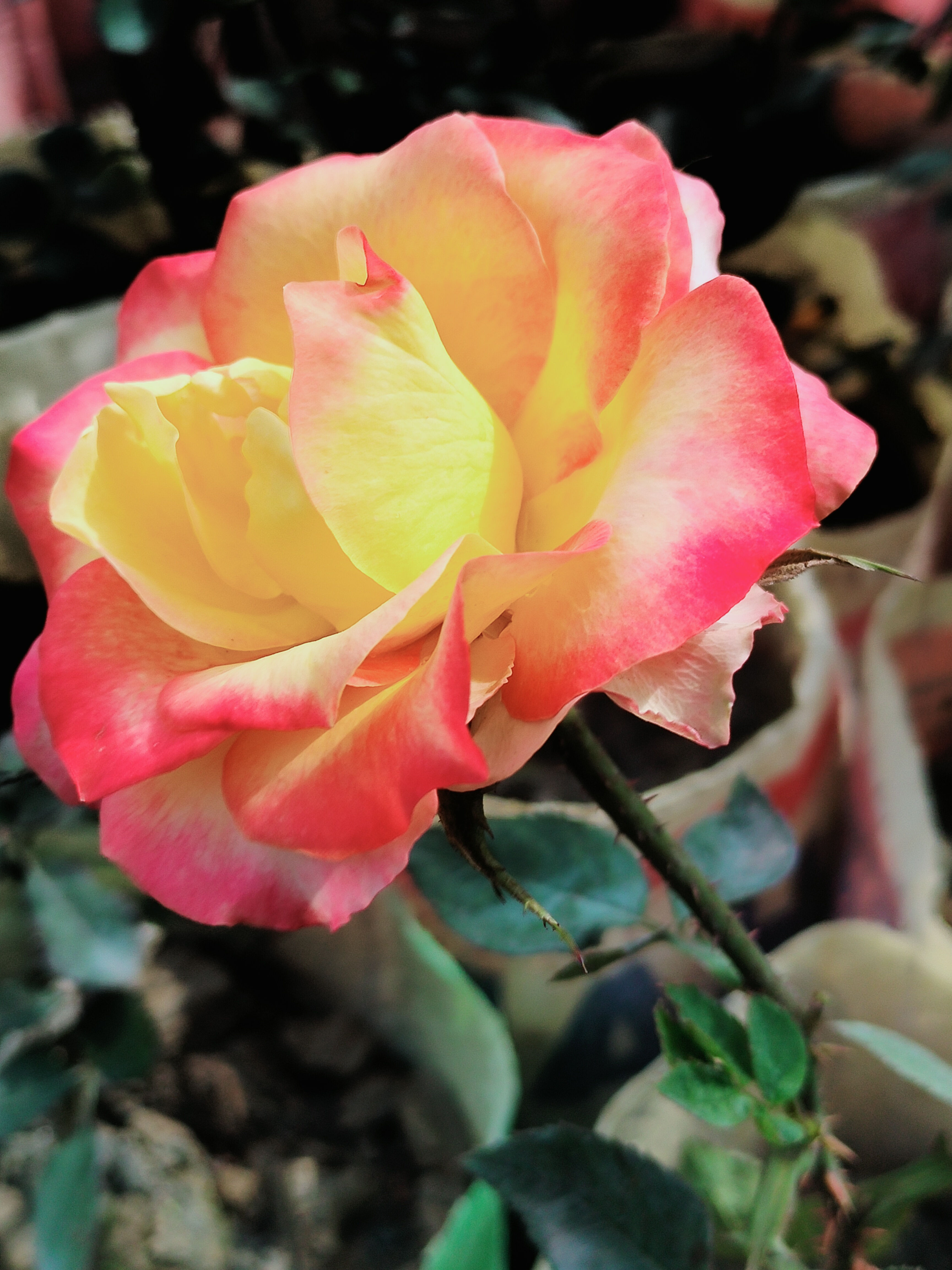এখন আপনারা যে ফুলটা দেখতে পাচ্ছেন এটাও দুইটা ভিন্ন কালারের। লাল এবং হলুদ কালারের গোলাপ ফুলটা হওয়ায় এই ফুলটা দেখতে অনেক বেশি সুন্দর লাগছিল। এই ফুলটা দেখার পর আমি তো জাস্ট মুগ্ধ হয়ে ছিলাম। এই ফুলটা আমি দেখেছিলাম আমাদের বাড়ি থেকে কিছুটা দূরে থাকা একটা নার্সারির মধ্যে। আর নার্সারিতে যখন এই ফুল দেখেছিলাম, তখন সাথে সাথে মোবাইলটা বের করে ফটোগ্রাফি করে নিয়েছিলাম। আর ভাবলাম এটাও তাহলে আপনাদের সবার মাঝে শেয়ার করা যায়। আশা করছি হলুদ এবং গোলাপী কালারের এই ফুলটার ফটোগ্রাফিও আপনারা অনেক বেশি পছন্দ করবেন।