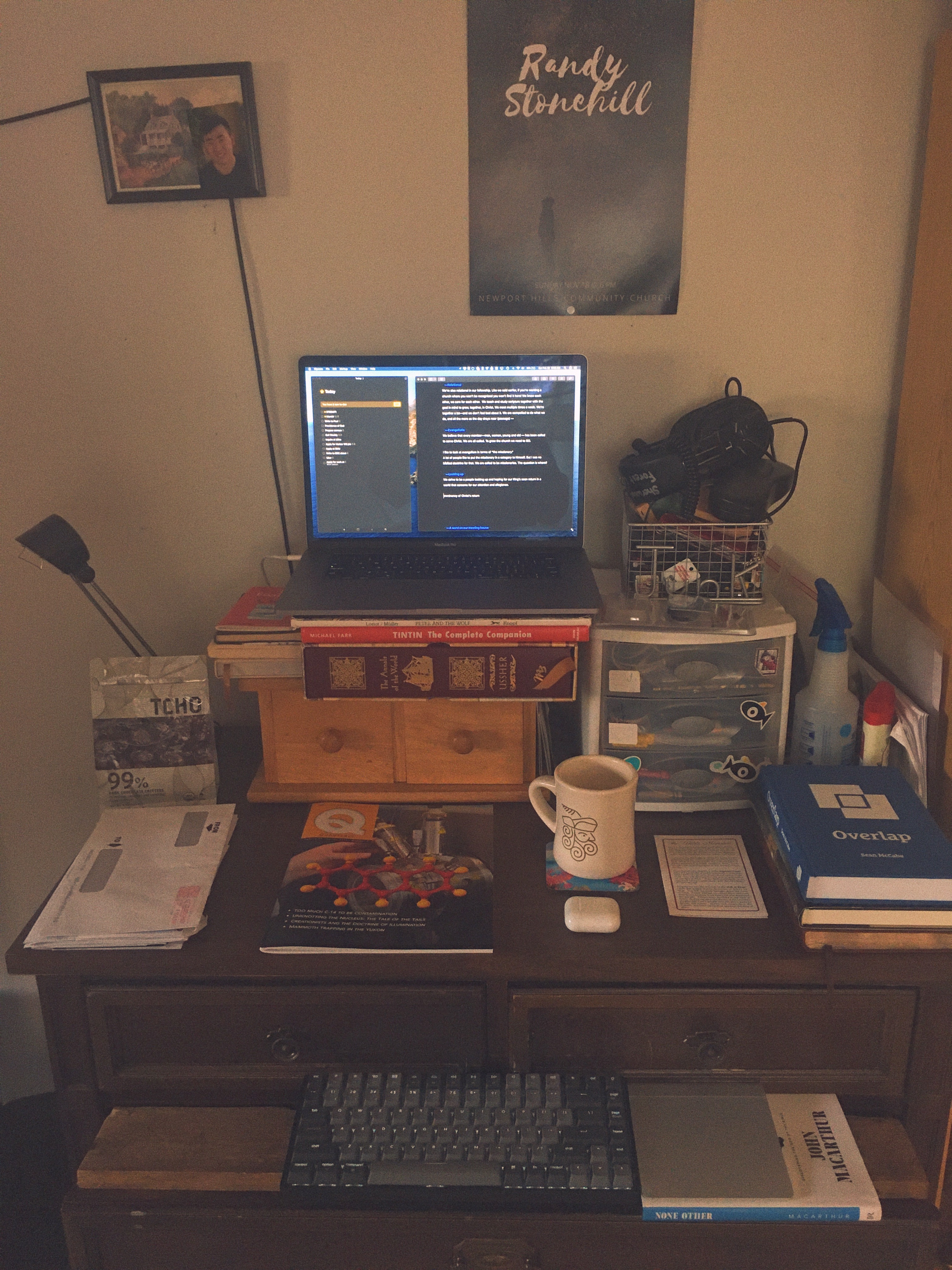 My desk. Chest-of-drawers turned Stand-up workstation for the win! Featuring Bluebeard Coffee mug. Also, open on my MacBook right now: Things and Ulysses. More on my setup in future posts.