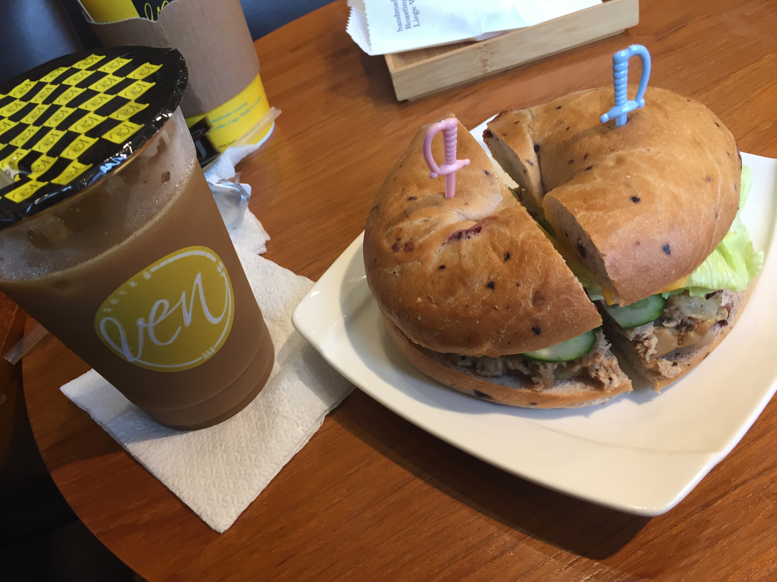 First meal in Tapei ๐ Bagel with tuna and veggies with an iced coffee