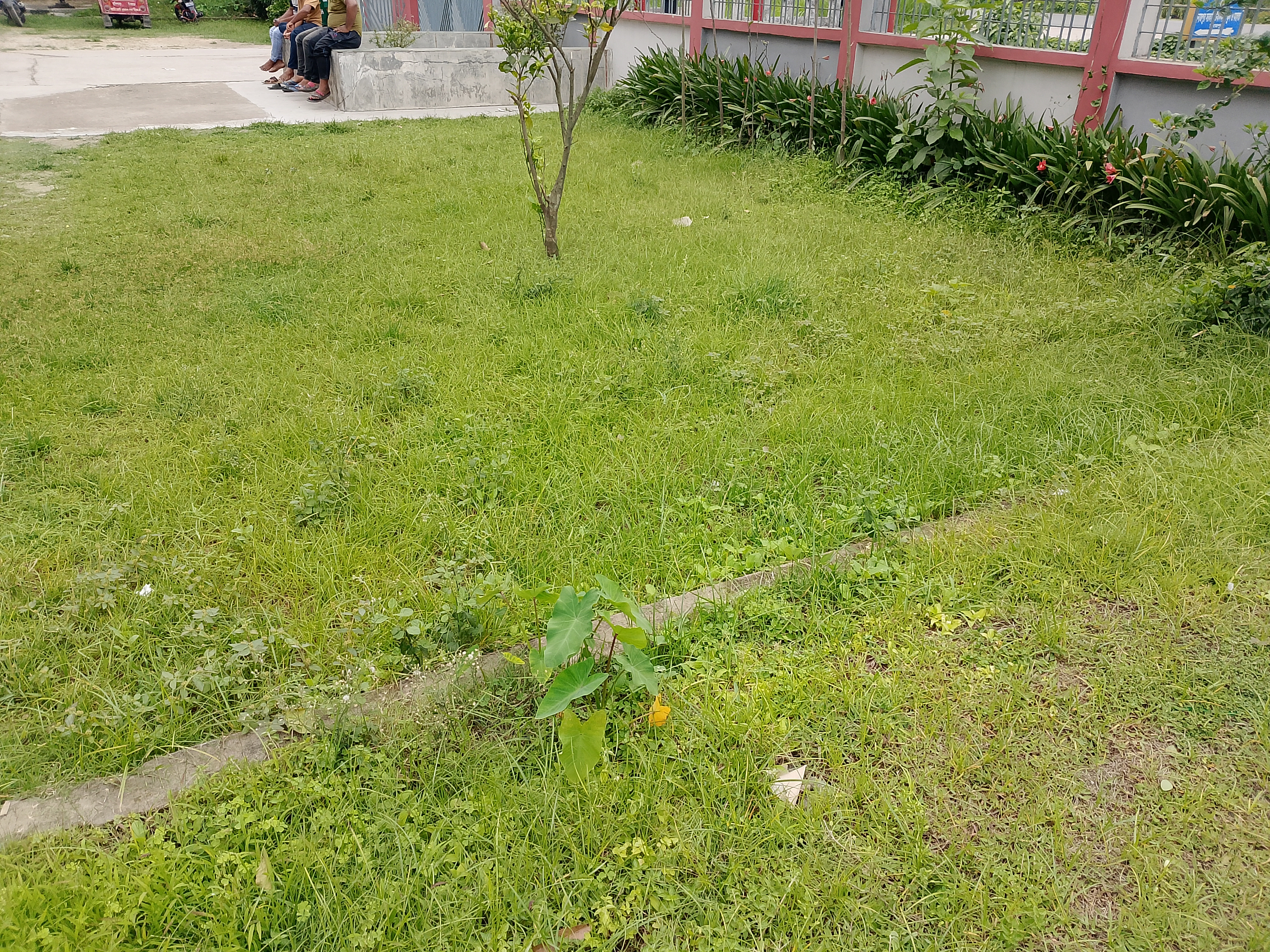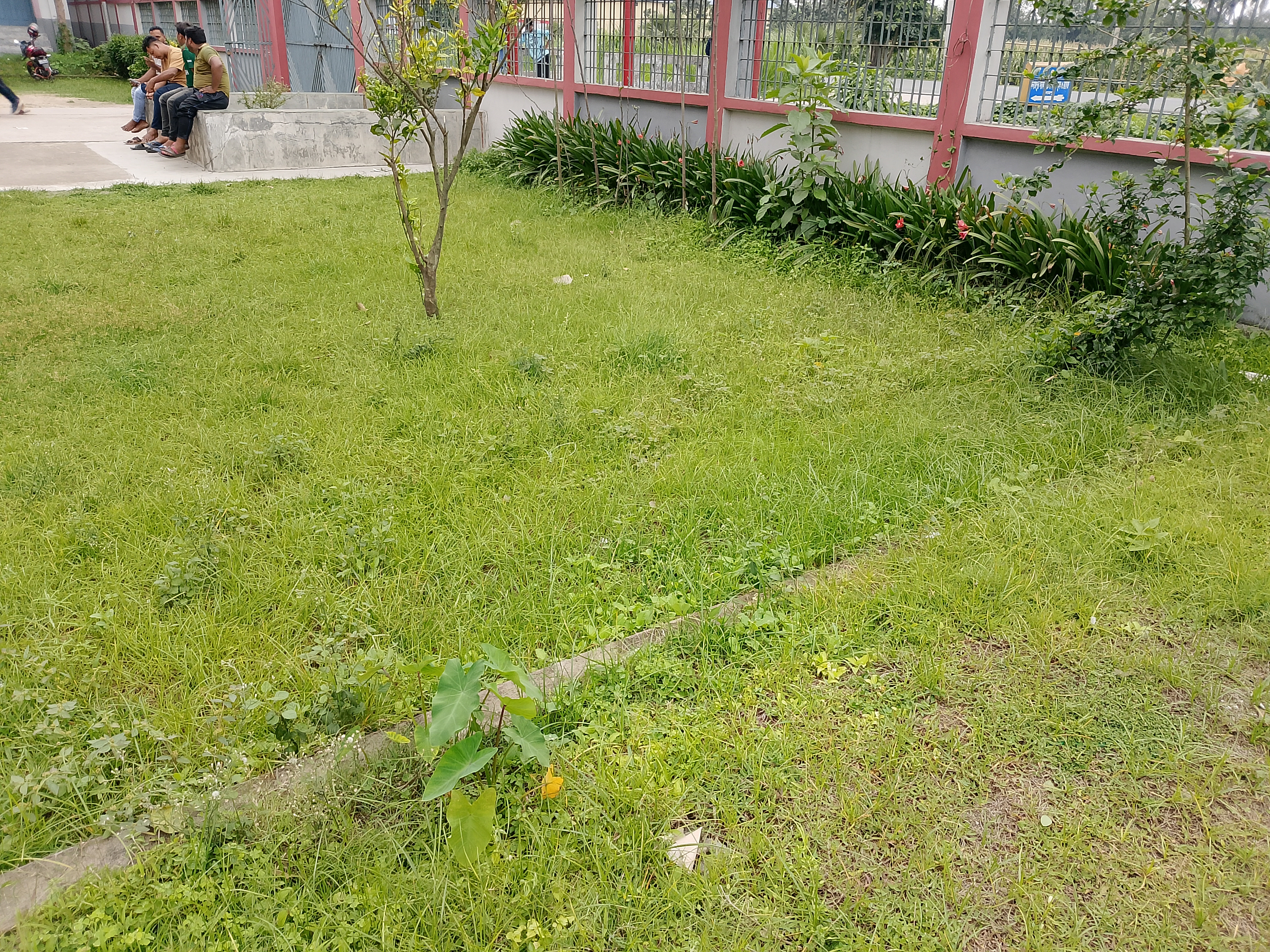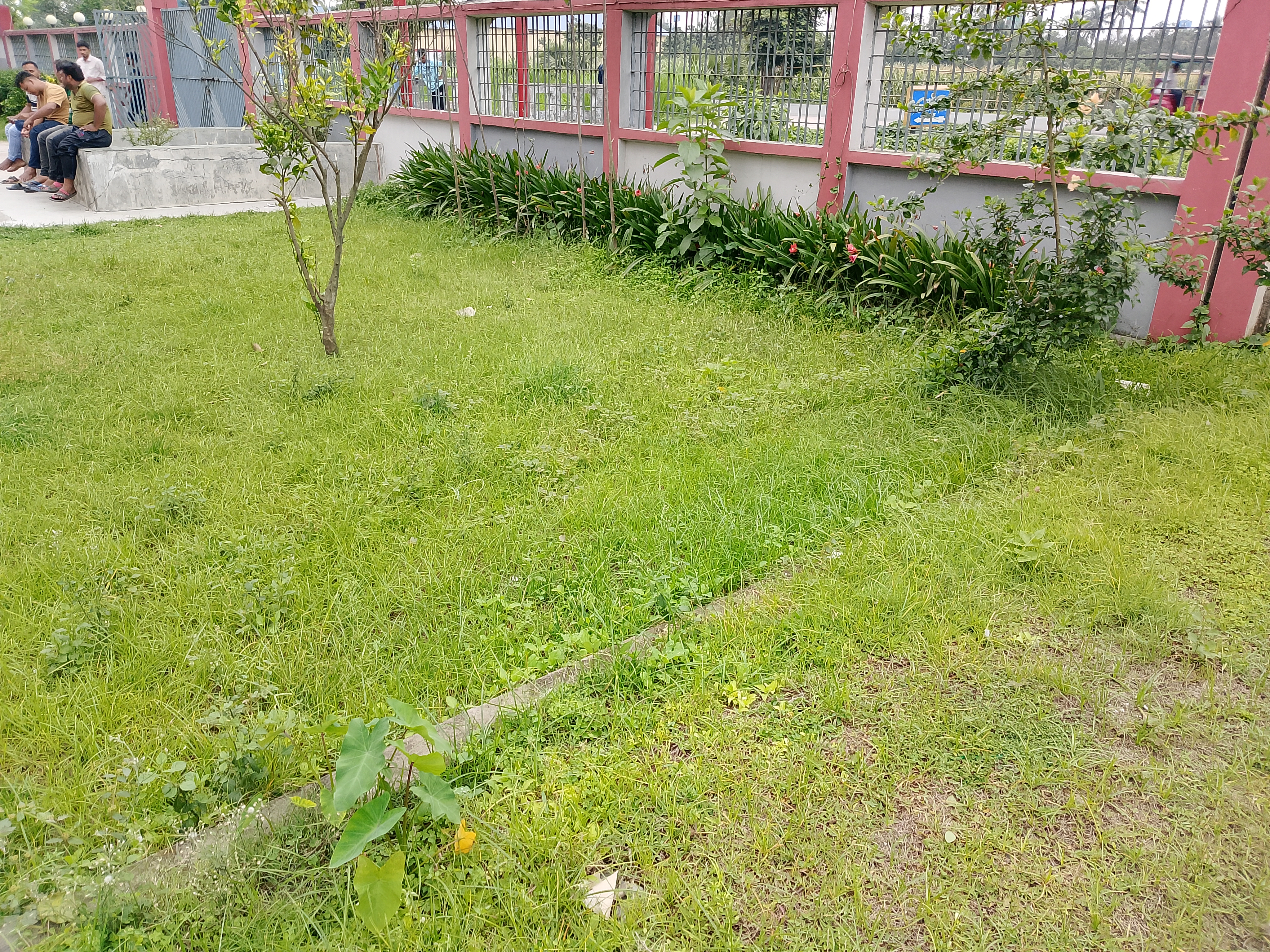 Inside a wall, there is a green space that creates a sitting environment for everyone. In front, you can see many people sitting there. It feels quite nice—it's a clean and tidy place with green grass all around. I went there to sit, but I noticed that there wasn’t any proper place to sit, so I stood outside and watched the people who were sitting there.
