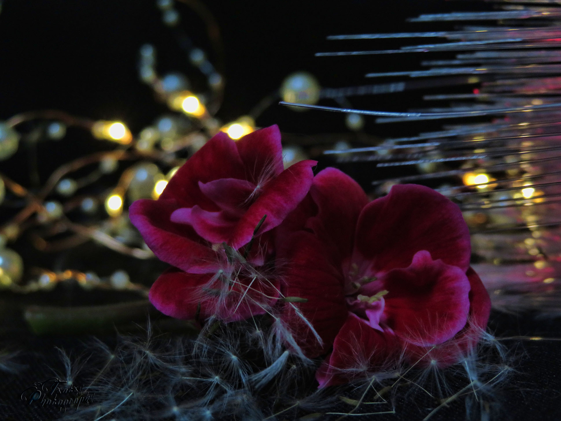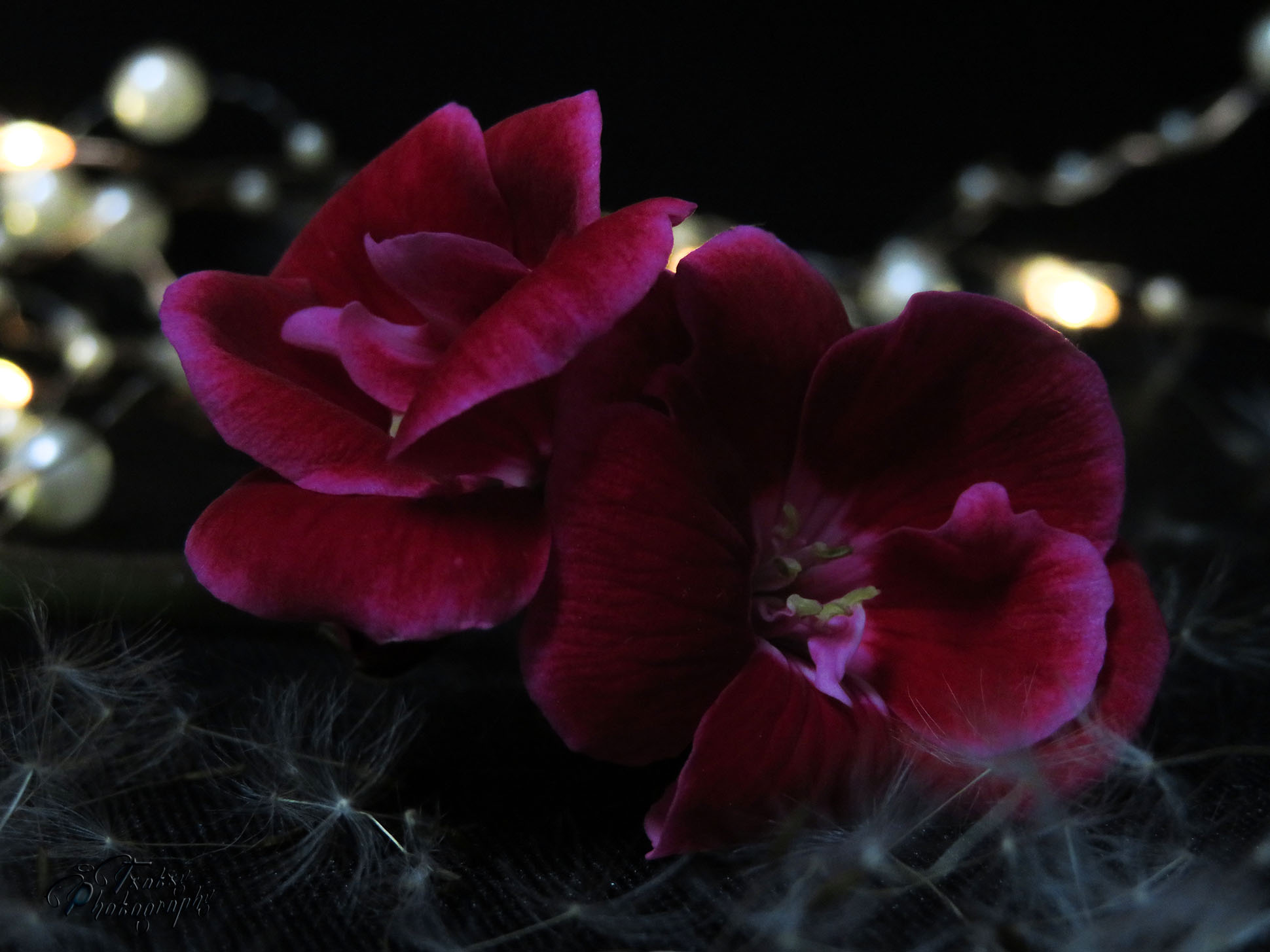 The flowers are geraniums and in the background led lights.