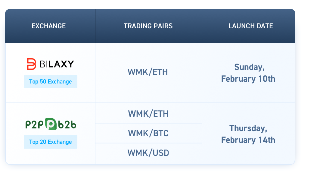 Bilaxy and p2pb2b will be the first exchange listings for WMK. Keep reading for the full details and listing schedule ahead.