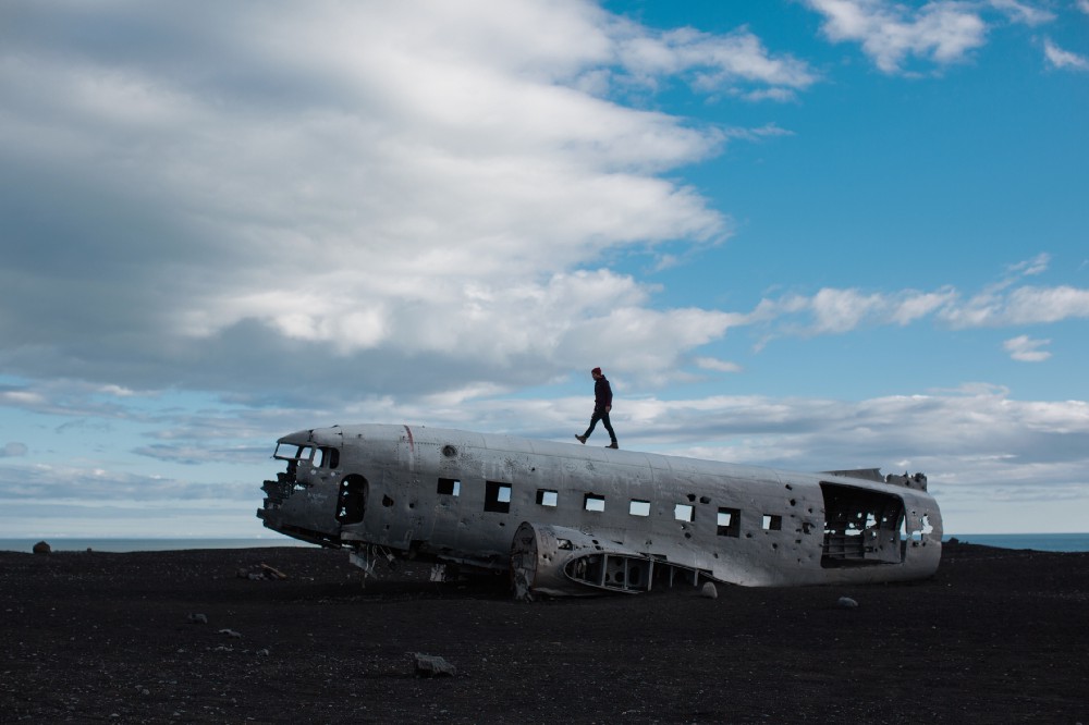 A man walks on top of airplane wreckage on a volcanic landscape in Iceland. Photo by Peter Amend / Image Source
