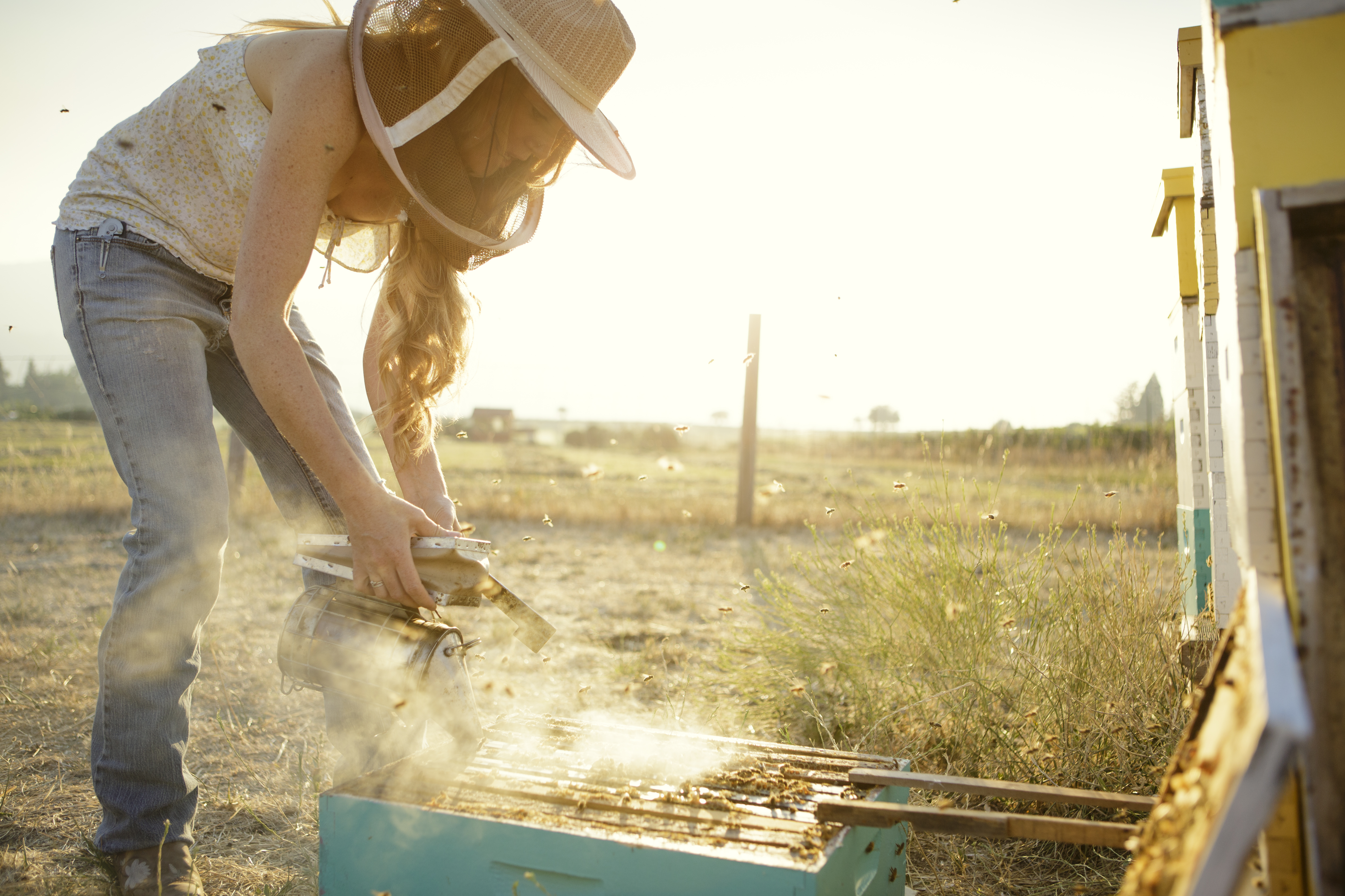 A beekeeper uses smoke to calm bees. Photo by Natalie Faye Young / The Good Brigade