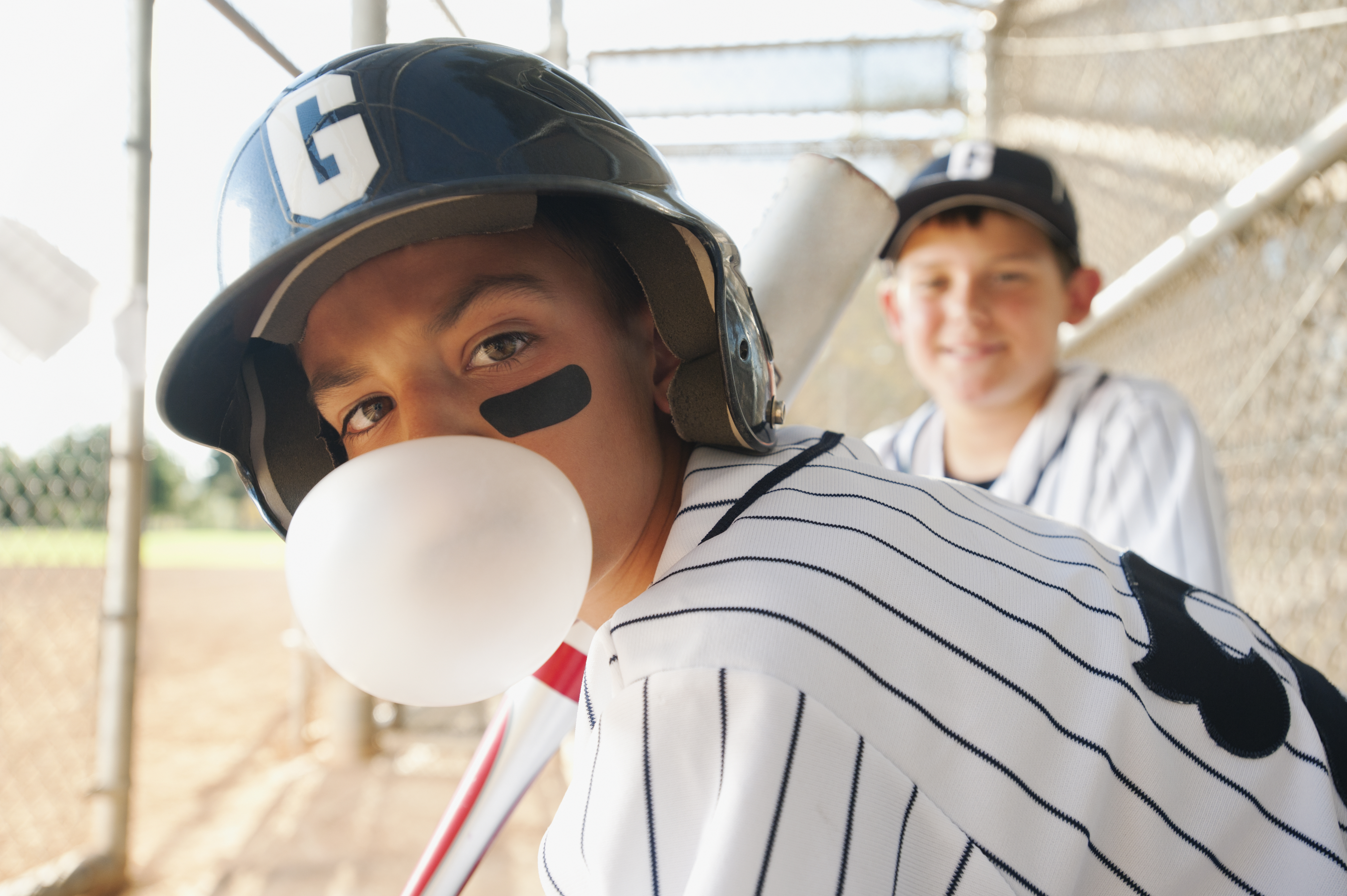 Two kids hang out in the dugout. Photo by Tetra Images