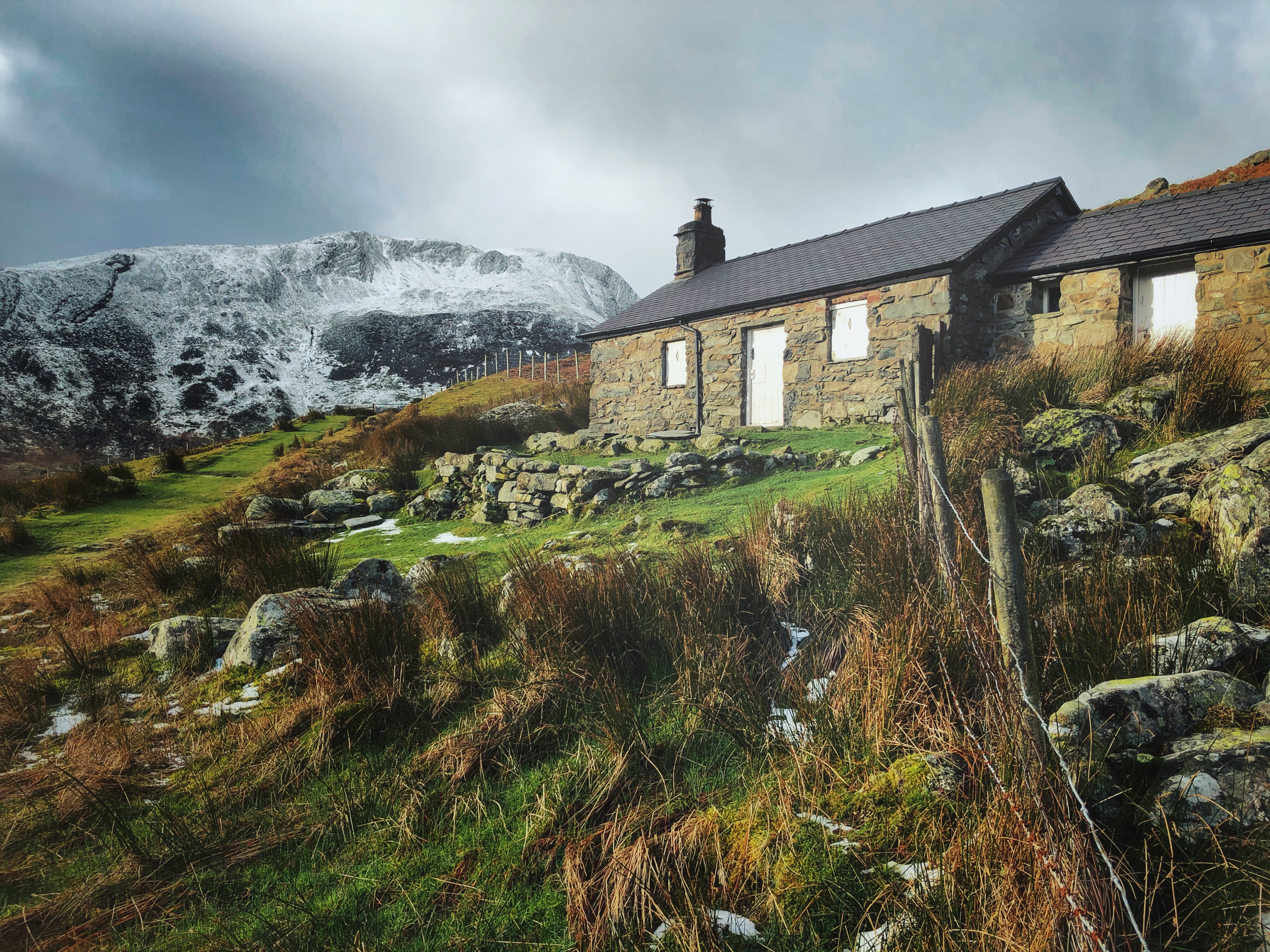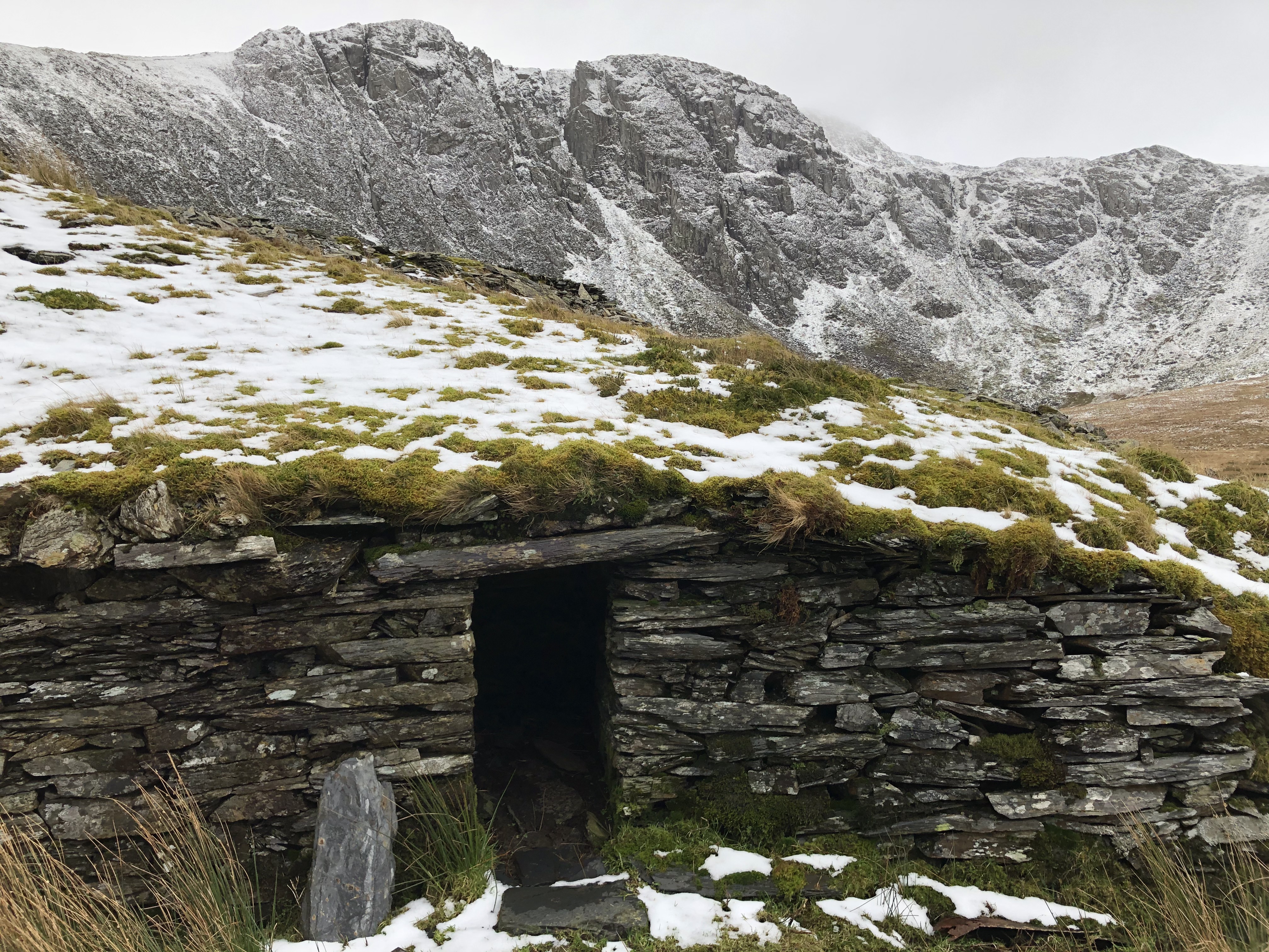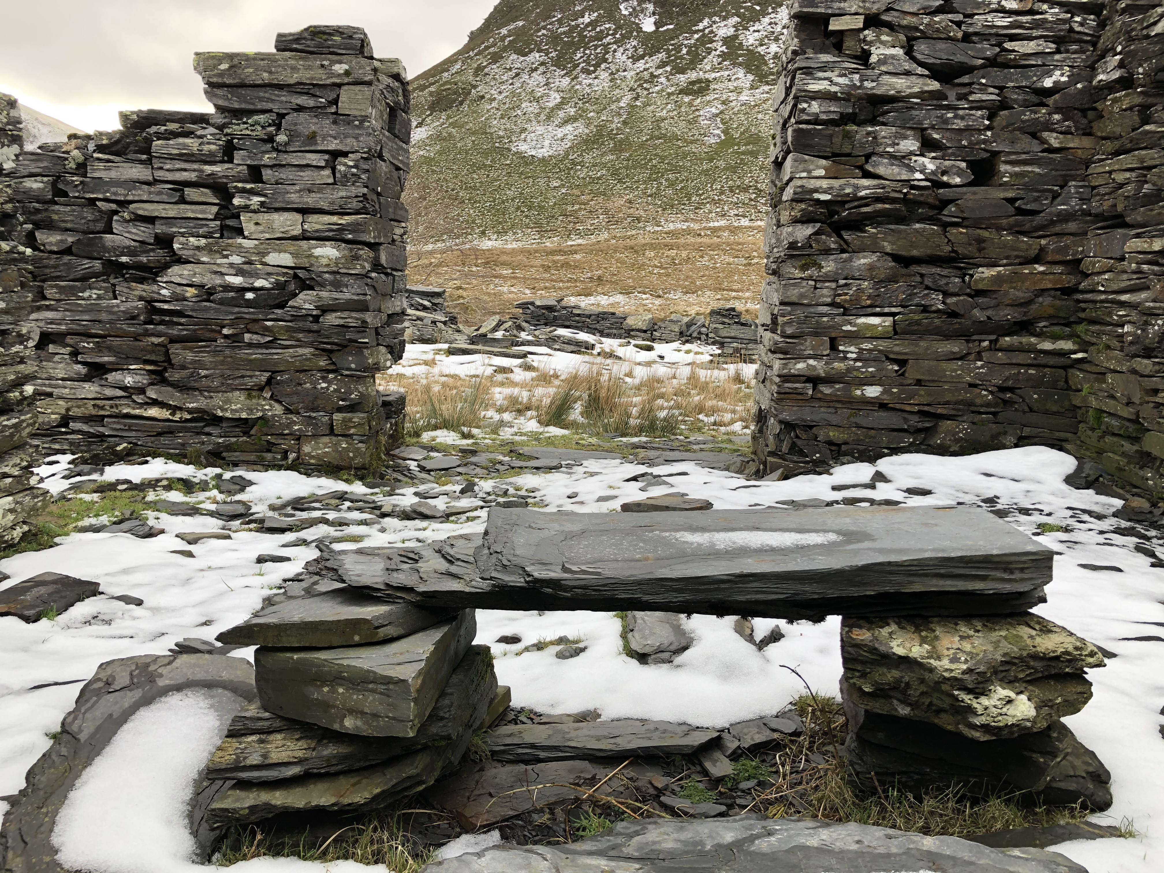 The village is marked by the the remains of the old roofless buildings and pump houses that litter the area. Their sharp slate corners glistened in the sunlight that was trying to burn through the low cloud that had began to form on the mountain tops that flanking me.