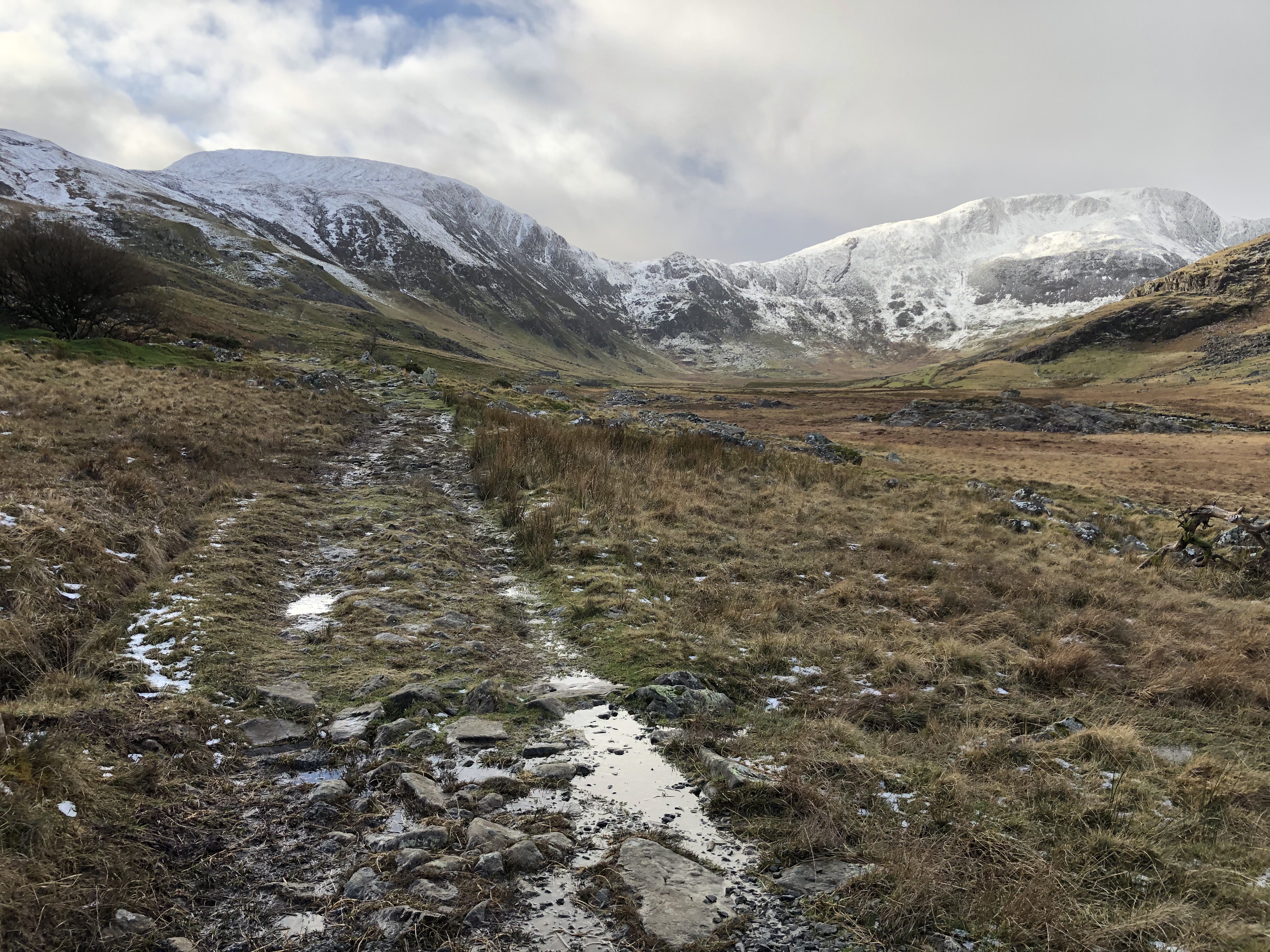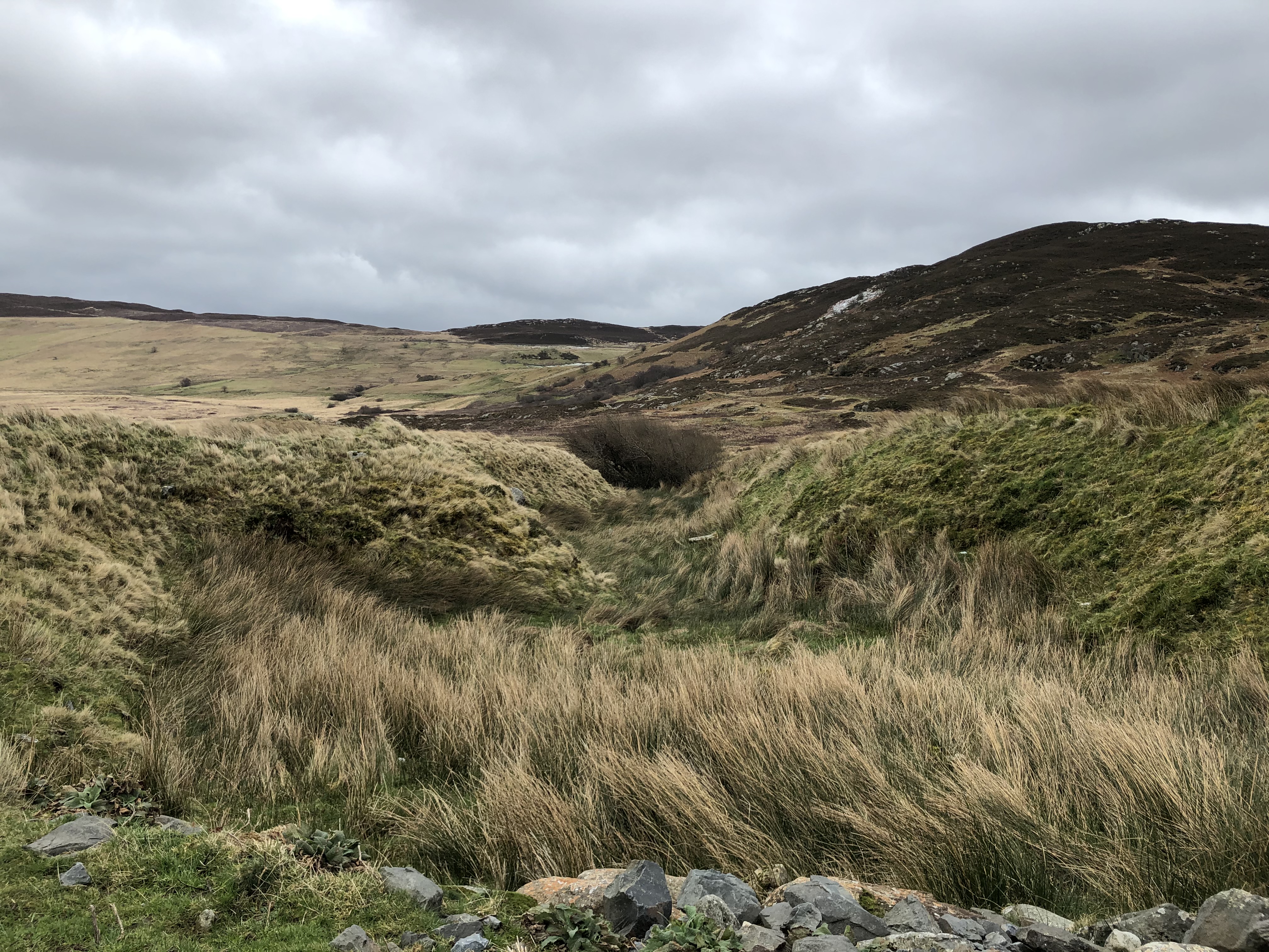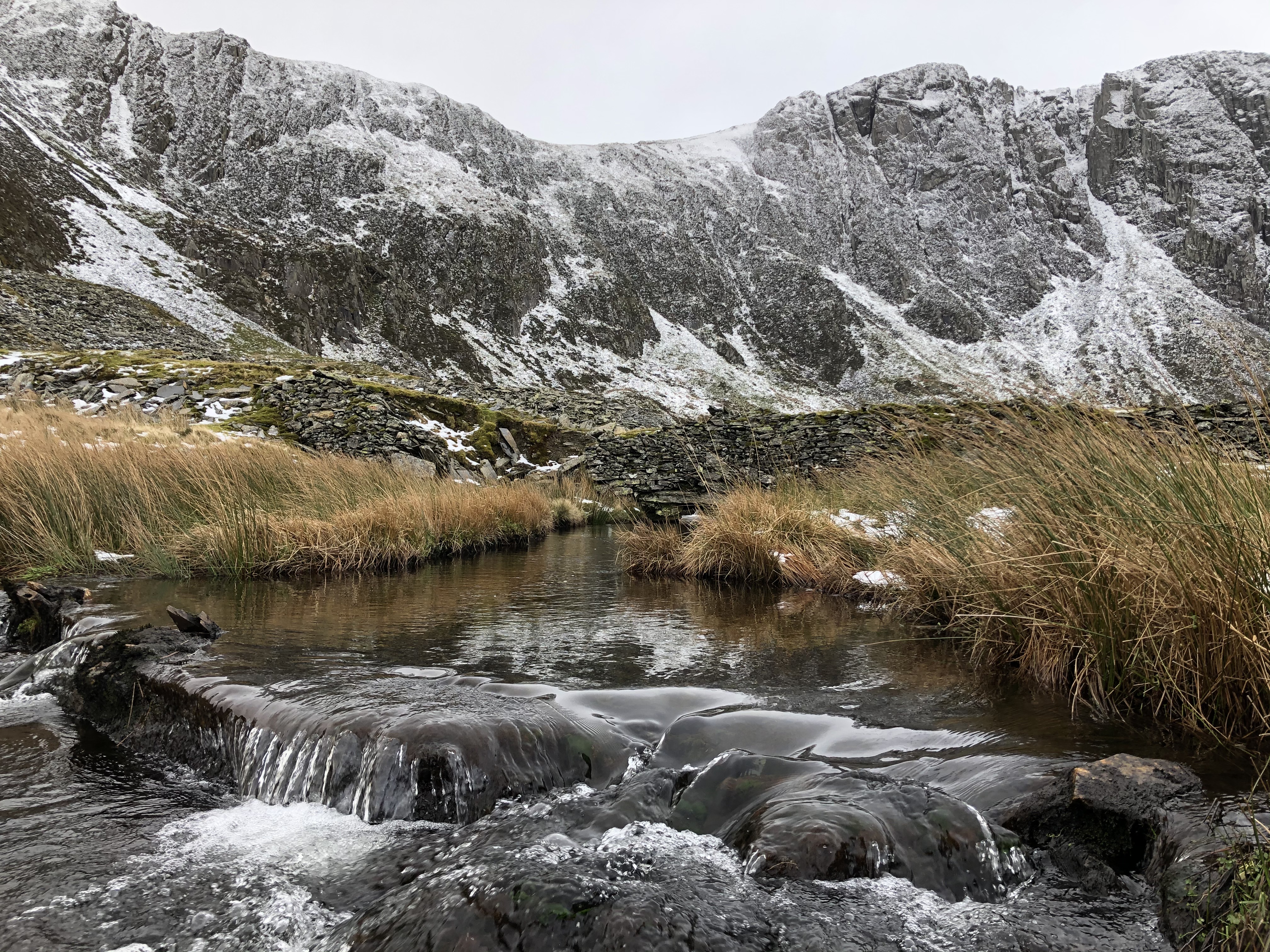 The village is marked by the the remains of the old roofless buildings and pump houses that litter the area. Their sharp slate corners glistened in the sunlight that was trying to burn through the low cloud that had began to form on the mountain tops that flanking me.