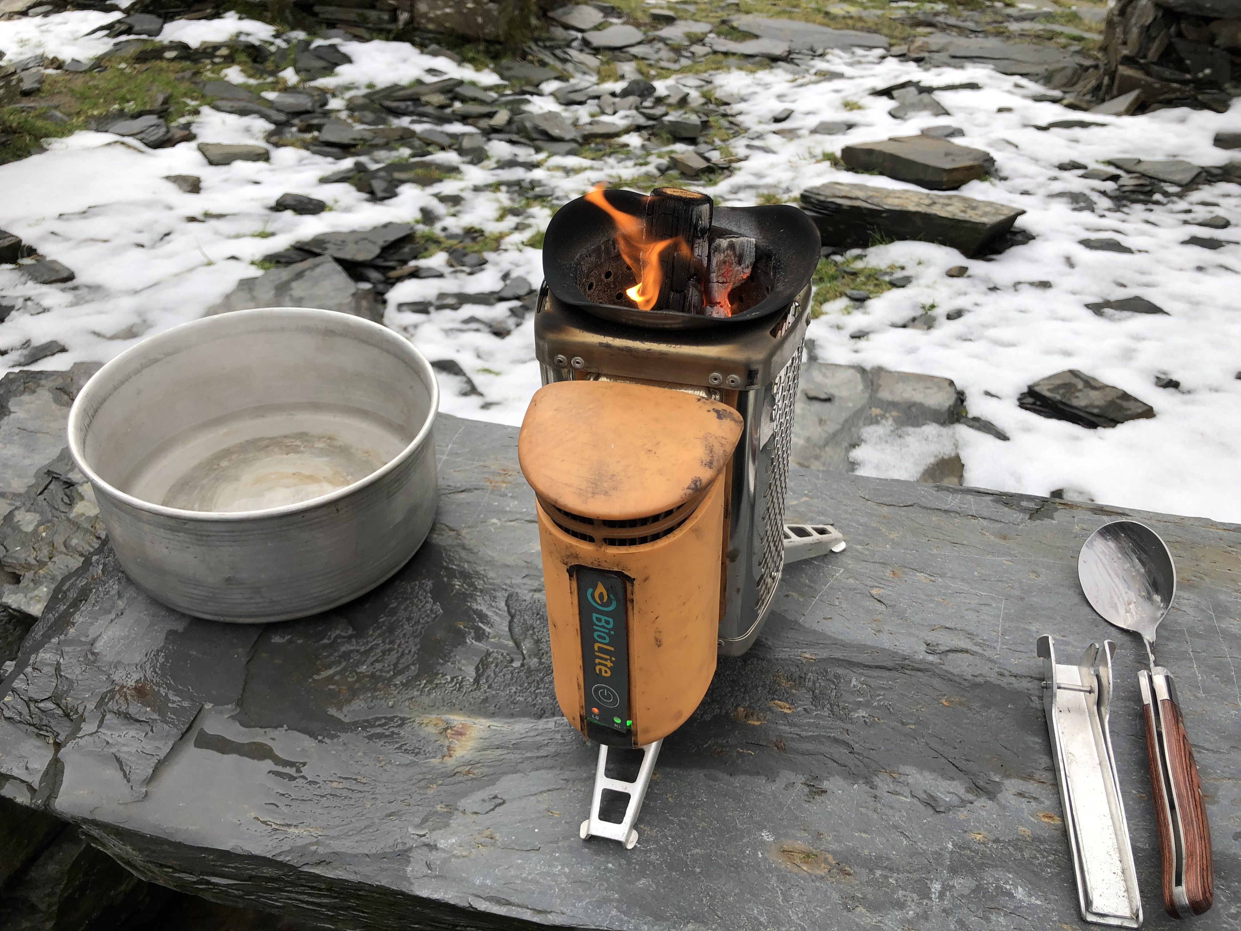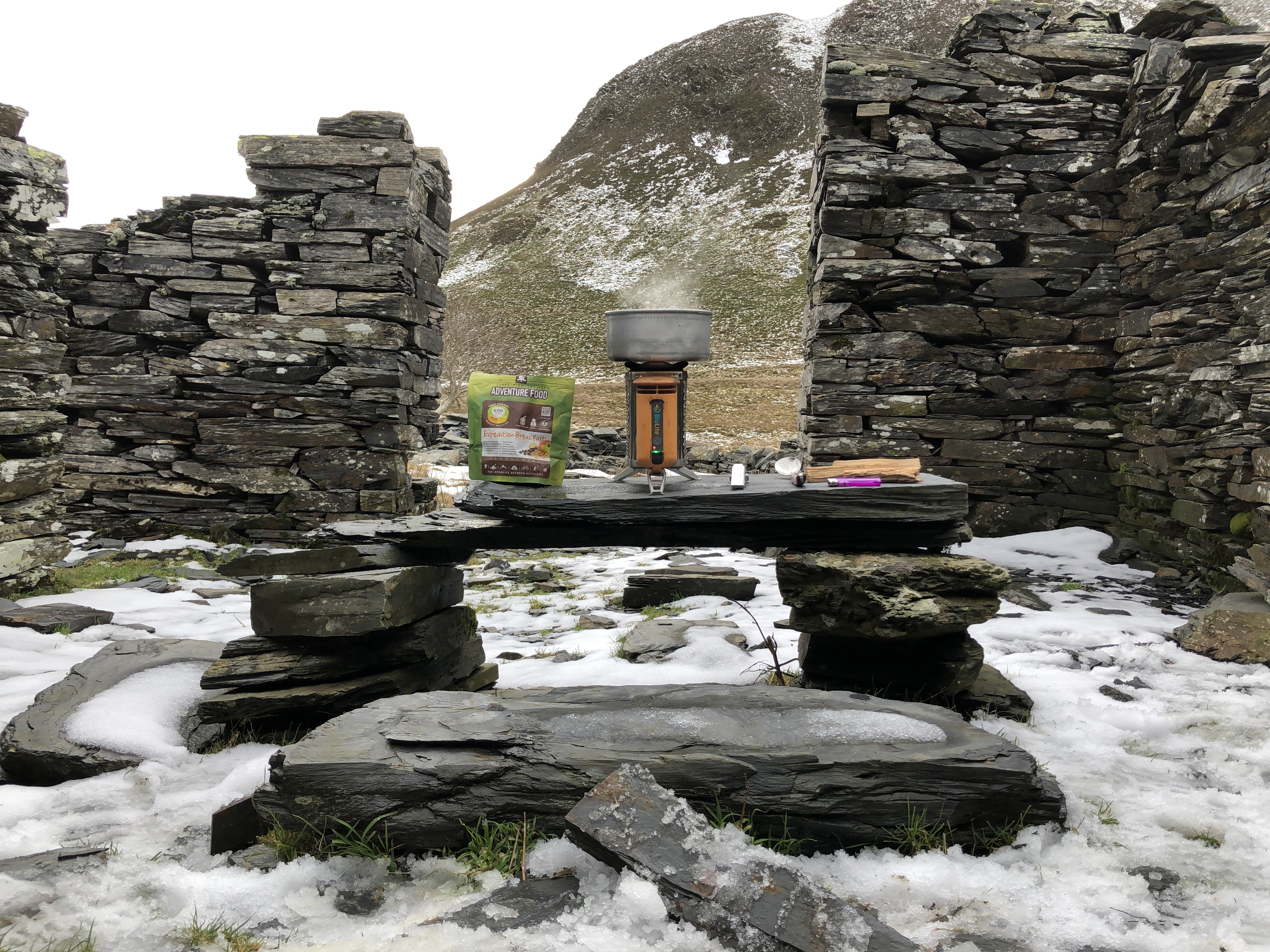 I decided to utilise one of the old ruins to cook up some food before heading back. There's not much up here that is dry so I'd pre-packed some kiln-dried wood in my rucksack and my Biolite stove which travels with me on every outing.