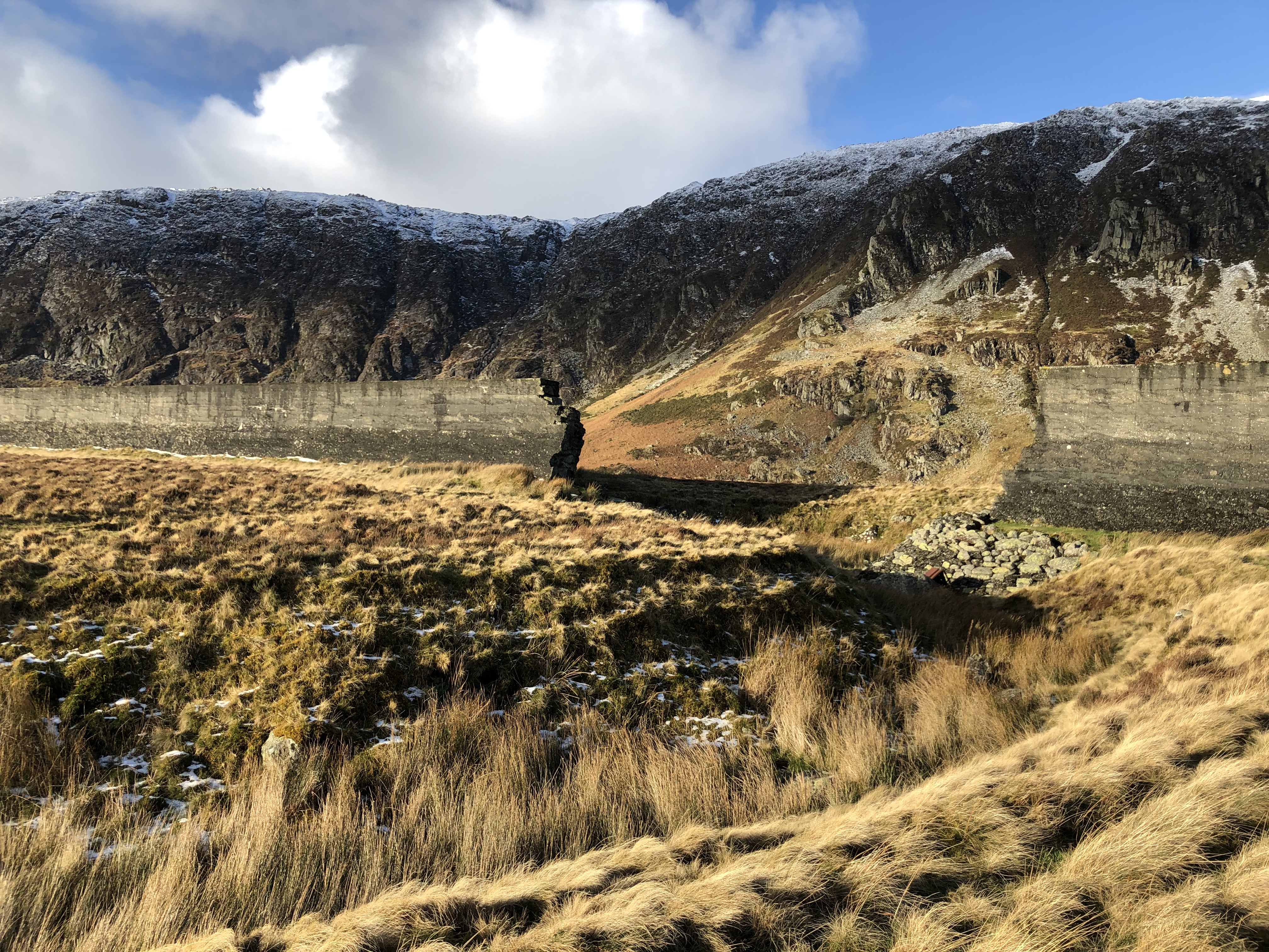 A strong head wind hampered my pace but it was nice to feel some sunshine on my cheeks as I dodged deep puddles along the 4x4 track, leading me to the wall of the infamous Eigiau dam.