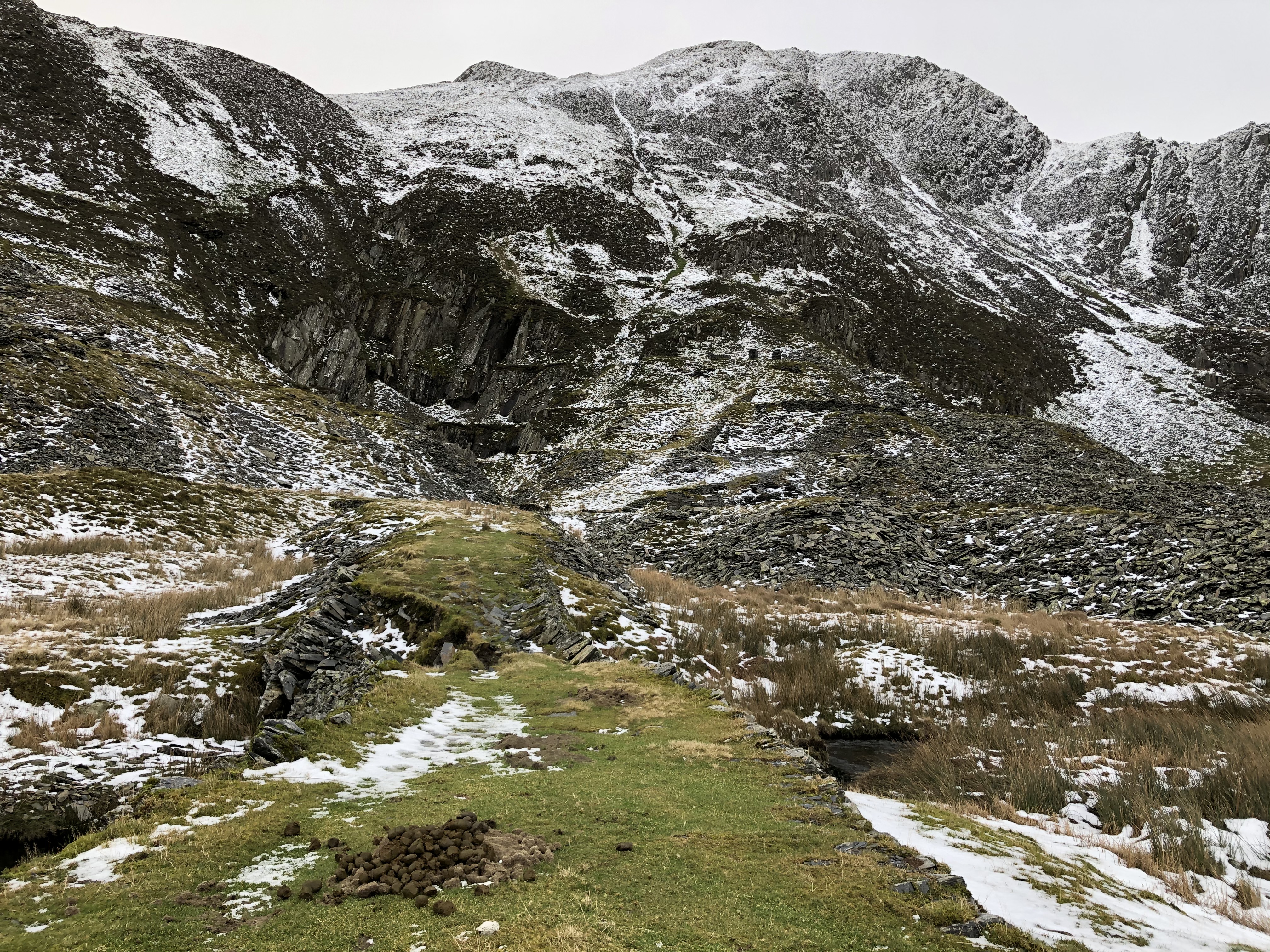 Locating a grassy route over the water I approached what looked like an area that had been heavily mined. An ugly black scar on the hillside accompanied by an equally ugly spoil tip provoked me to imagine what it looked like before it was ravaged for its famous Welsh slate.
