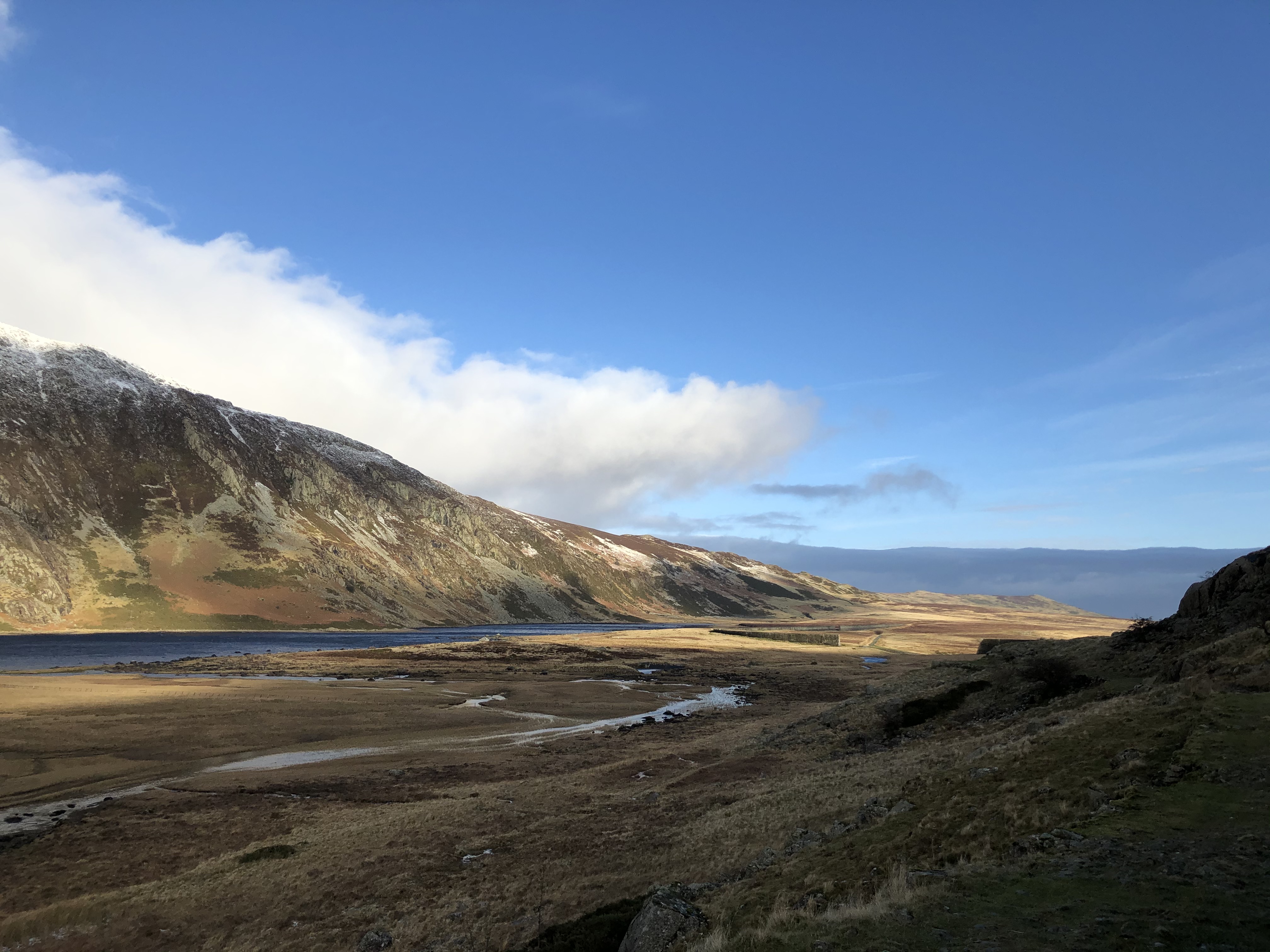 Looking back down the valley there were crisp views of Llyn Eigiau under a blue sky. You can see the dam wall at the end of the lake with a large portion missing. This was done purposely to prevent any further bursts.