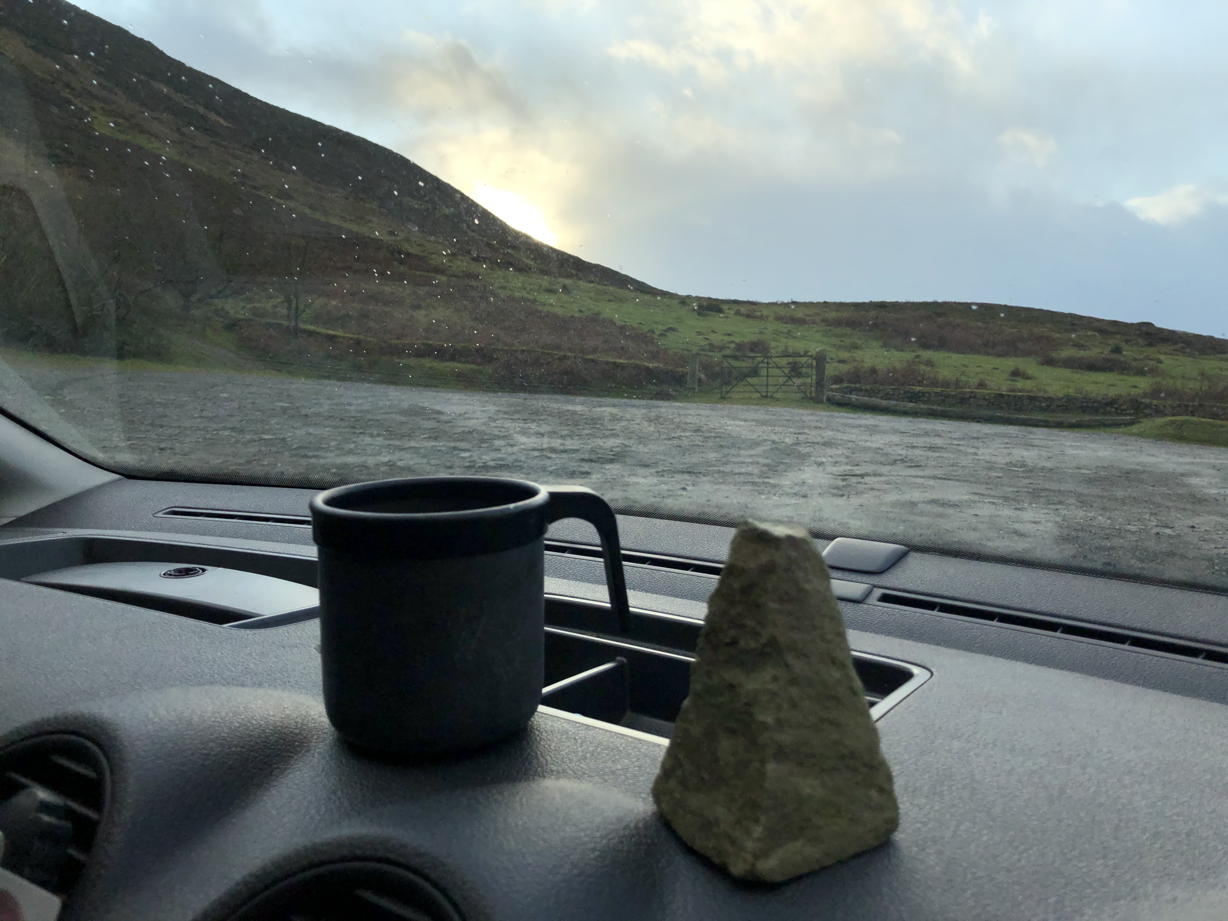 I treated myself to hot cup of coffee from the flask once back in the van and paraded an interesting looking rock I'd found, on the dashboard!