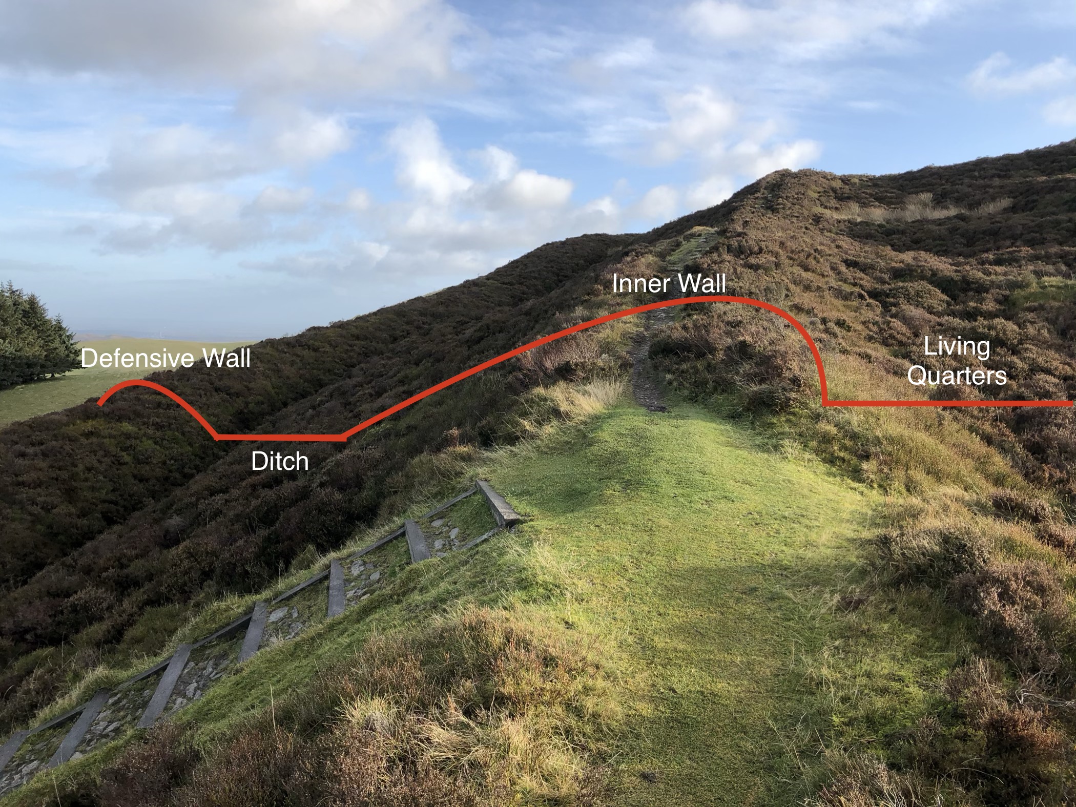 There is a fresh water spring at the top of the hill and the inhabitants of the fort would have had fresh water as well as security. There are some remains of the foundation stones of circular huts where people would have lived and kept animals behind the safety of the walls.