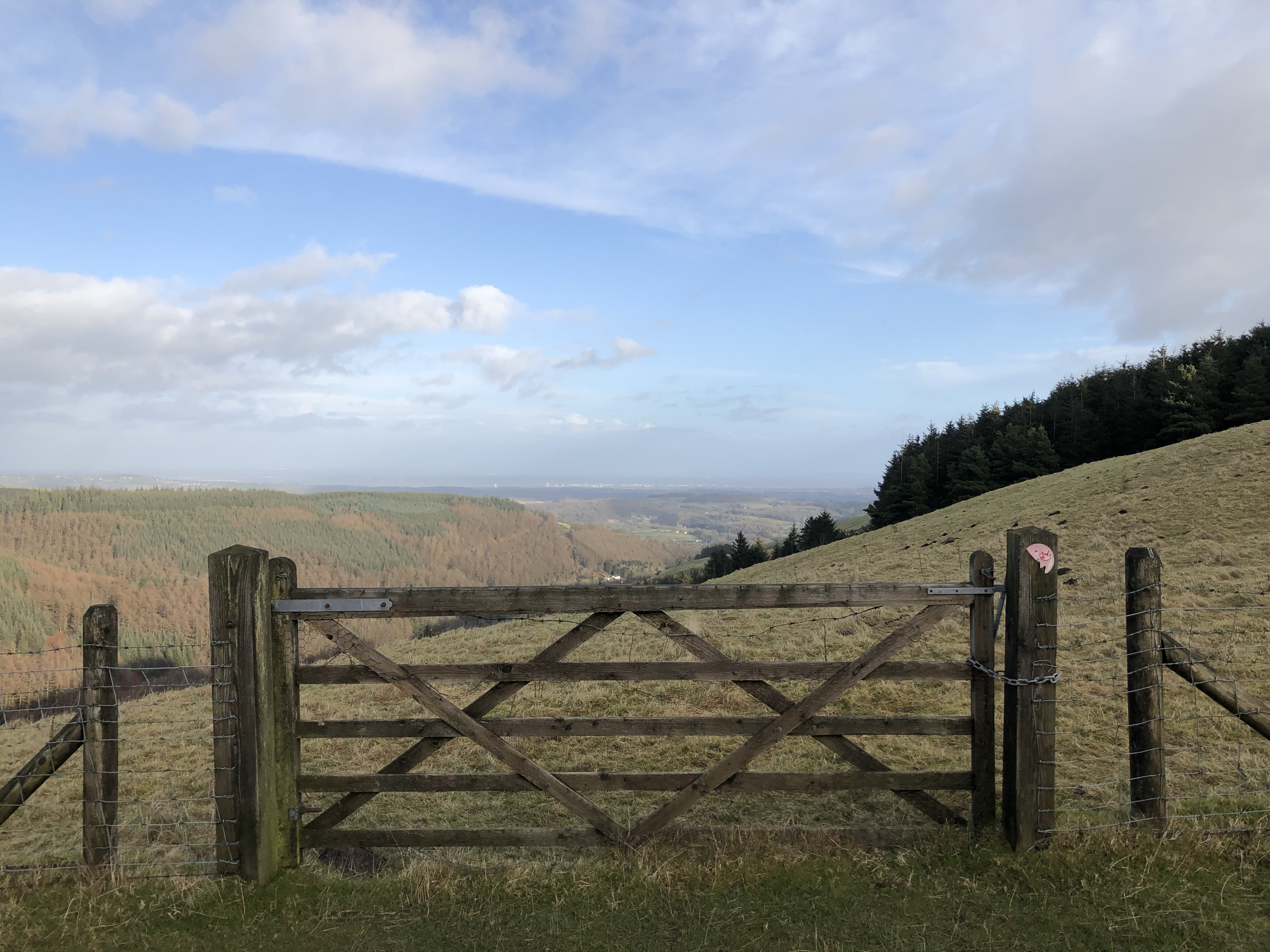 A lot of Welsh hills have weird, pointless gates with amazing views behind them. About two thirds of the way up you will find Moel Fenlli's.