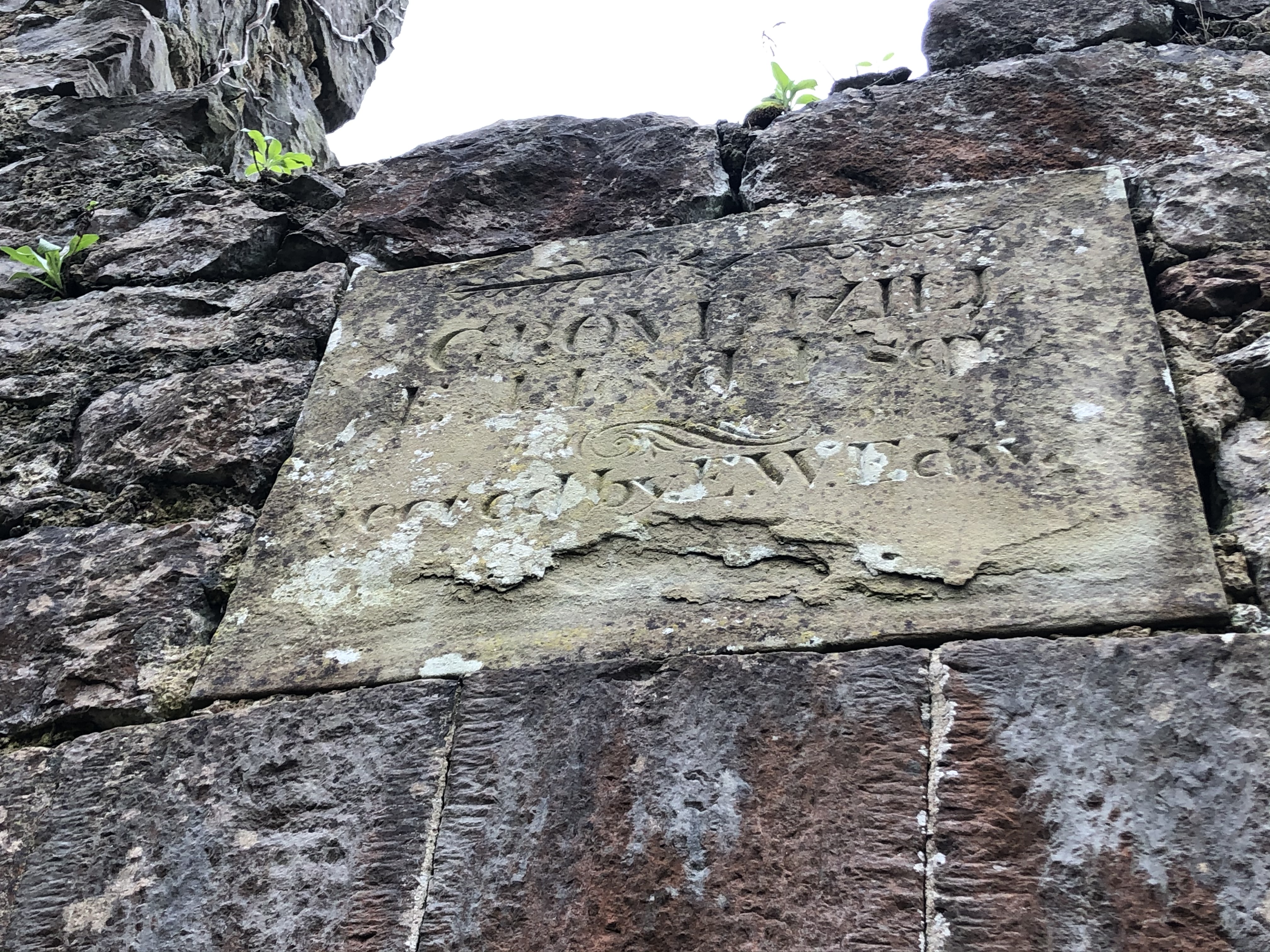 The sandstone block had weathered a fair bit and the bottom part had long flaked off. We couldn't find a date but managed to read out: