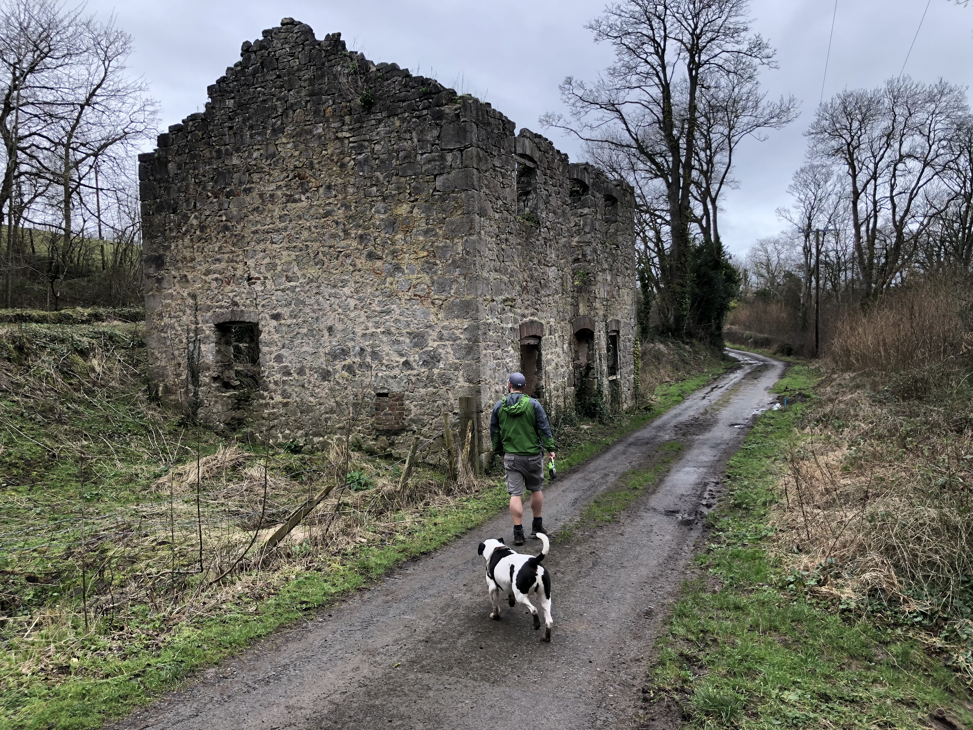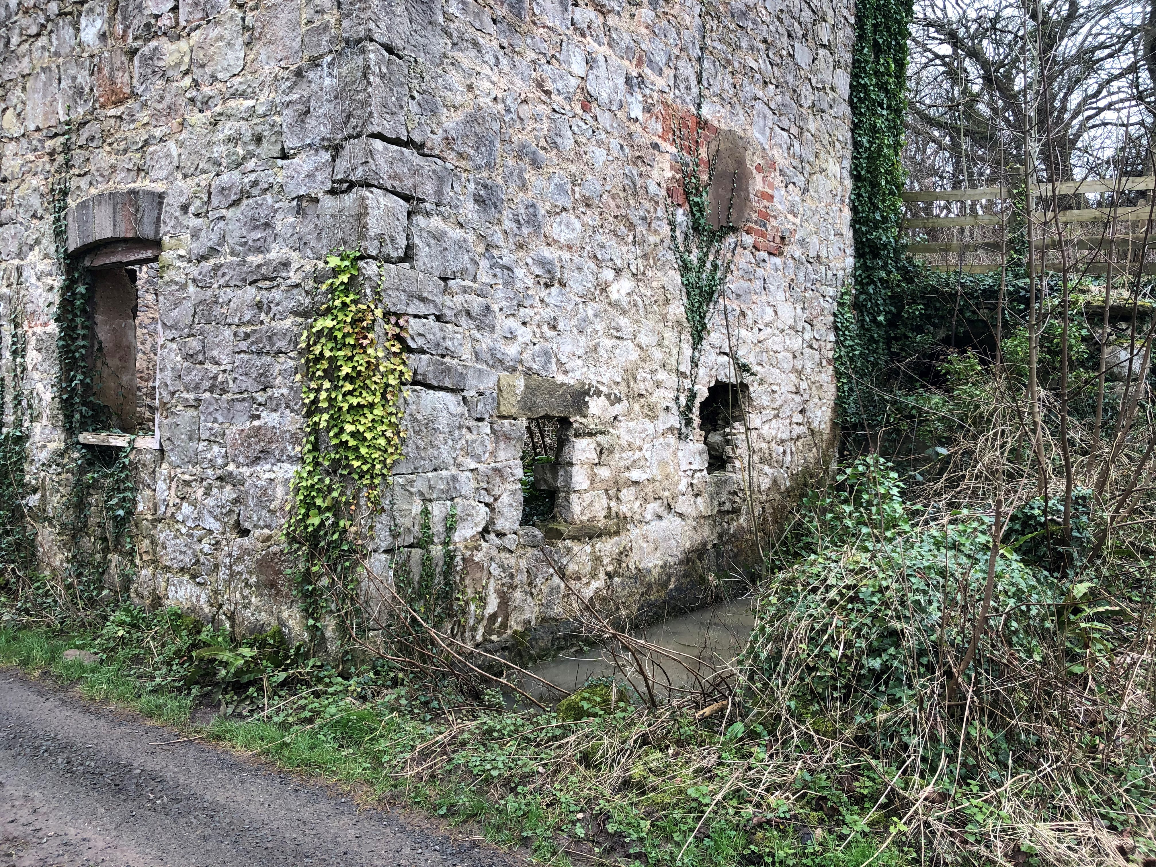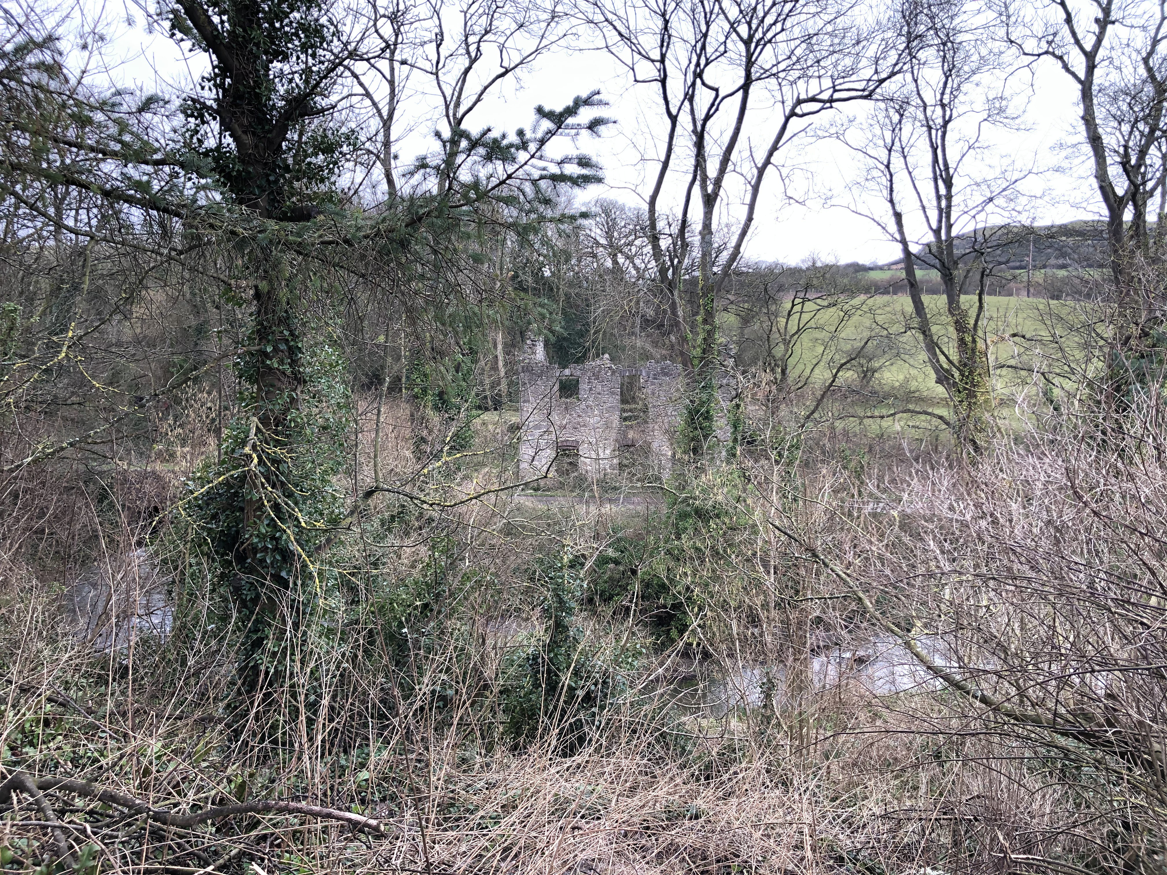 Entering some woods with the sound of a stream coming into ear-shot, we noticed the shell of old building peering through the bare-naked branches.