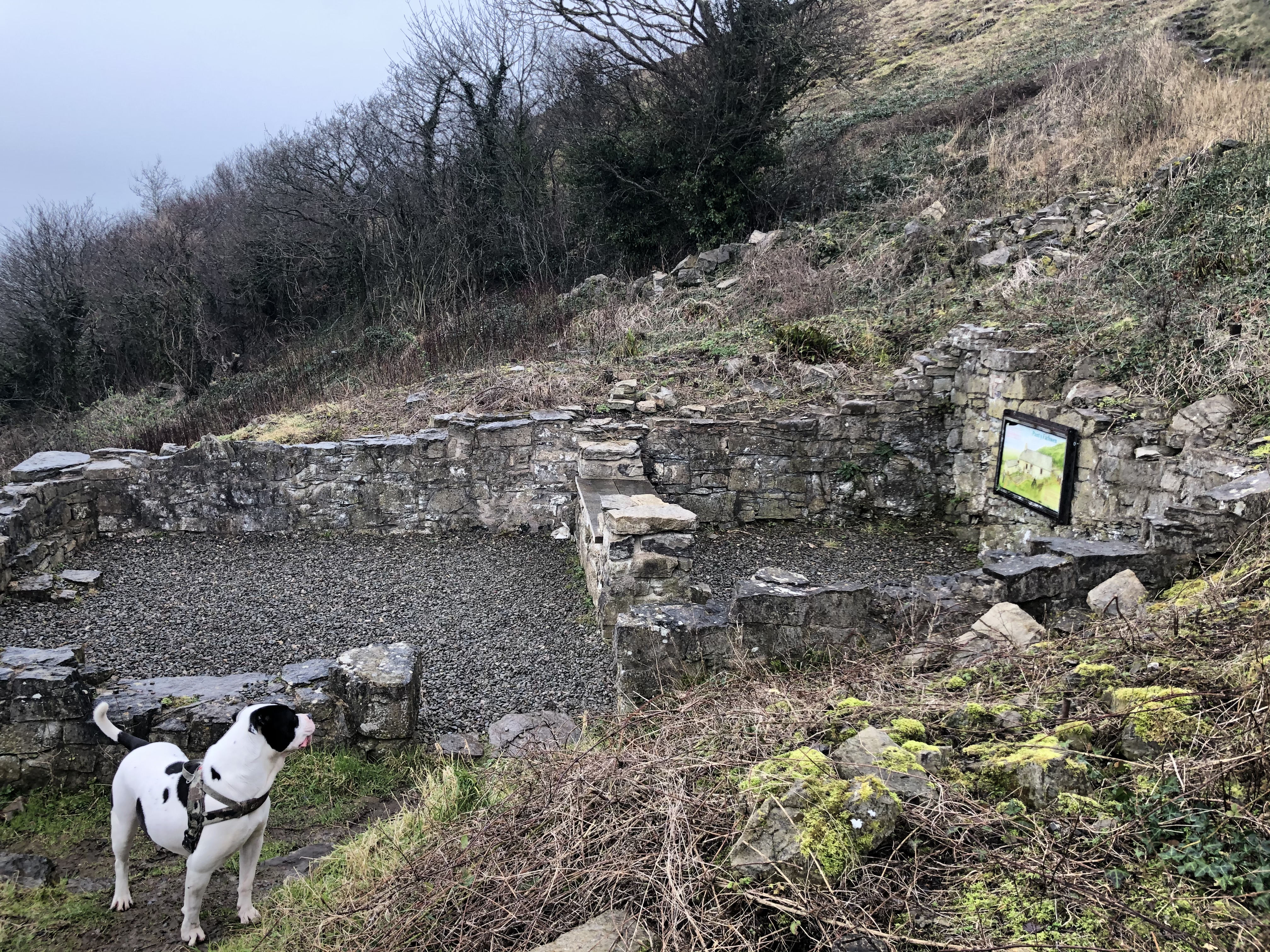 Patch, my friends fine animal, determined to photobomb all of my shots is staring at what's left of a two-hundred year old cottage on the hillside. The small dwelling was once home to a married couple and their nine children!