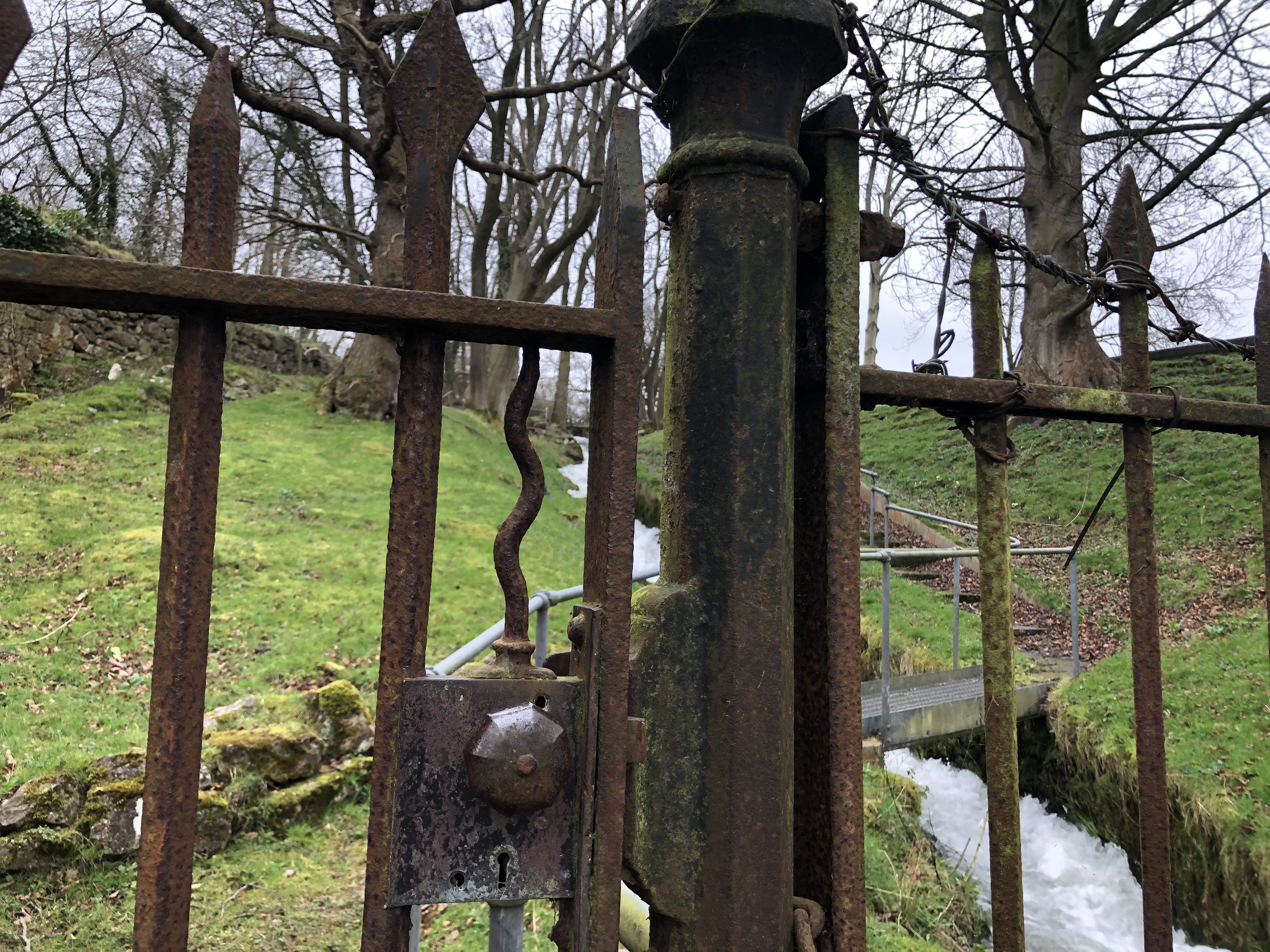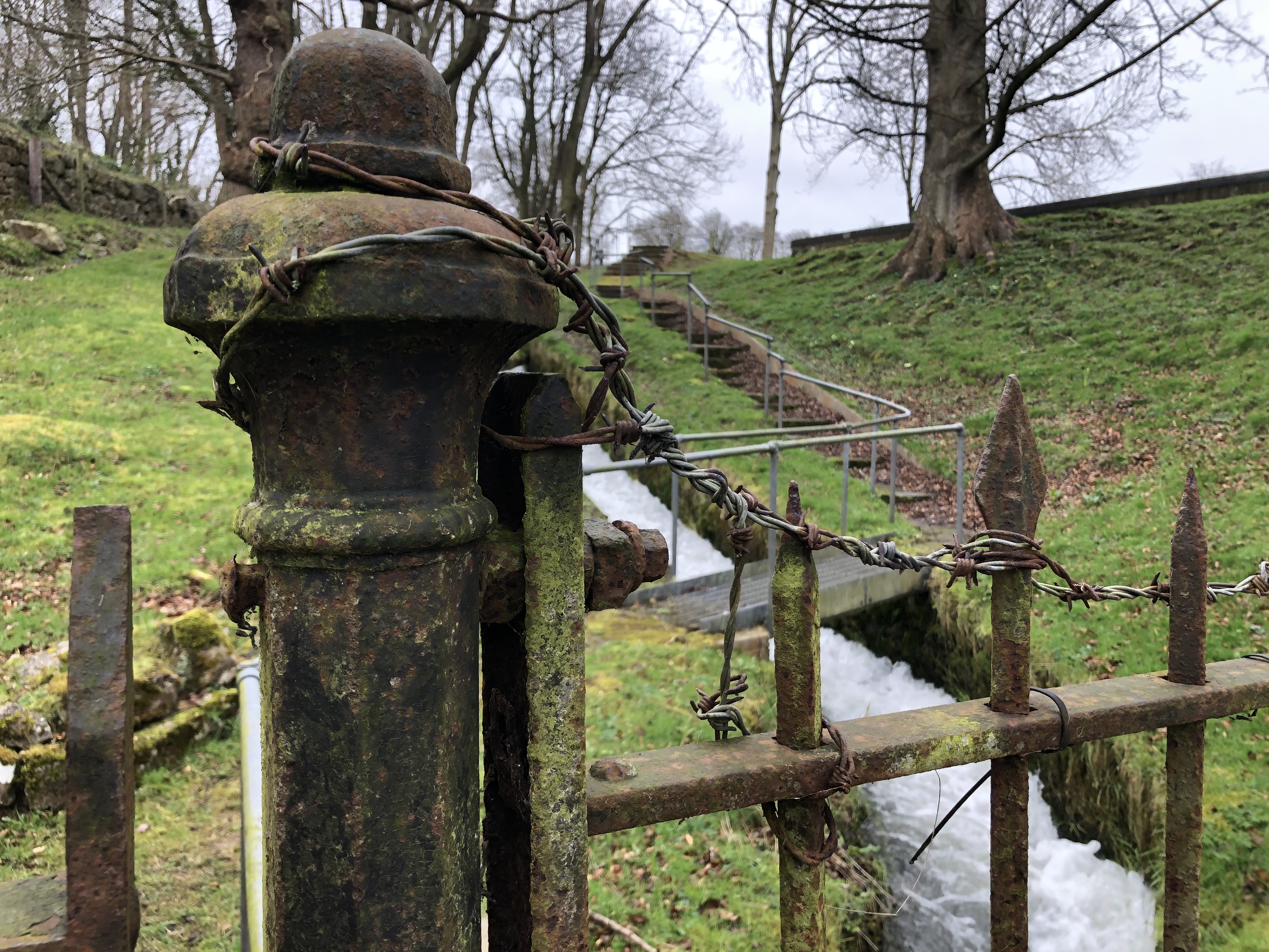 Just around the corner and up a small hill, close to a farmer feeding some new born lambs, was another old watermill. This one was bigger and still had part of the old wheel visible. It wasn't the wheel that caught my eye though, it was the Adams Familyesque iron gate and fence that separated the path from some fast flowing water ways.