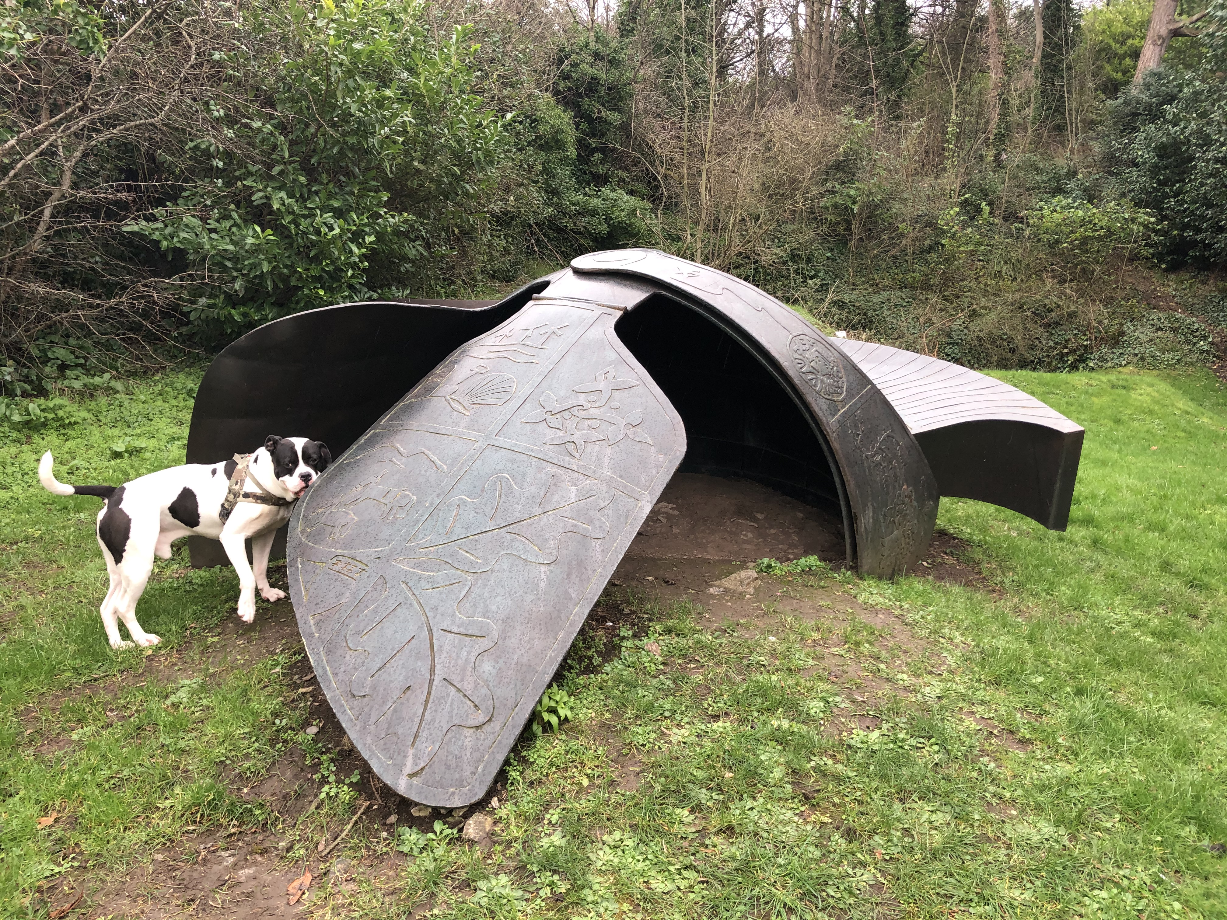 Where our nostalgic road met the junction to the path we needed to follow, plonked on a grass verge was a huge Roman helmet. There had been evidence found of a Roman bath house on the hillside and the artwork had been recently installed to mark the rough location.