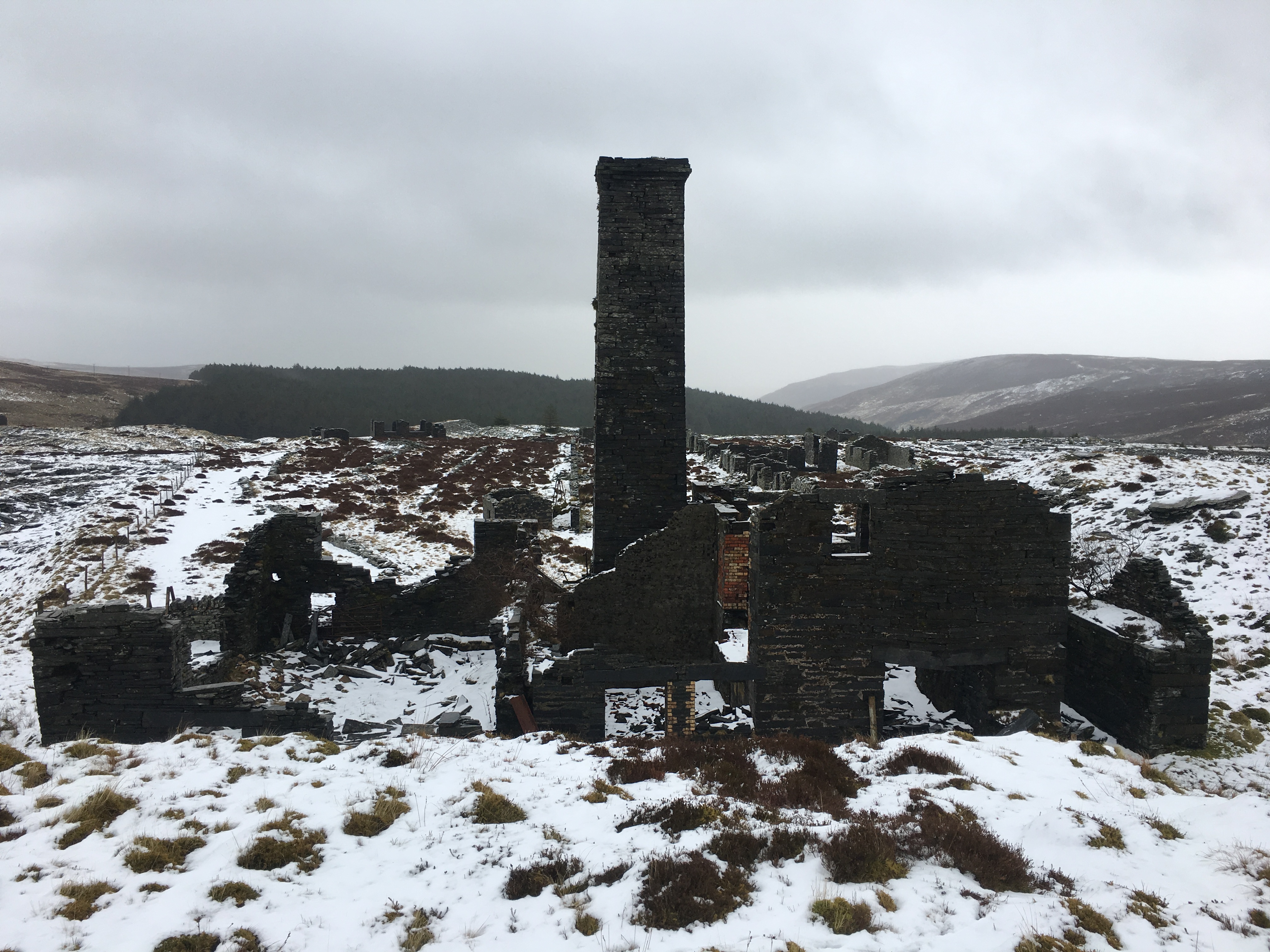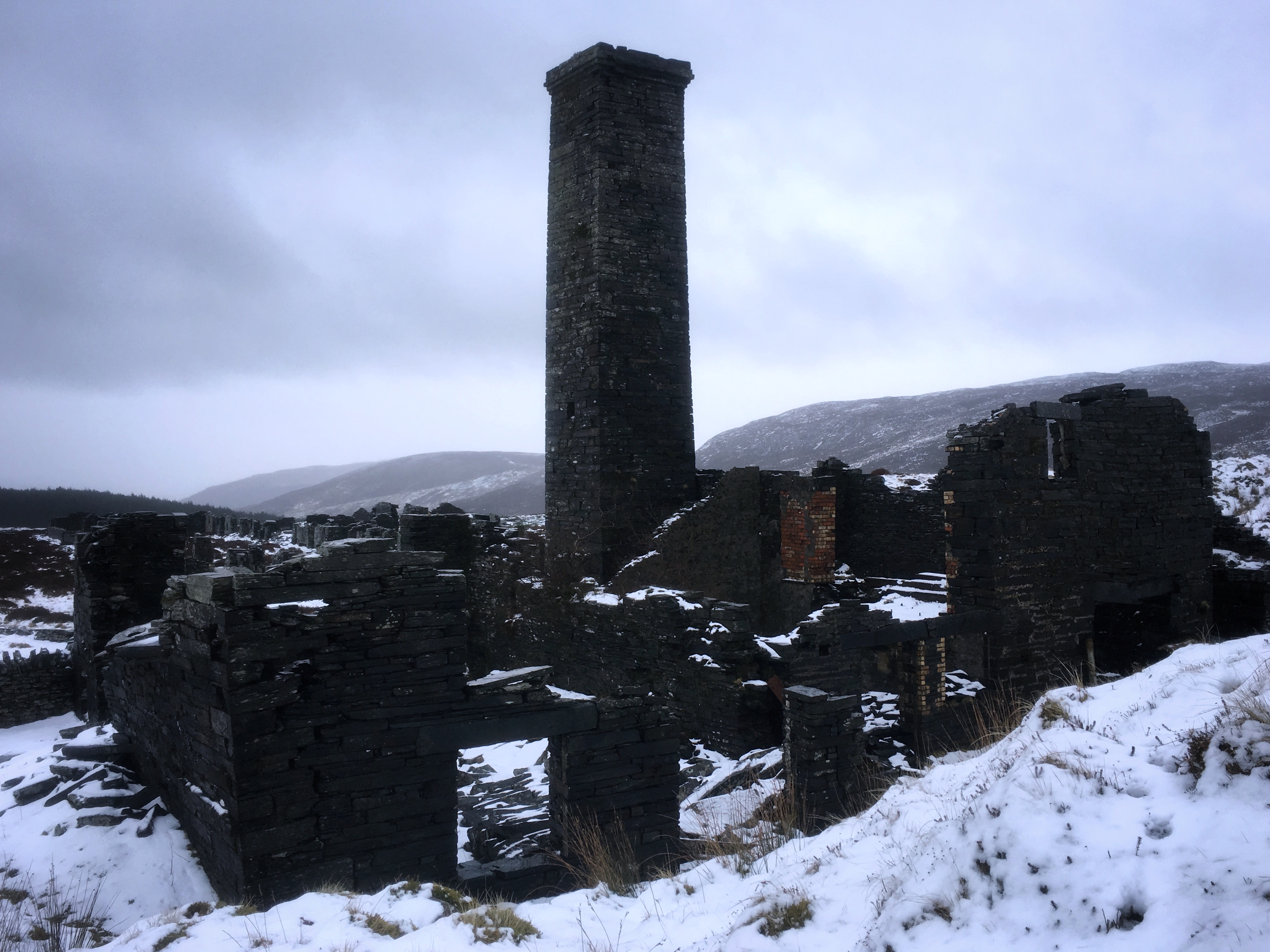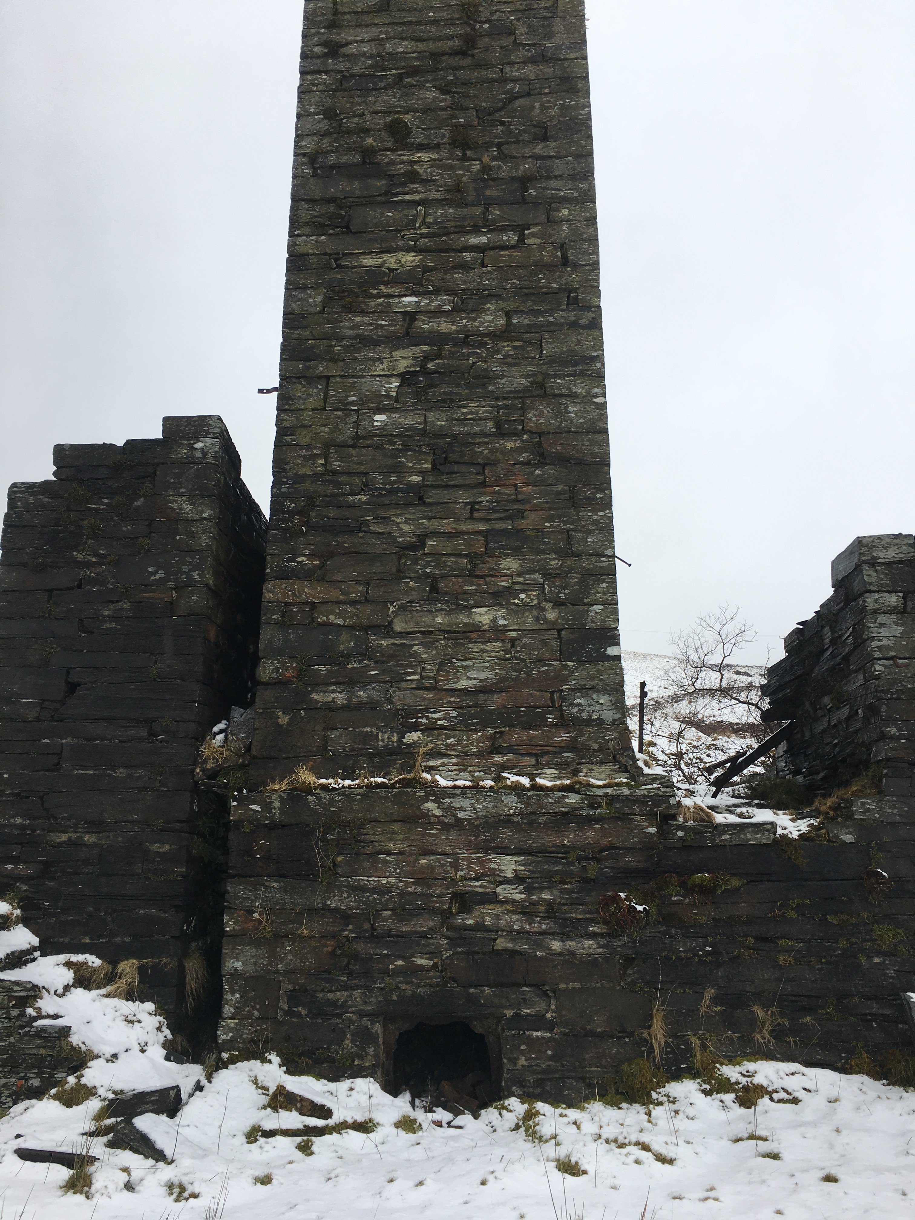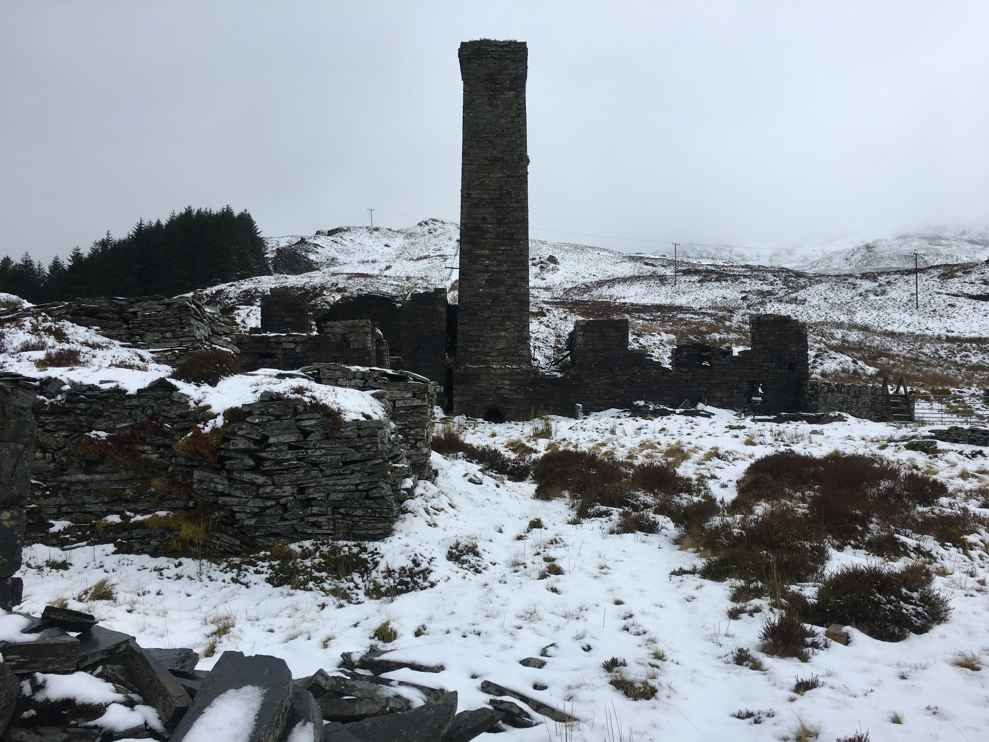 About three hours after leaving the warmth of the car, as we exited a small wooded area, the old mill tower of Rhiwbach quarry came into view, standing out as a black mass on a white background.