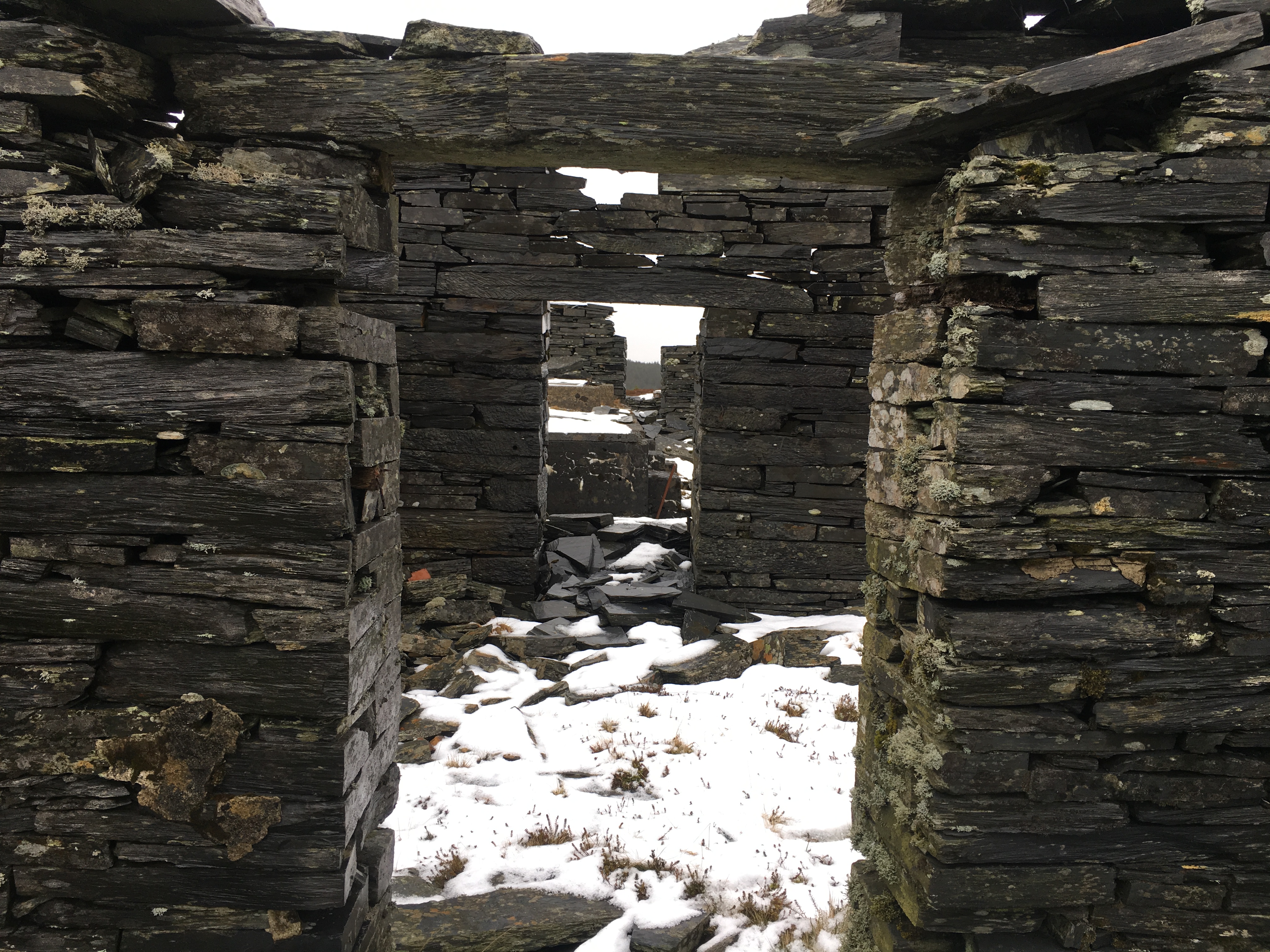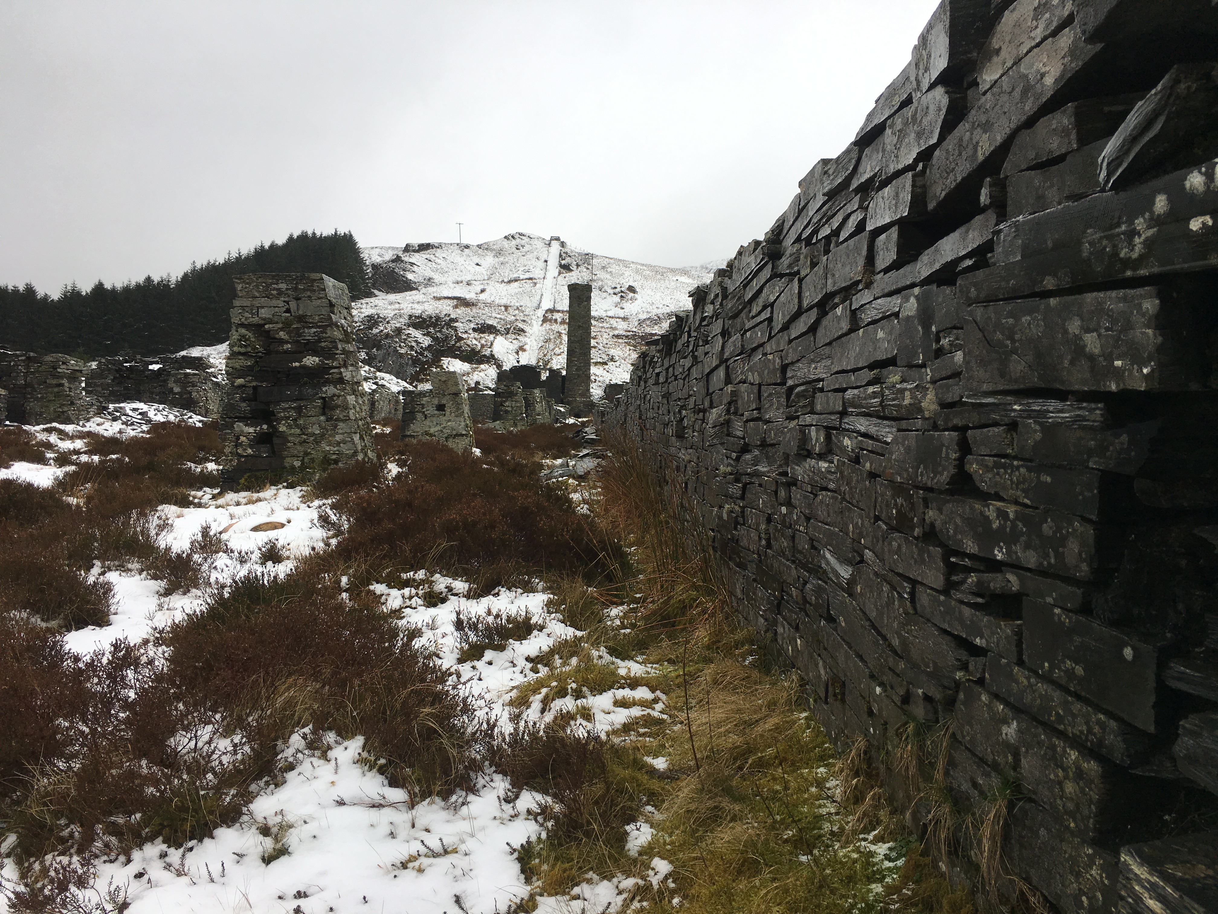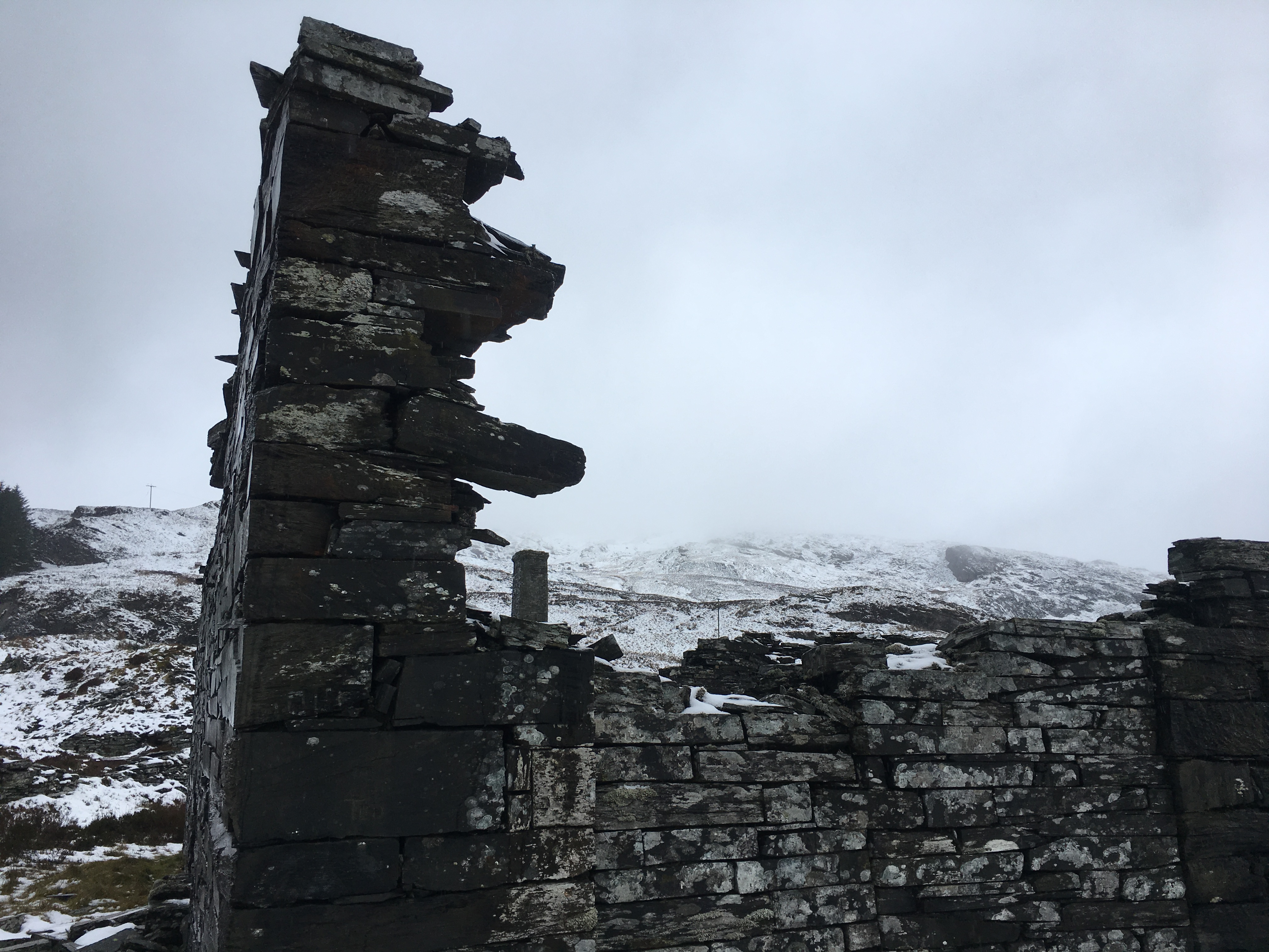 About three hours after leaving the warmth of the car, as we exited a small wooded area, the old mill tower of Rhiwbach quarry came into view, standing out as a black mass on a white background.