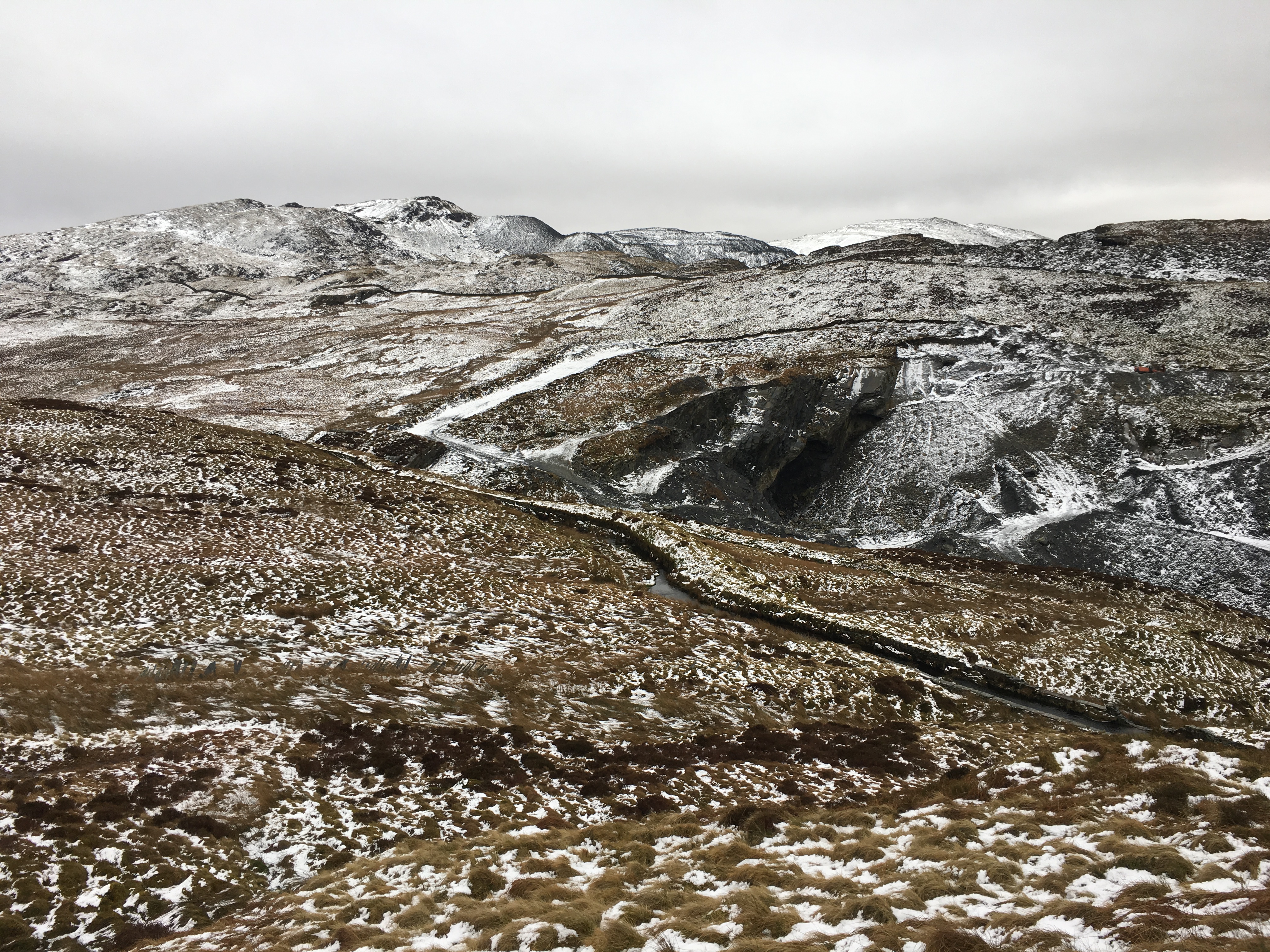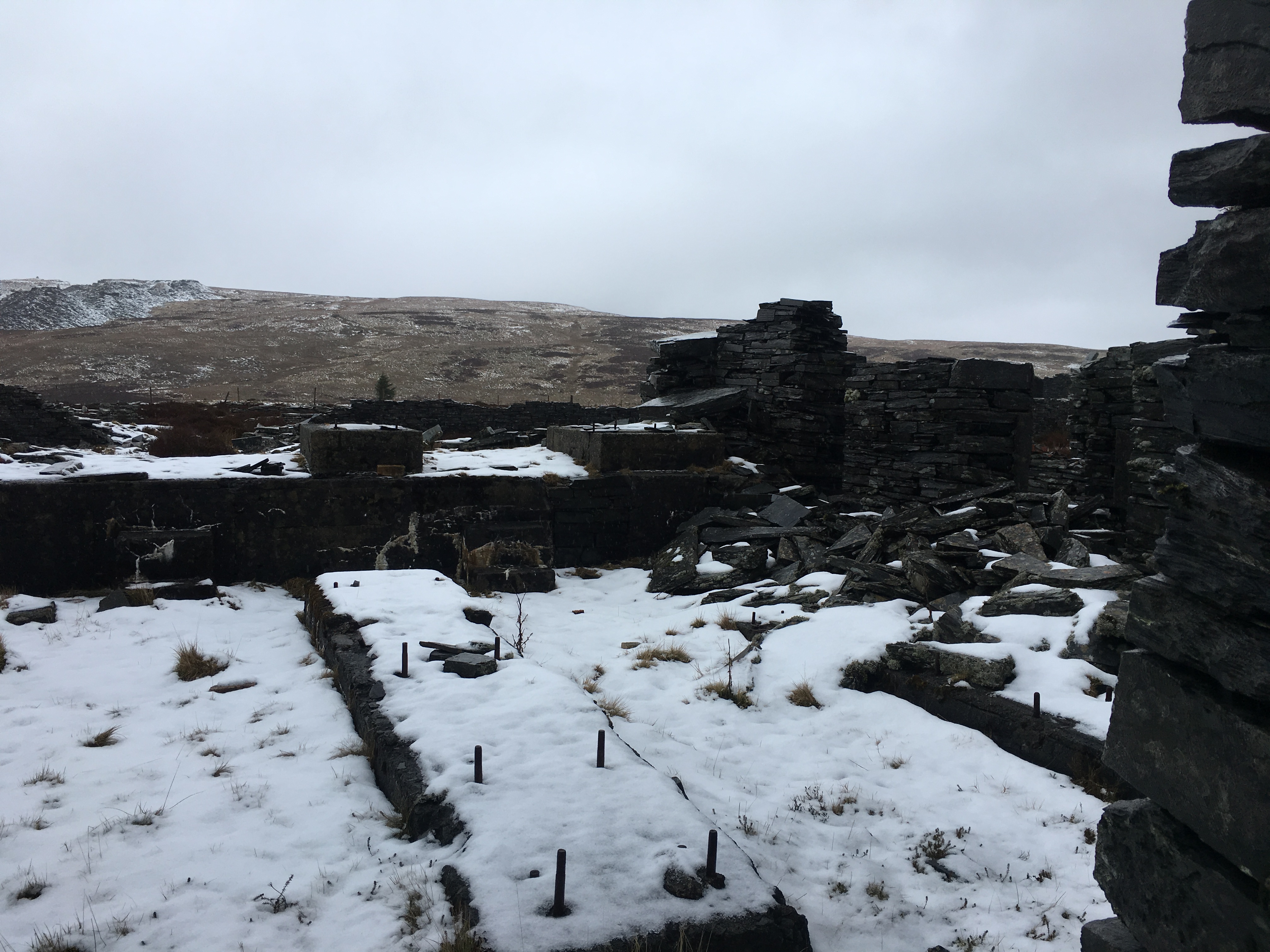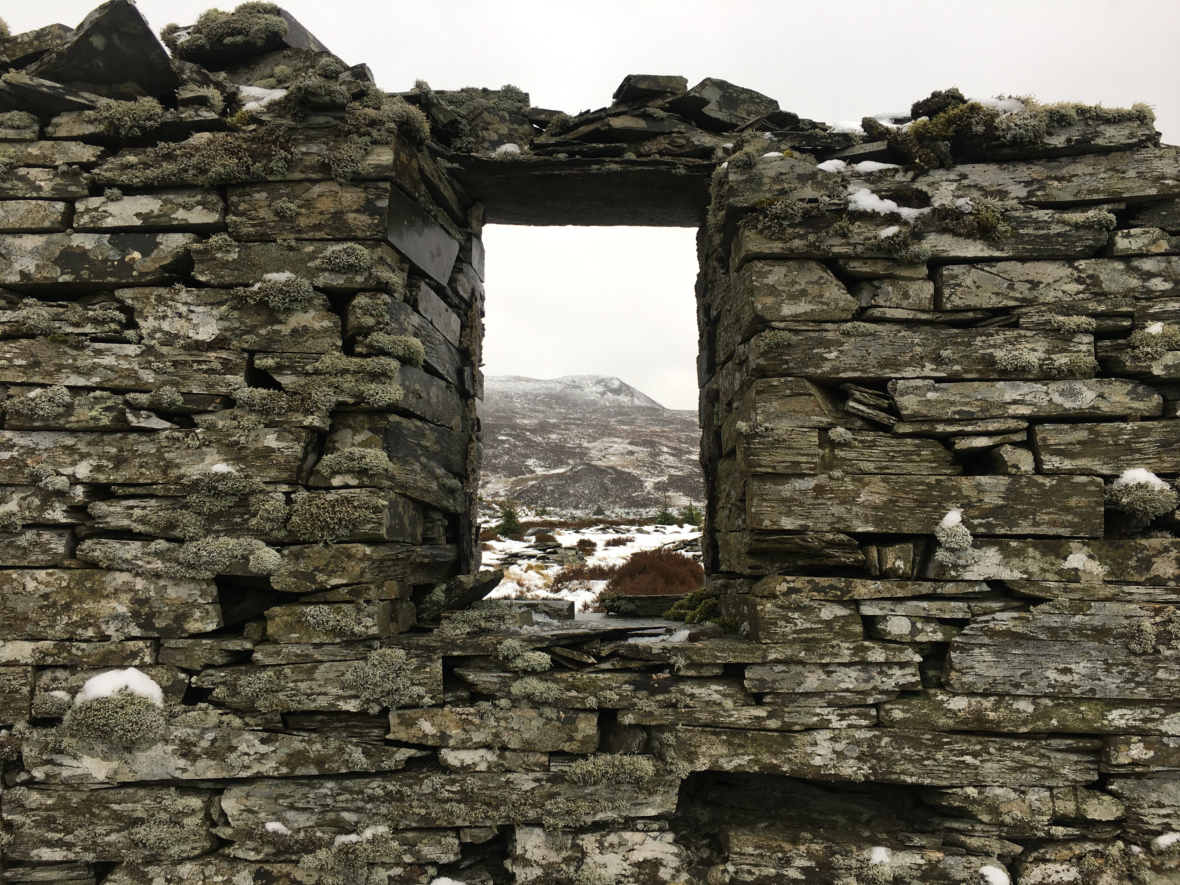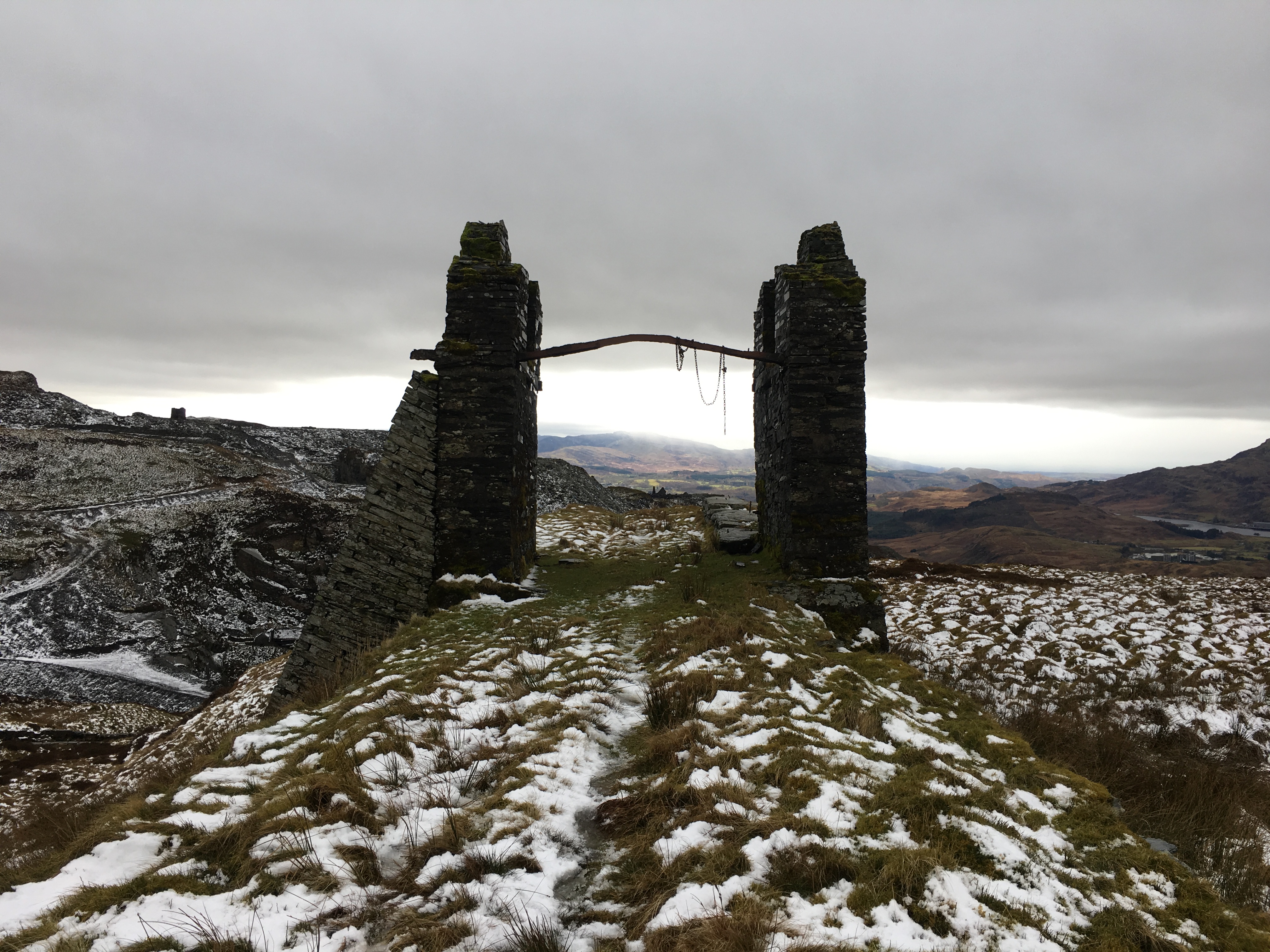 About three hours after leaving the warmth of the car, as we exited a small wooded area, the old mill tower of Rhiwbach quarry came into view, standing out as a black mass on a white background.