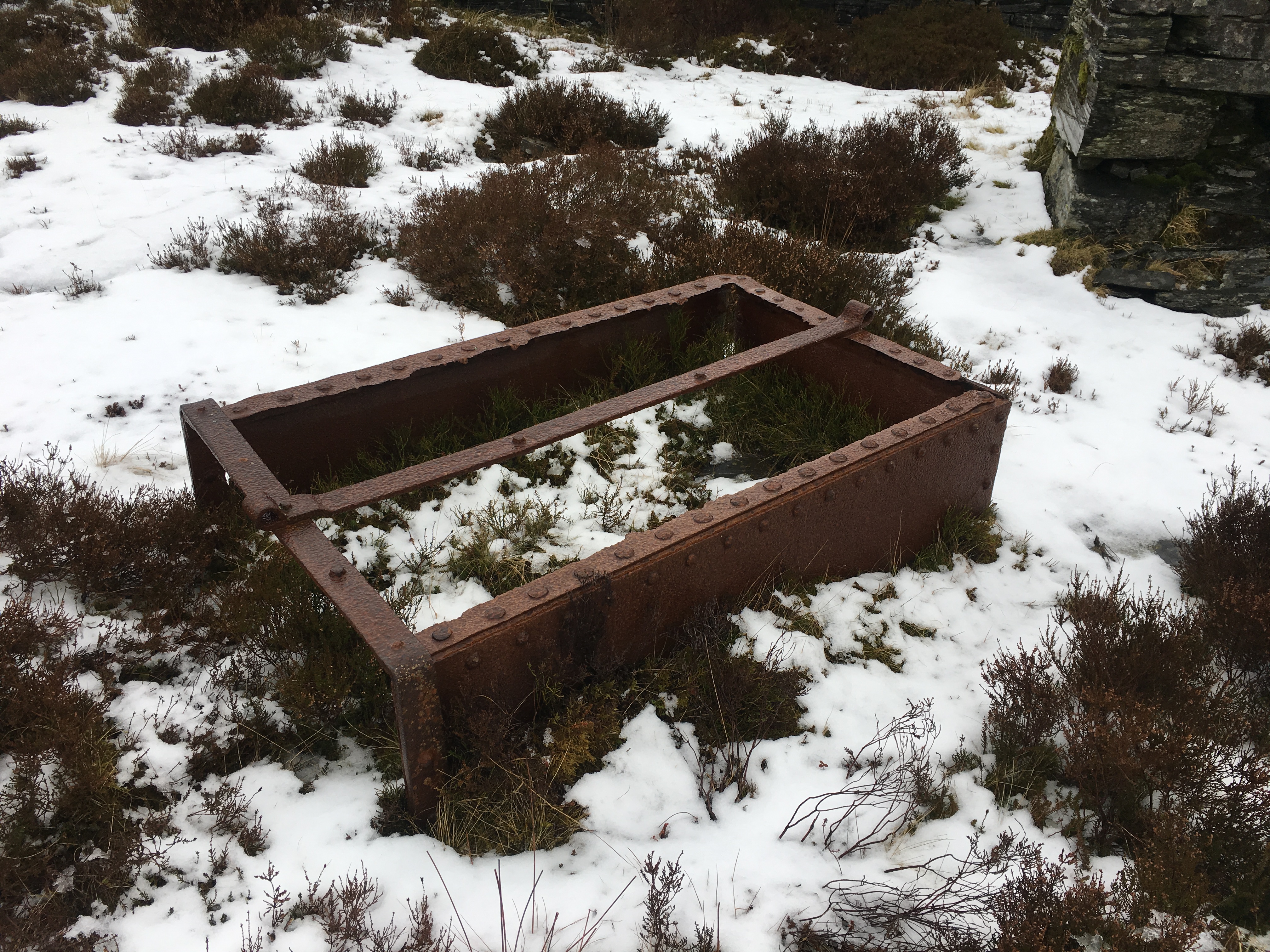 It wasn't long before we came across some evidence, hinting we weren't far away. An old mine cart lay upturned in the snow, wheels salvaged and the rest of it abandoned for nature to reclaim.