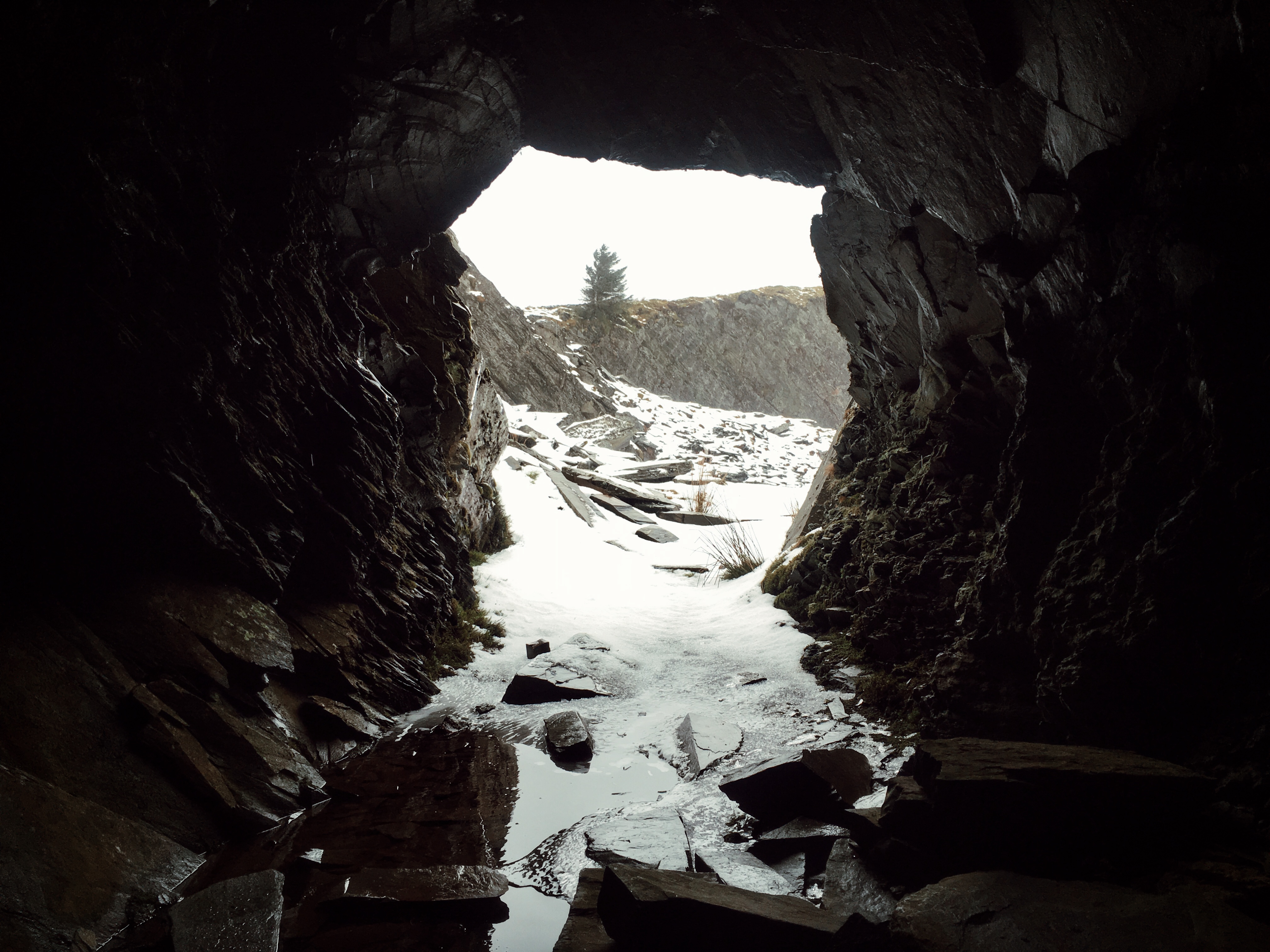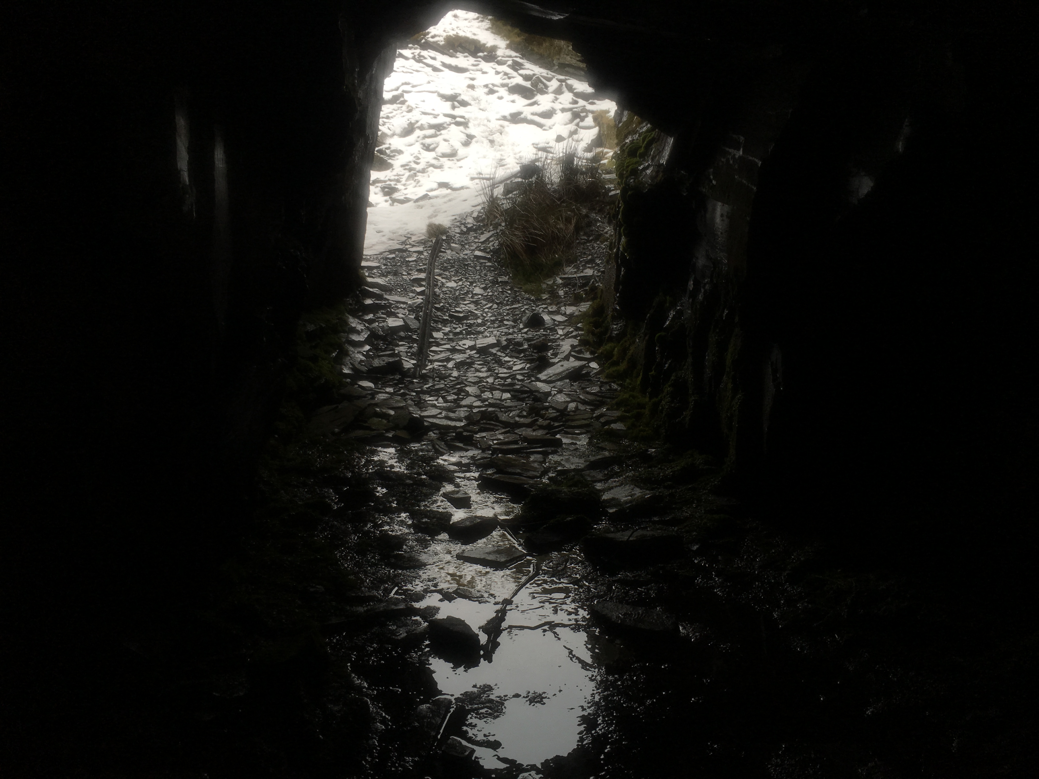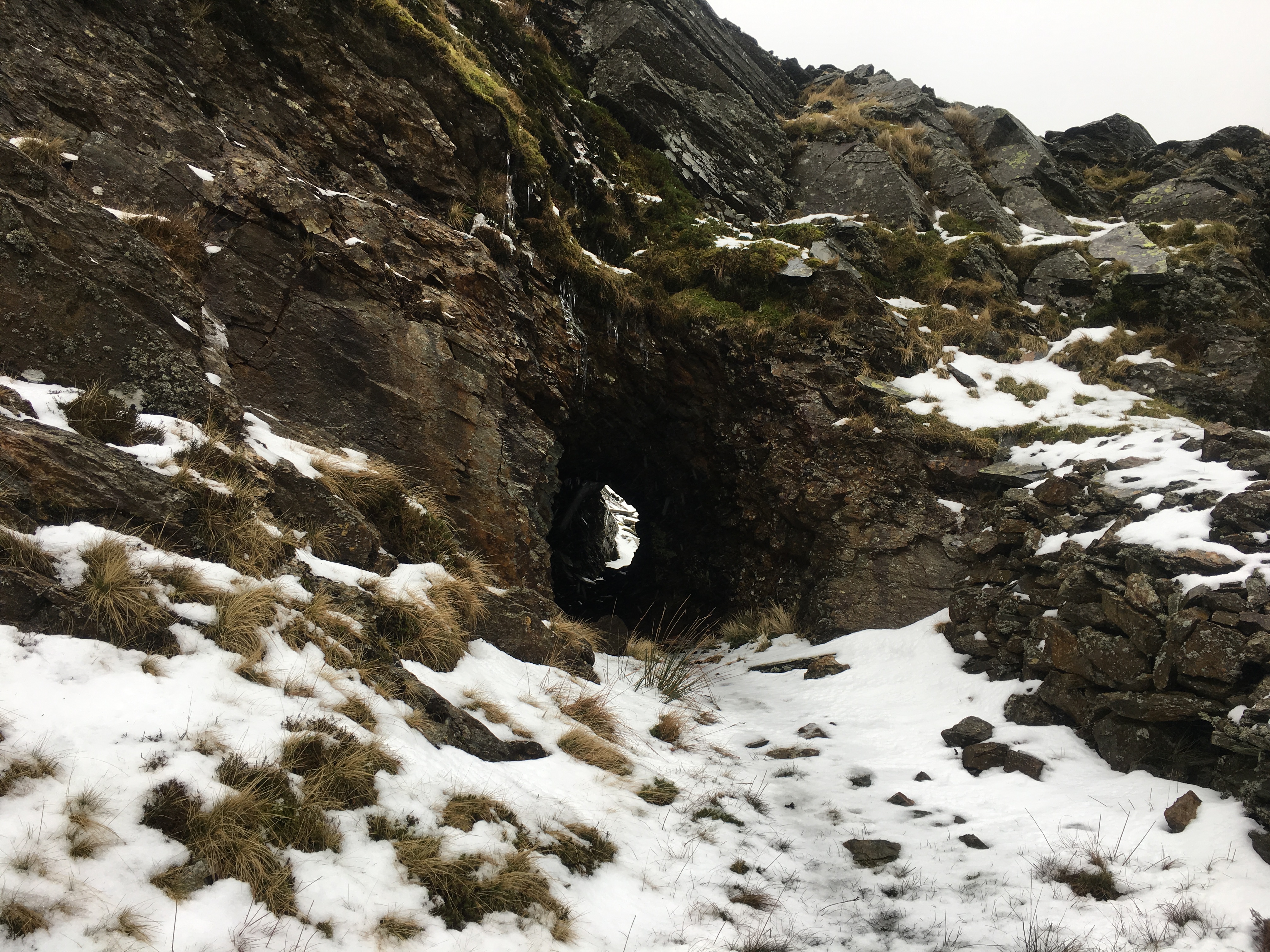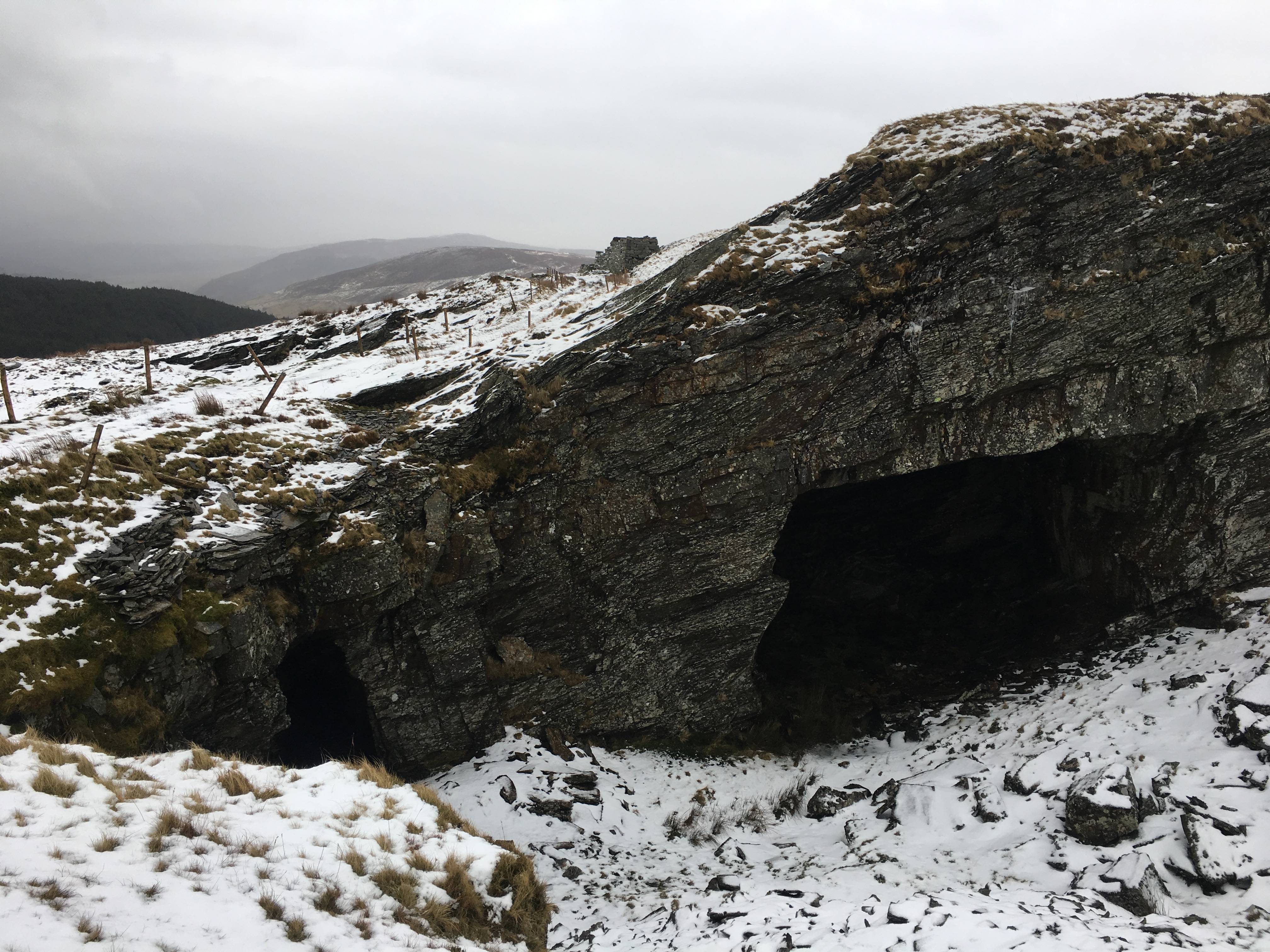 Leaving the village behind, we explored some of the old shafts and blast holes on the surrounding slopes. We came across a huge cave (probably blasted) and scrambled down to check it out. We joked it was the Welsh dragons lair and we were surely done for!