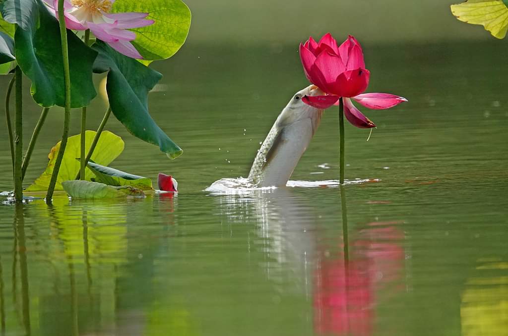 The rare scene of a fish nibbling on lotus flower petals was captured on July 1 at a pond in Shijiazhuang, north China's Hebei Province. #ChinaSeen