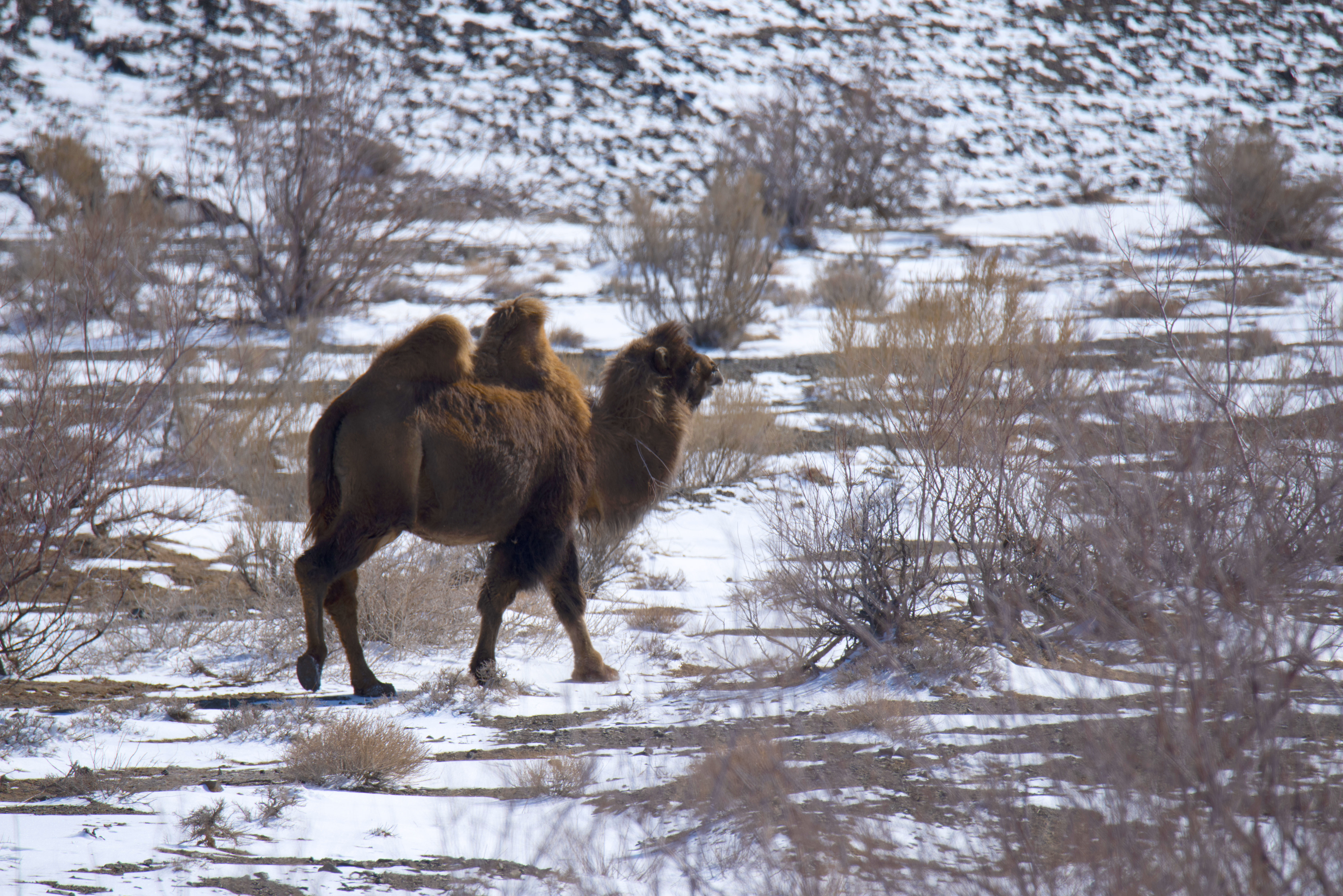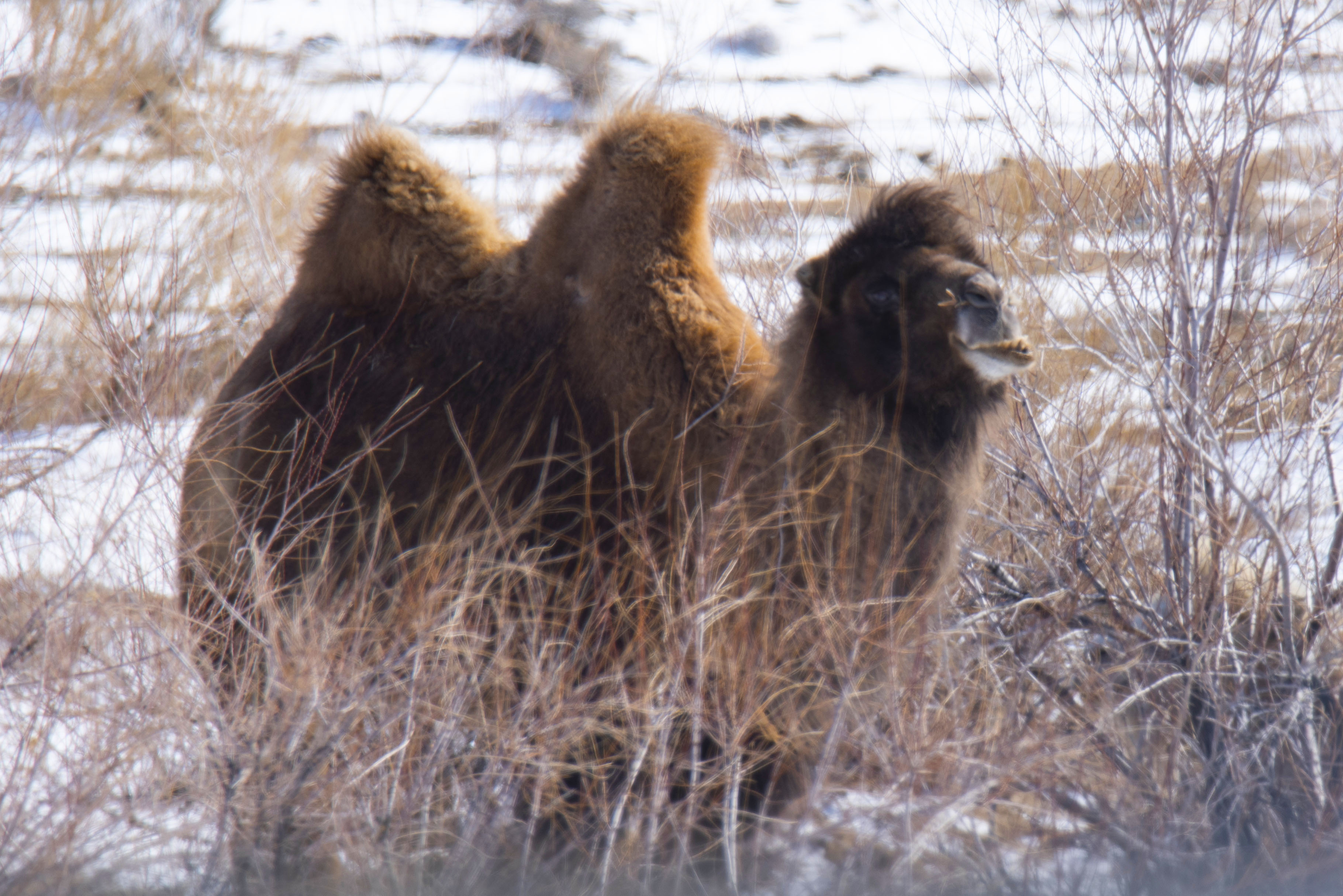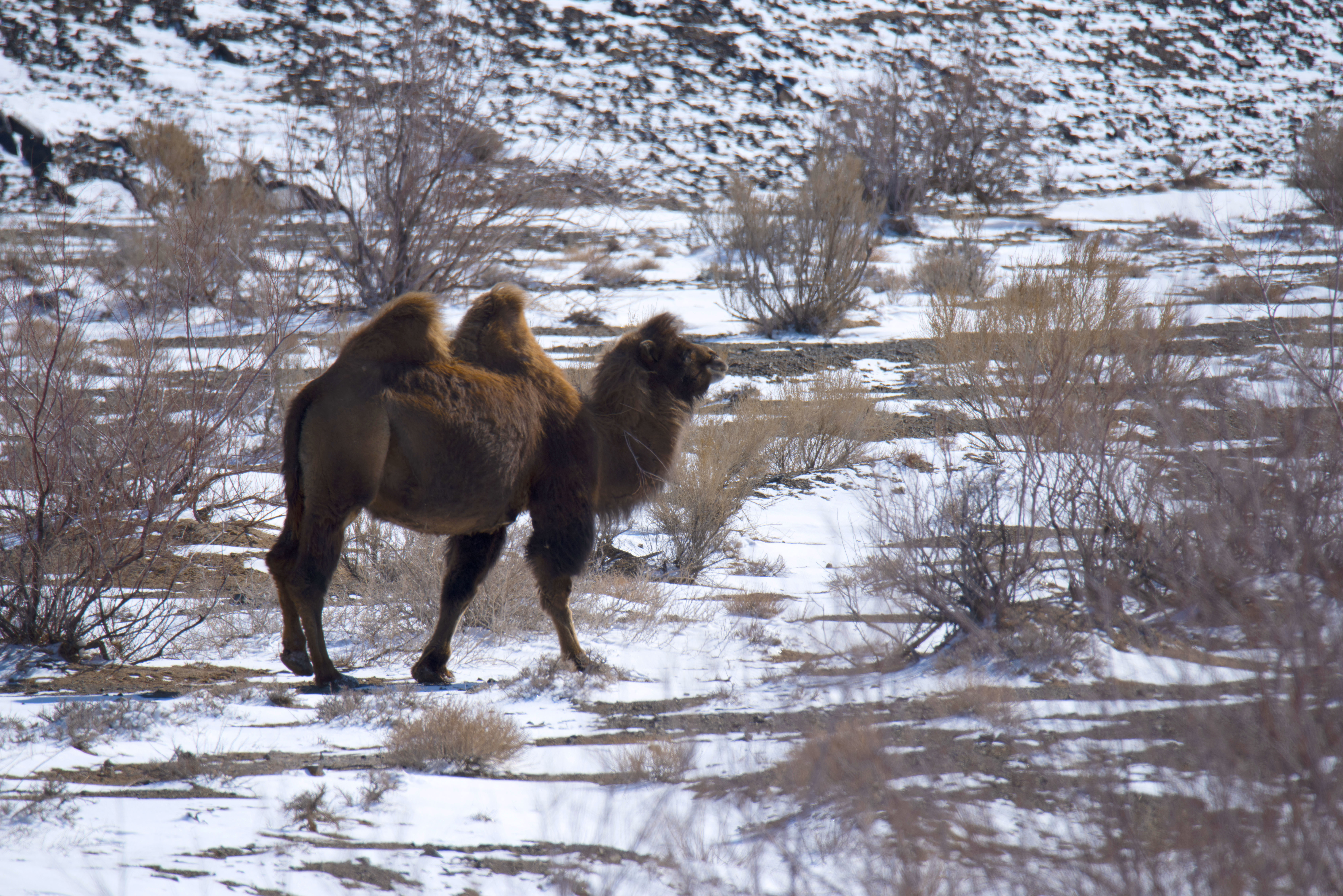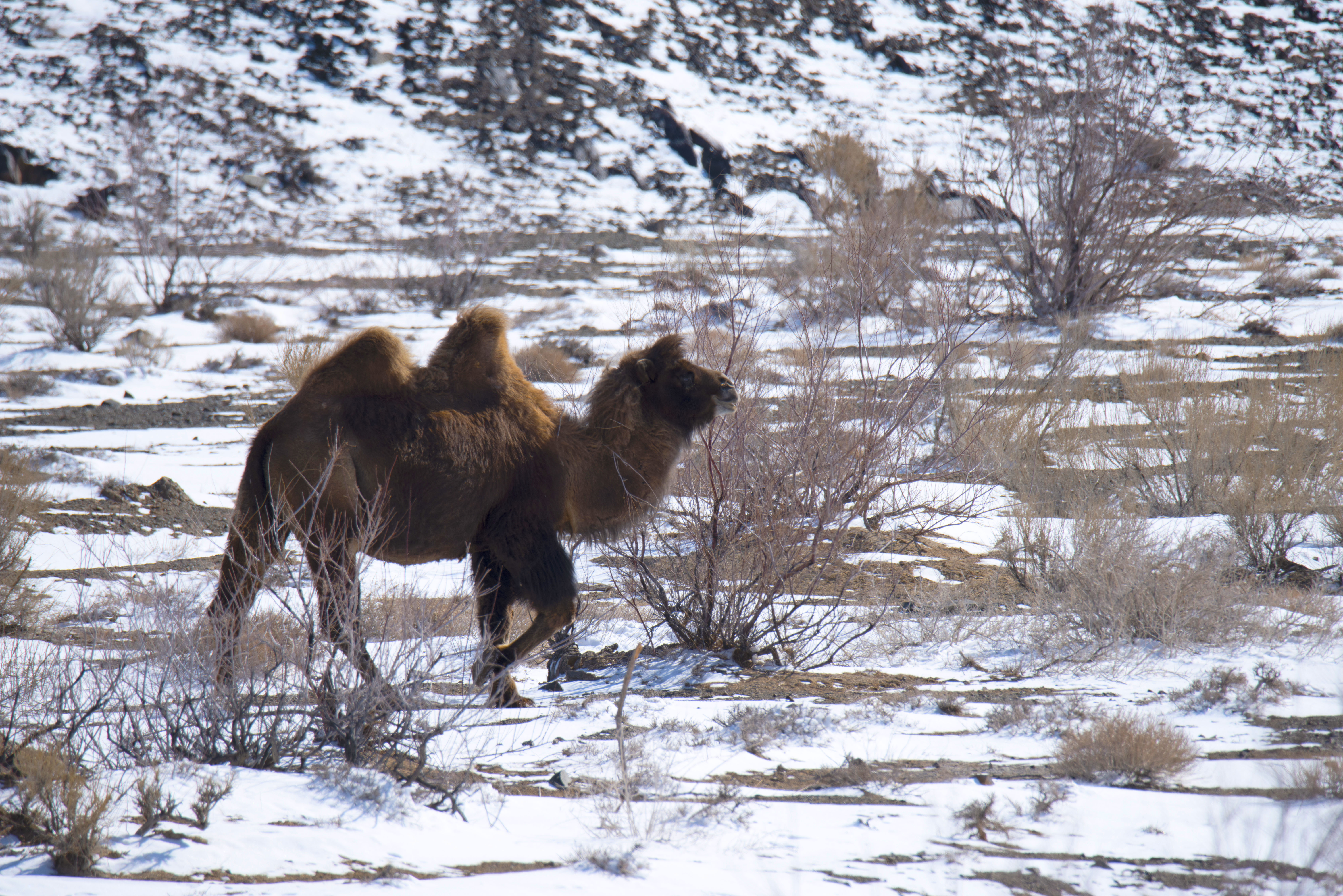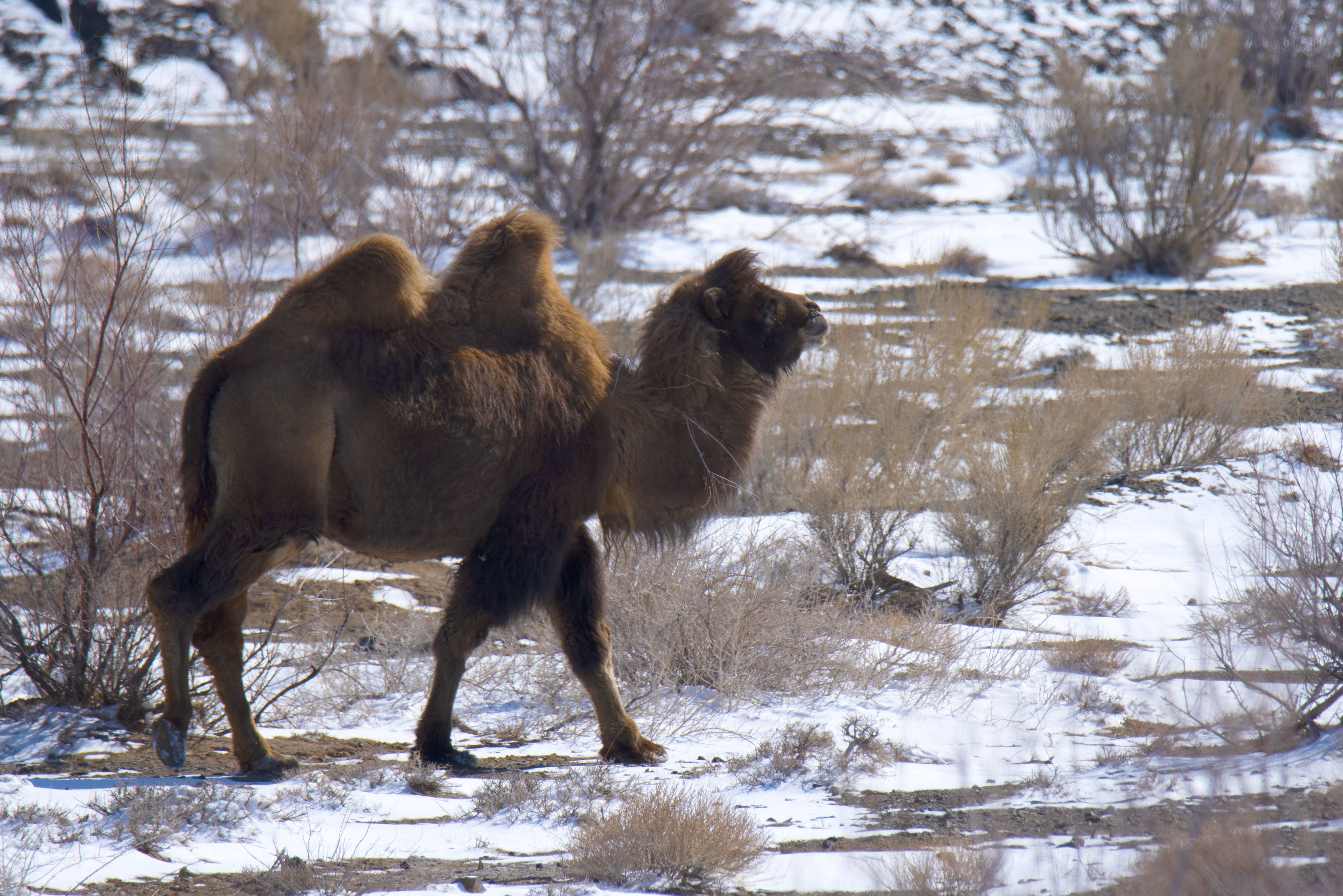 (Camelus bactrianus) can cover vast distances in search of food and water. They are also perfectly adapted for the steppes of Central Asia, able to survive not only the extremes of high summer but also the extreme lows of Winter where it can get to -40 degrees celsius.