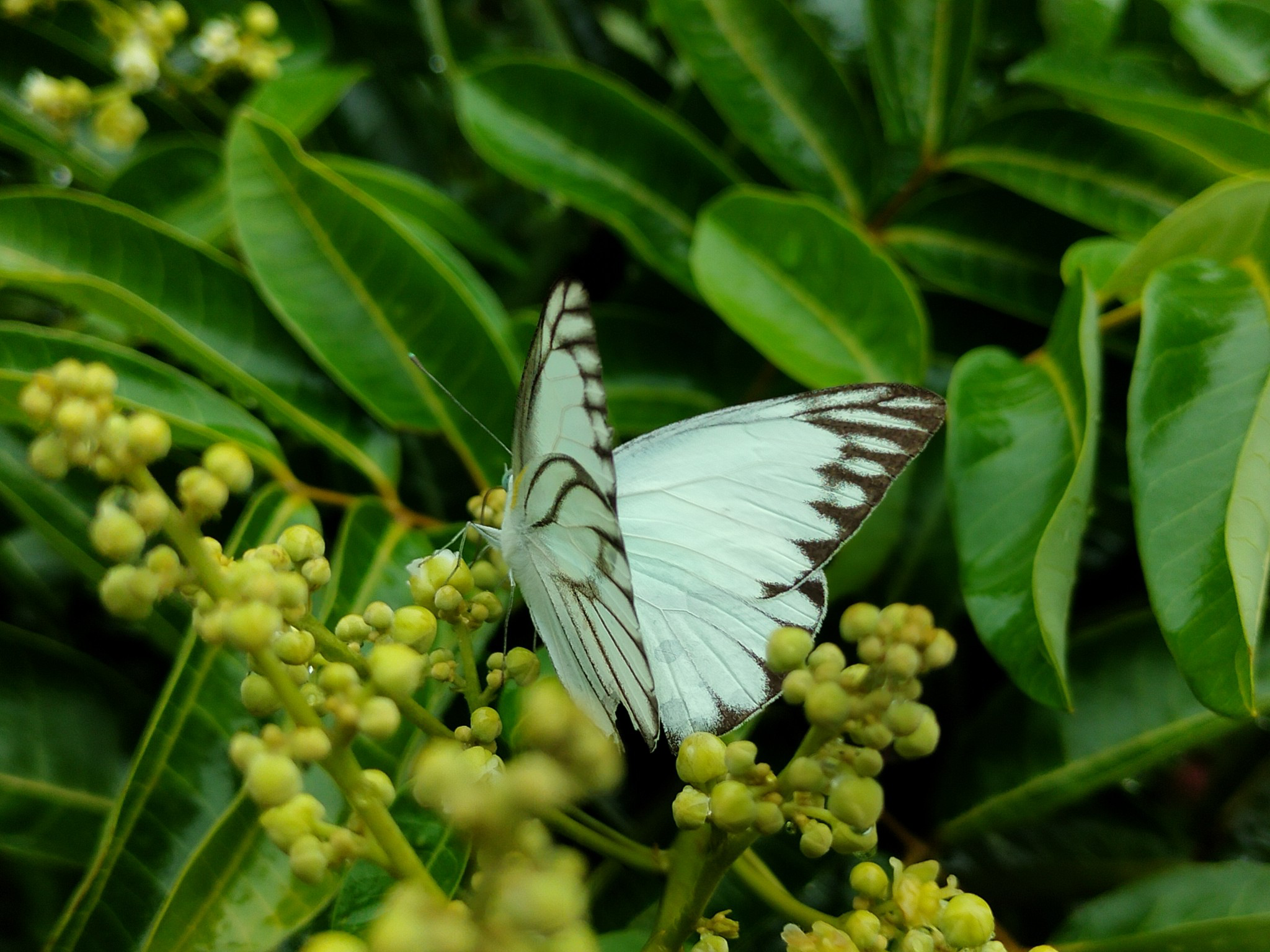 Under the shade of broad, shady green leaves, I spotted a striped albatross butterfly perched on a flower stalk. It seemed to be searching for a drop of nectar to fill its empty stomach. Its wings were fully open, flapping ever so slowly. I approached cautiously. It was the perfect model for the day, so I didn't want it to leave before I finished the photo session.