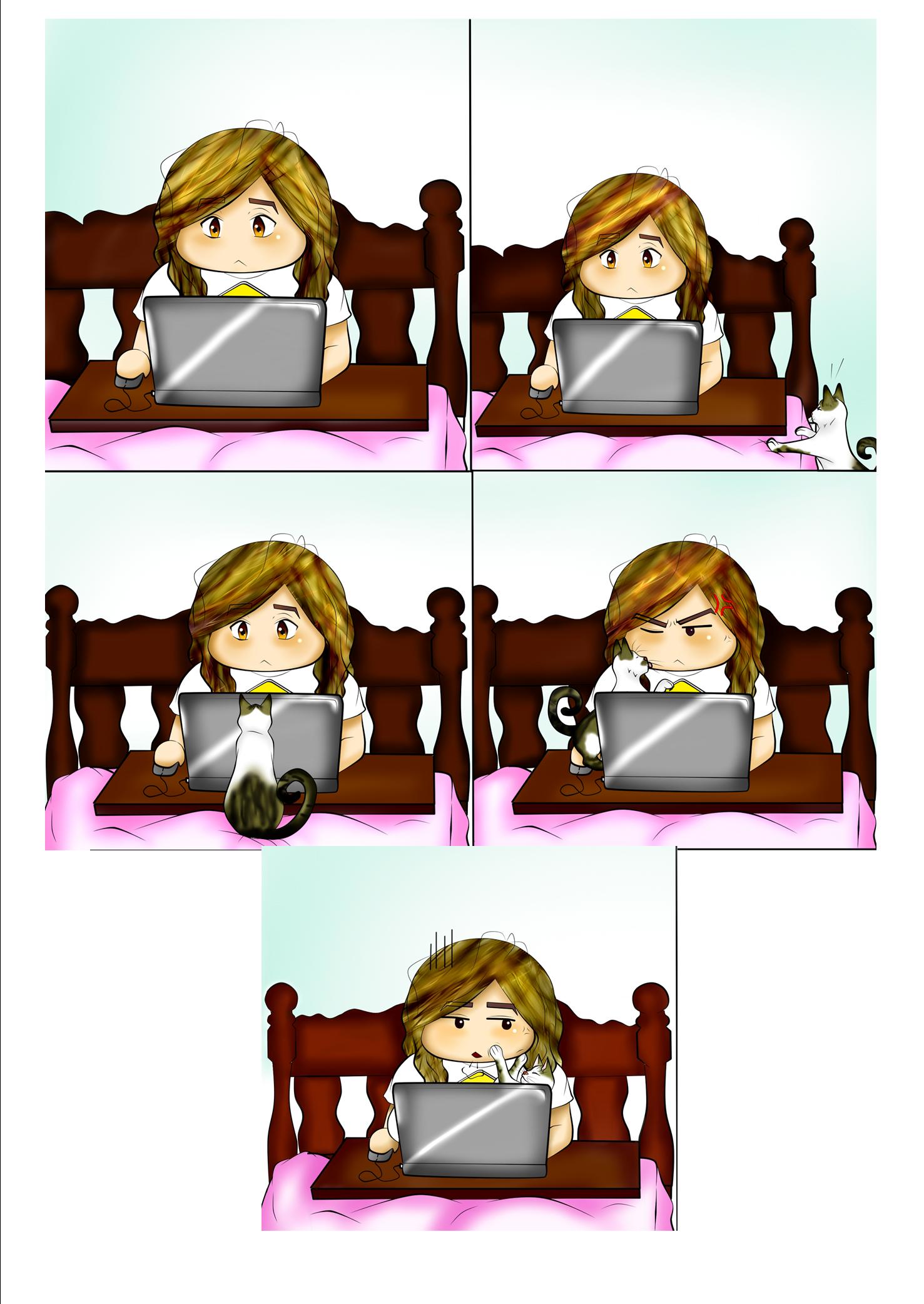 Este es un cómic que hice basado en mi día a día desde que Eme, mi gatita ciega, llego a mi vida. Realmente no estoy acostumbrada a los gatos, pero adoro el amor que siempre me da solo para que le preste atención. Tengo pensado hacer un segmento de cómic llamado "Eme y Kam" donde contare las anécdotas más random que me han pasado desde que llego esta linda gatita a mi vida. Voten positivo y comenten "Si quiero ese segmento" para motivarme mucho más a realizarlo <3 (El cómic se lee de izquierda a derecha)