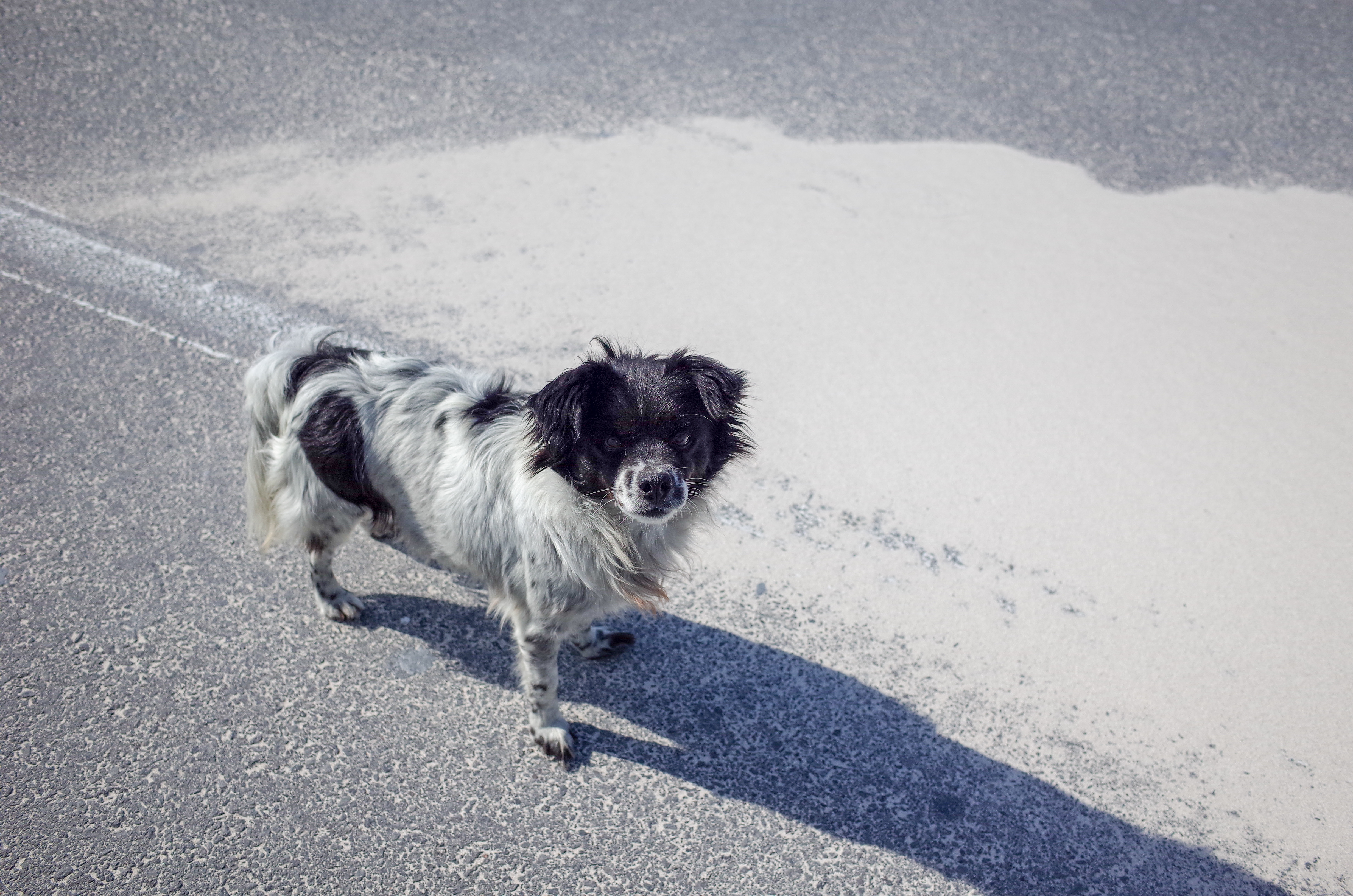 Dogs that waiting for someone for long at the side of a road of running cars,