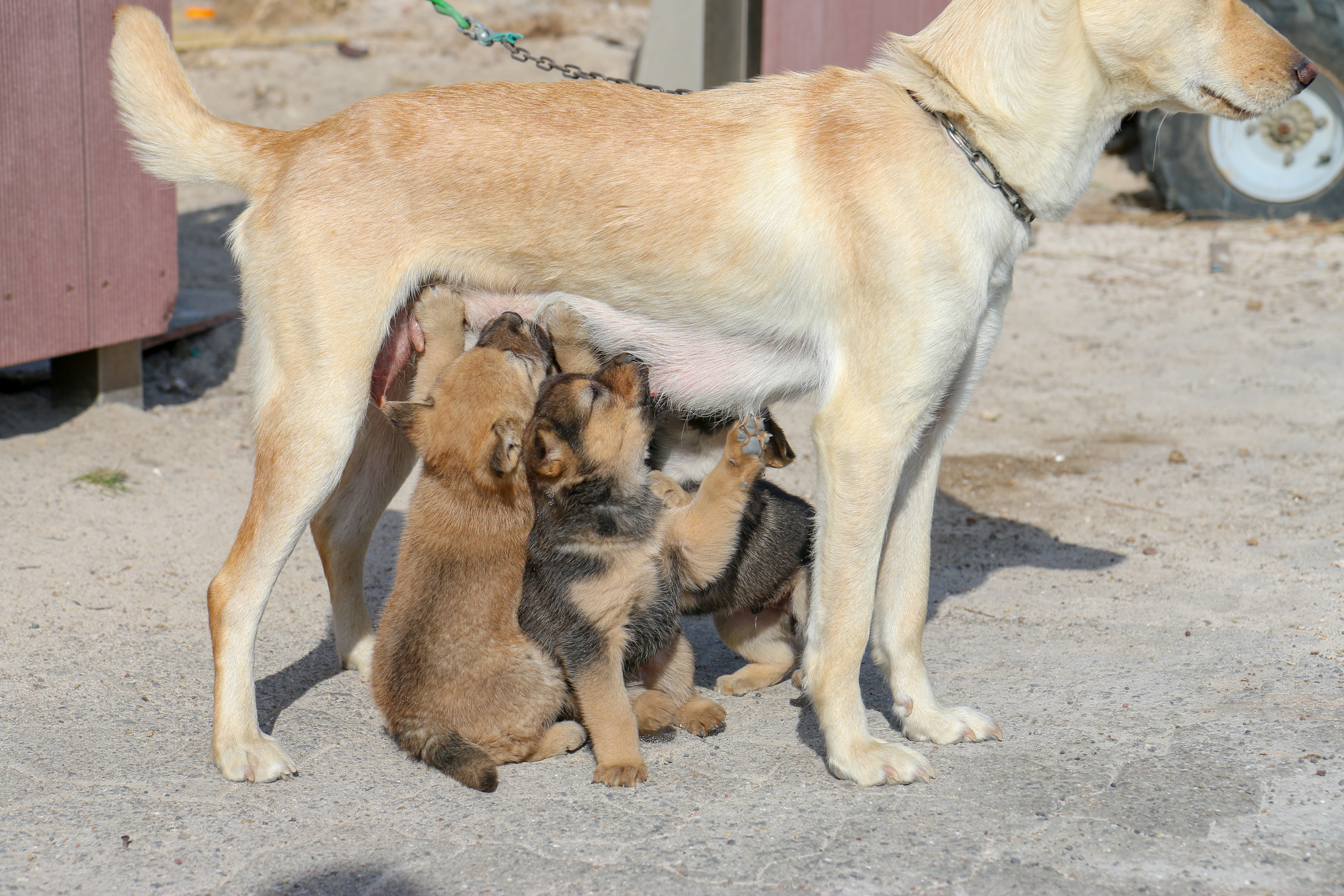 Dogs that taking a rest sitting on streets and looking one way with swollen breasts,