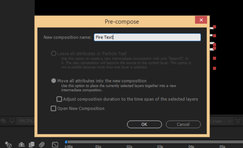 - You can then add a name to your composition, I named it "Fire text". Then select "Move all attribute into the new composition" then click ok.