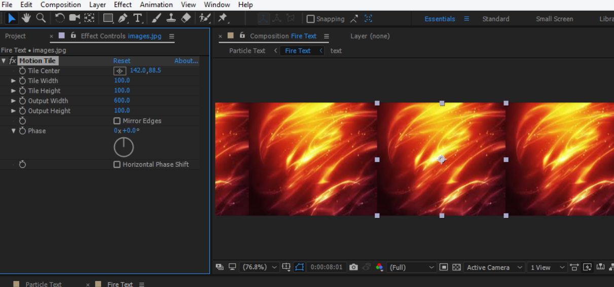 - Drag the motion tile effects and drop it to your fire image then change the output width to 600 then press enter:
