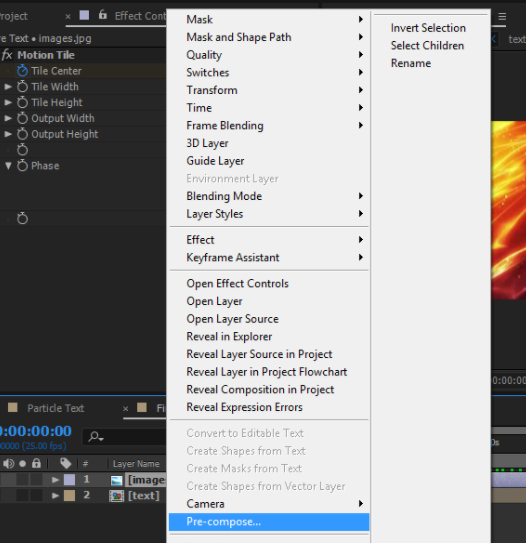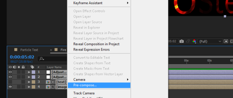 - Right-click the fire image and then click pre-composed: