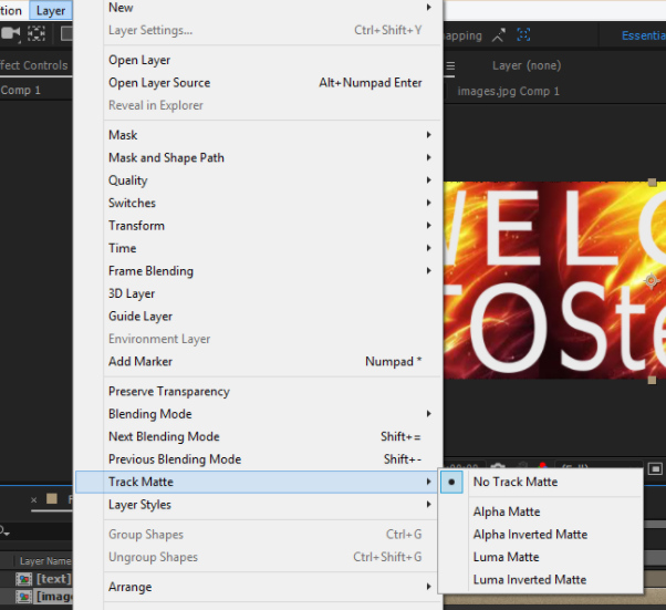 - Now select the fire image composition make sure it's selected then go to menu option click layer >track matte > alpha matte: