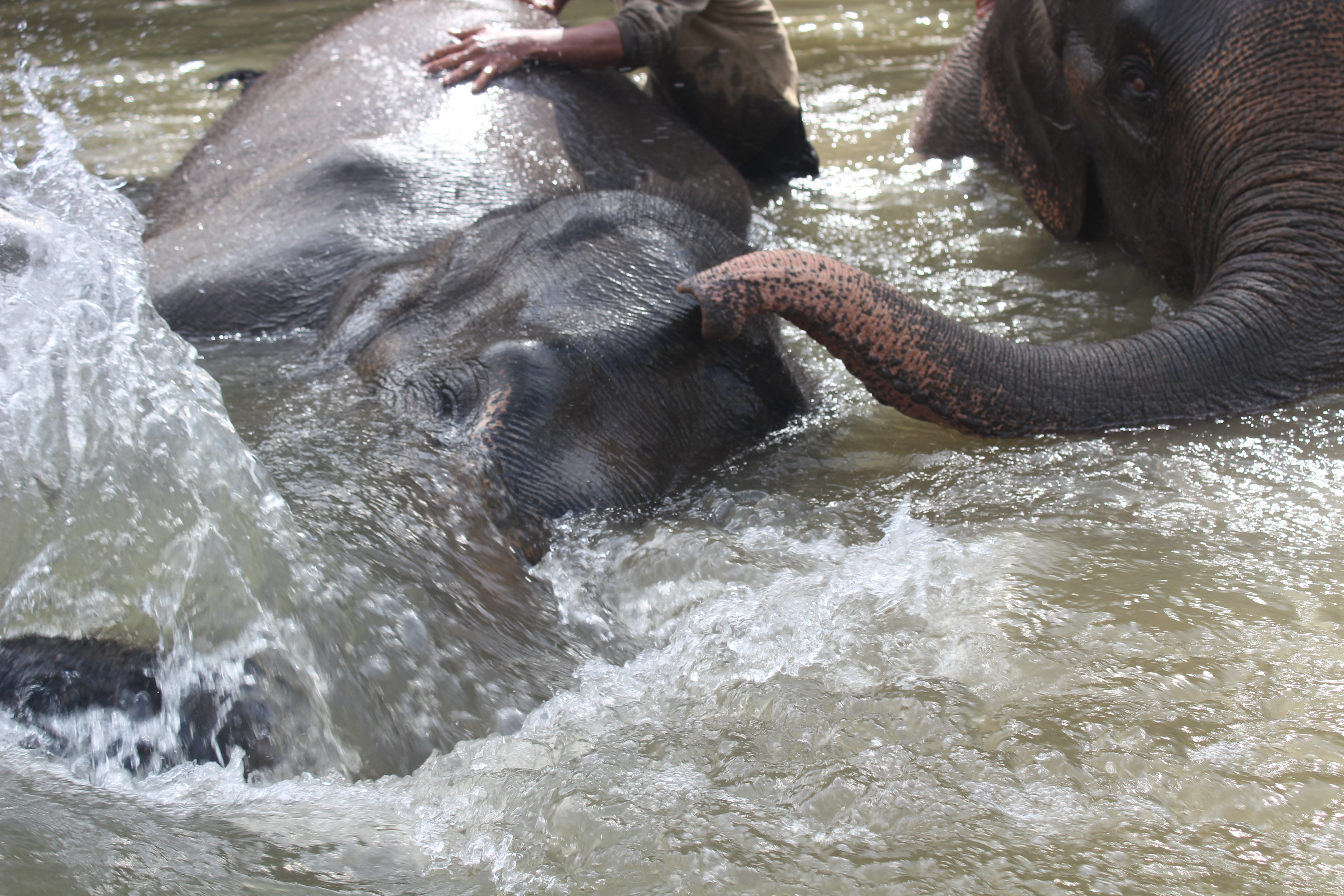 MEMANDIKAN| Pengunjung dibolehkan ikut saat memandikan gajah. Tak jarang, Keempat gajah itu juga akan menyeprot kita dengan belalainya.