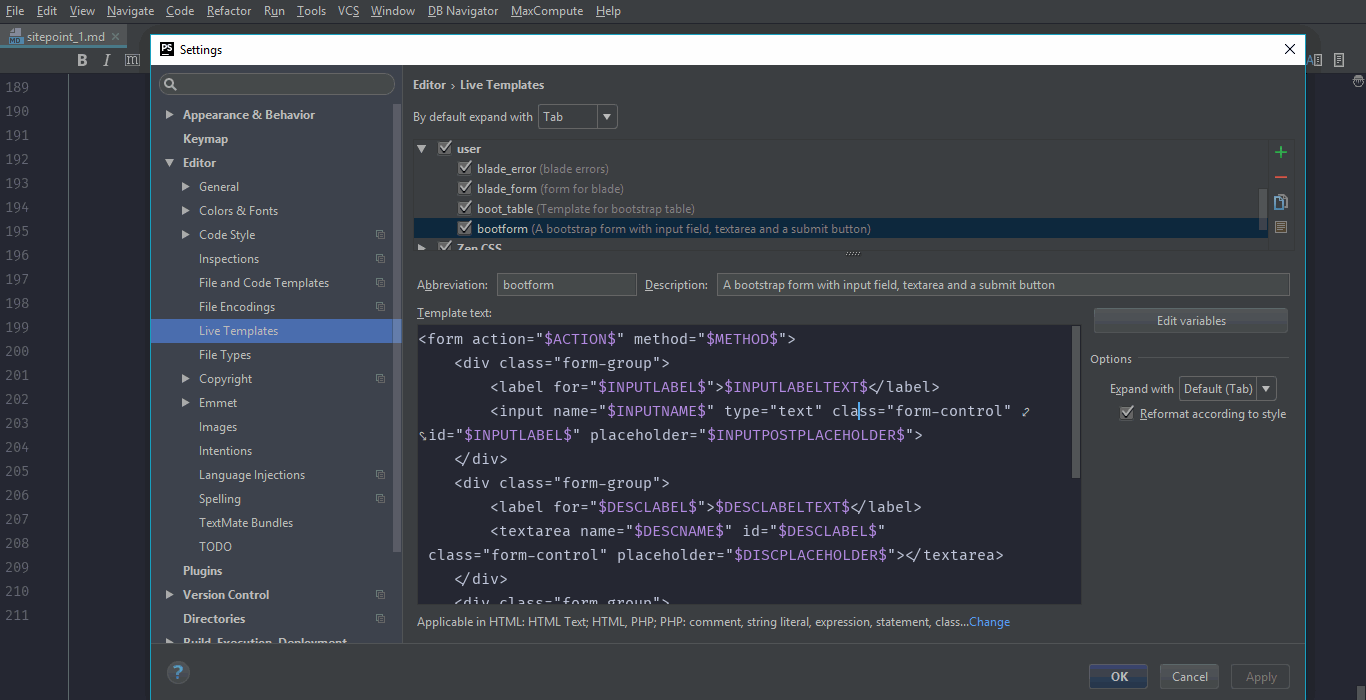 Now that our form live template is created and working but there is one thing we have not yet covered. Changing the values in that form is quite difficult. We have first to select the value and then change it. To solve this problem, PhpStorm uses variables inside live templates. We could move to change the next variable value by pressing tab key (default). Variables starts and ends with $ sign in PhpStorm. Go to settings/preferences, click Live templates and then select bootform snippet. We want the same value in the for attribute on the label as well as the id attribute on the corresponding input field. So, we will use same names for the variables in those places. Now our snippet will look like this
