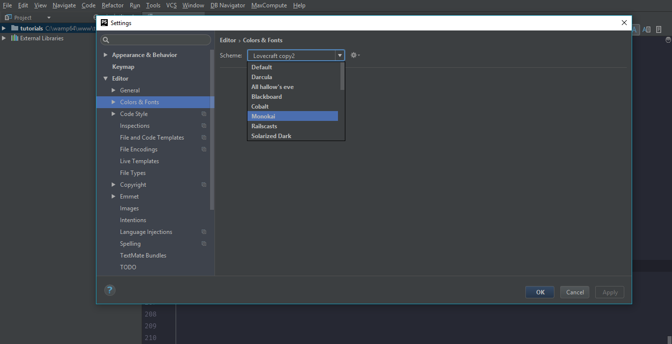 Go to your settings/preferences. Now go to Editor > Colors & Fonts and you will see that you have a default scheme of Darcula or Default. You could change it to any other available schemes you like and press OK, or you could also download other themes as well. Go to phpstorm-themes.com and select any theme of your choice. Click on that theme and download the .icls file. If you are using windows move that file into C:\Users\USER_NAME.PhpStorm_VERSION\config\colors folder. USER_NAME and VERSION are your username and PhpStorm version in the folder paths above. If you are using Mac move that file into ~/Library/Preferences/PhpStormVERSION/colors folder. Now you need to restart your PhpStorm. Go to settings/preferences select Editor > Colors & Fonts and select your new color scheme and apply it. You could also customize this color scheme by going to settings/preferences > Editor > colors & fonts drop down.