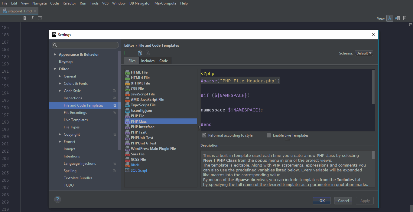 Let's say we want to create a PHP Class. Simply press ⌘ + ↑ on mac or Alt + Home on windows, then press Alt + Insert on windows or ⌘ + N on mac, then select PHP Class and create a new PHP Class named Word (or whatever you want). Now you will notice a file template right after the <?php. That does not look good, but we could change it to anything we want. One important shortcut that you could use to find any option is ⇧ + ⌘ + A on mac or Ctrl + Shift + A on windows. Now you could enter any action here. Let's search for file template and press enter to select the highlighted result. So, we have here a variety of dynamic code snippets that will be inserted when a file of the appropriate type is created. For example, let's select PHP Class, and you will notice that it includes a file header at the top that gets added. If we switch to includes tab, you will see that there is a PHP File Header that just includes a simple doc block. Now if you do not want that doc block, remove this line #parse("PHP File Header.php") from the PHP Class inside Files Tab. Now if we create a new PHP Class named Check, it will not include any doc block. We could also create new File Templates that we could use when we press Alt + Insert on windows or ⌘ + N on Mac. Go back to file and code templates in settings/preferences and click on the plus or add icon at the top of the tabs. Add Blade as the name and blade.php as the extension or whatever you are trying to create. Now if you create a new file by using Alt + Insert on windows or ⌘ + N on mac, you will see another option to create a Blade file. Click on it and enter any name and it will create a file with blade.php file extension that you could use for your Laravel PHP framework project. Also, you could use variables the same way as they were used in PHP class template. You will be asked for their values when you create a new file.