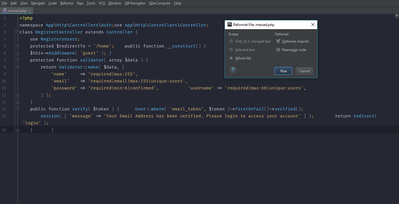 But PhpStorm is very useful in automating the process of reformatting. Simply press ⌘ + ⌥ + L on Mac or Ctrl + Alt + L on windows or select Code > Reformat Code and if you see a dialogue box pops up on the screen, simply select Do not show again and press Run. Now all of that messed up code is formatted.