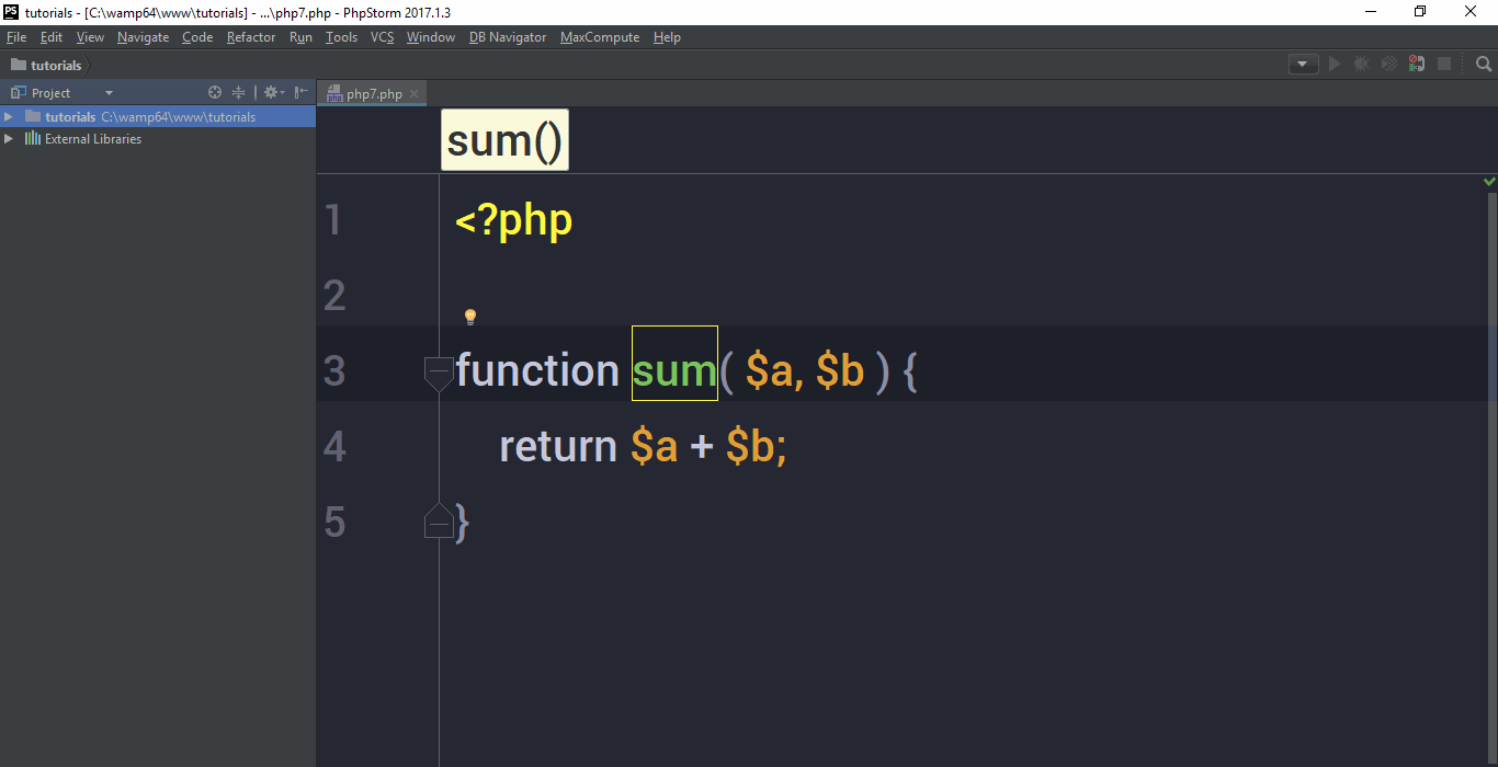 Sometimes you want to focus on your code by making your IDE as minimal as possible. There are a lot of things going on in PhpStorm. The biggest thing is the sidebar. We could toggle the sidebar by using Alt + 1 on windows or ⌘ + 1 on Macintosh or just clicking on the hide icon at the top right corner of the sidebar. You could toggle navigation bar by selecting View > Navigation Bar. Also if you want to enter the full-screen mode where you will only see your code, go to the View drop down and select Enter full screen mode View > Enter Full Screen Mode. You could also remove tabs by right-clicking on the tab and selecting Tabs Placement > None. If you would click on any method or function, you will see that you see a nice breadcrumb shows up at the top. If you want to remove that as well, Go to your settings/preferences. On Windows go to your settings by pressing Ctrl + Alt + S or choosing File > Settings. If you are using Mac, go to your preferences or just press ⌘ +,. Now in the search box write breadcrumb and then deselect Show Breadcrumbs check box. If you want tabs back, simply go to settings/preferences > Editor > General > Editor Tabs and select Top from the Placement drop down. You could toggle a lot of things, and you can check them out in the View drop down. Now your IDE is minimal as possible and only focusing on the code.