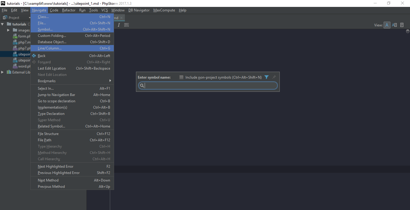 Go to the Navigate menu, and you could see that PhpStorm offers various ways to navigate around your project. You could browse by class name. Simply press Ctrl + N on windows or ⌘ + o on mac and write the class name. Or you could browse by file name. Simply write your desired file name and select the file. You could also search by symbol. Think of symbol as the methods or functions. If you wanted to search by either of them, use the symbol navigate option. You could also navigate to any Line and any Column inside that Line by choosing Navigate > Line/Column.