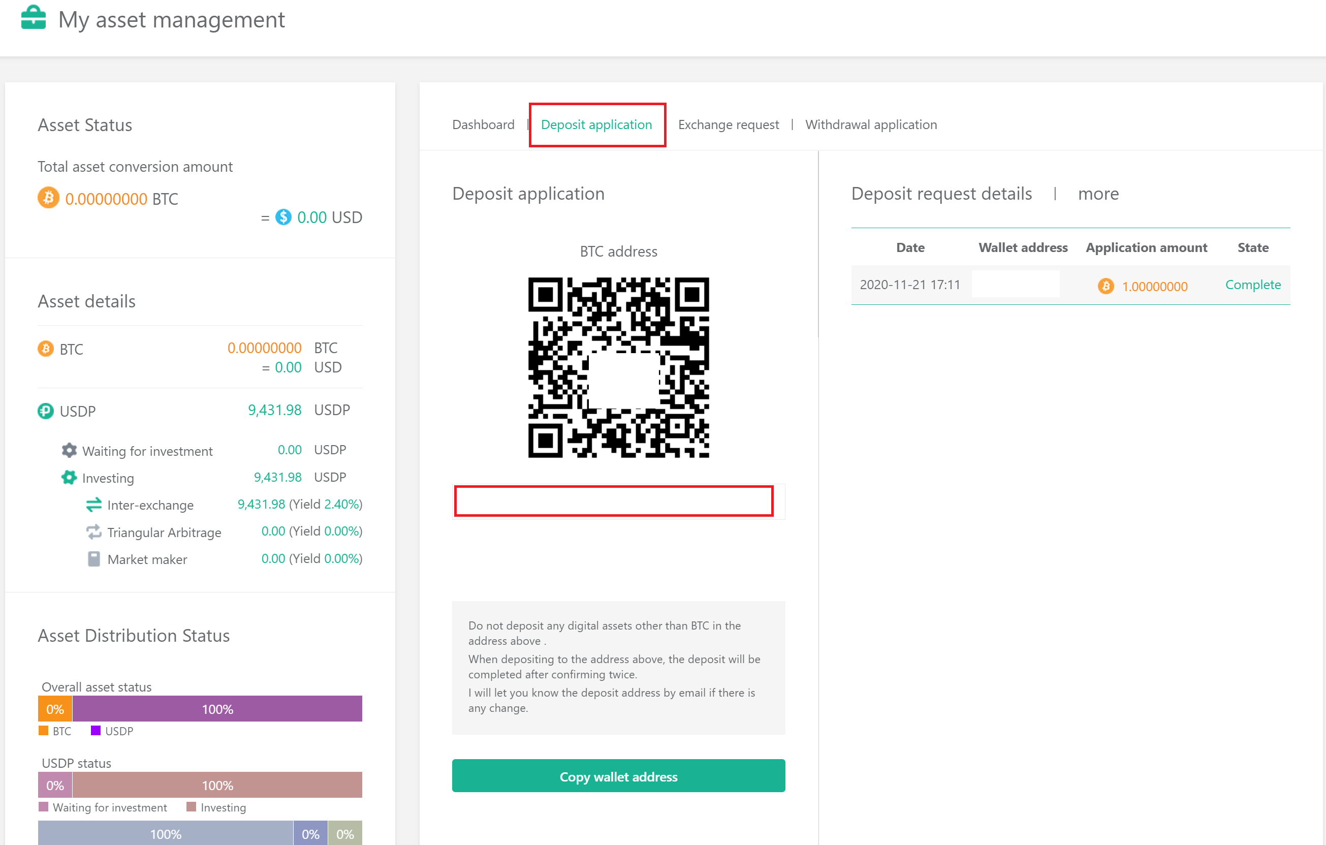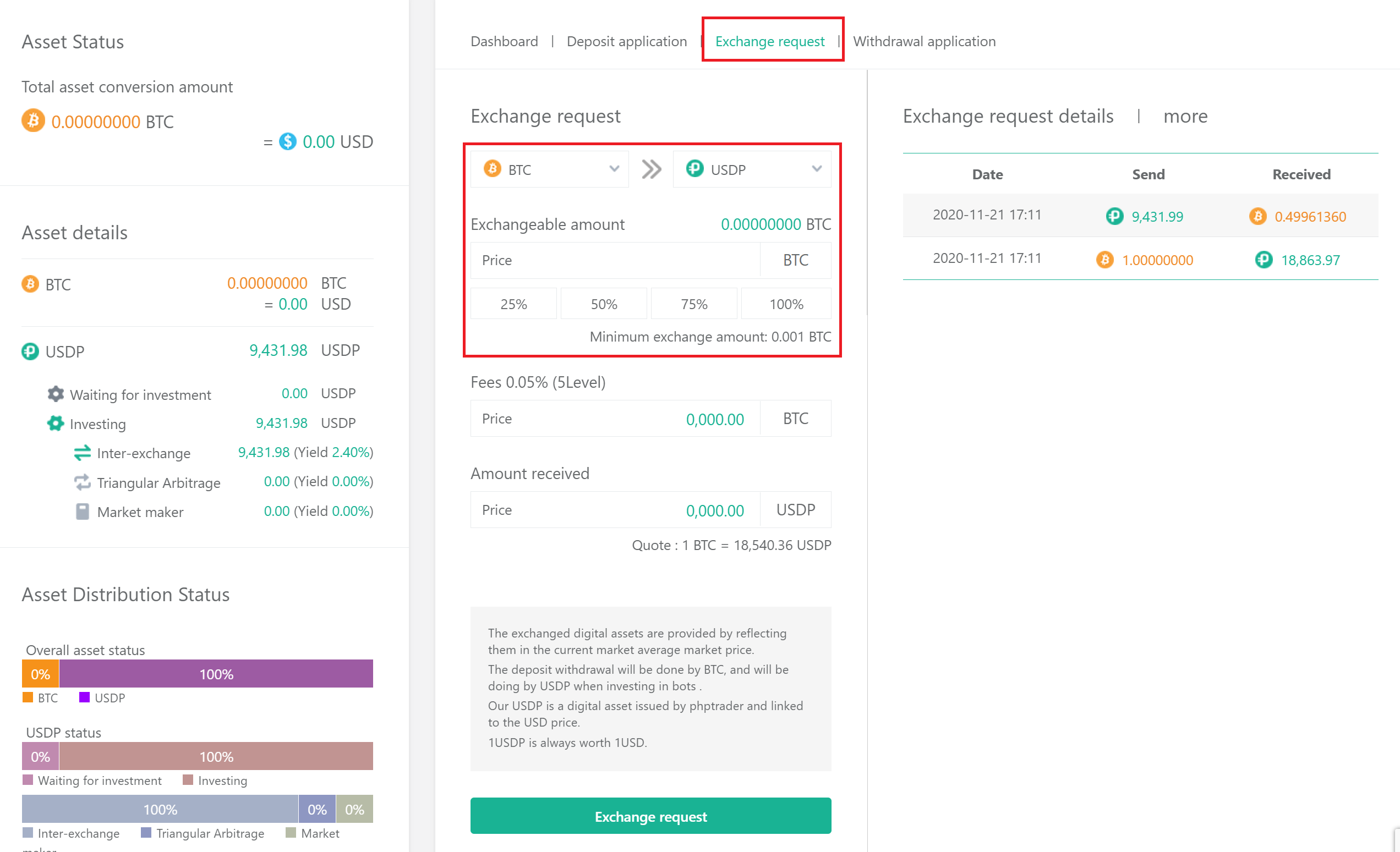 Click on "Exchange Request" at the top of the screen. Here you can click the USDP and BTC cryptocurrency tab you want to exchange.