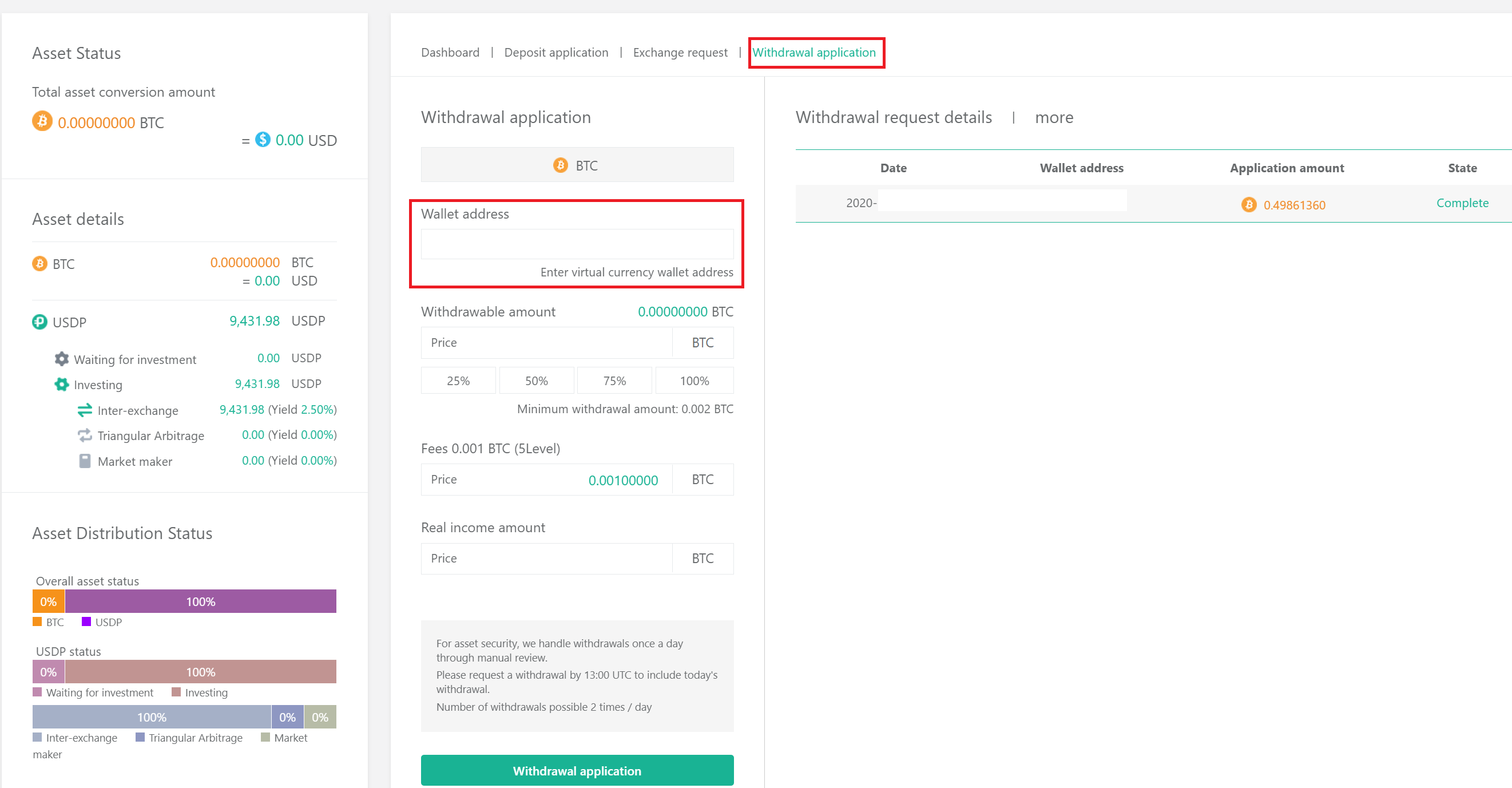 If you click the "My Assist" tab at the top of the screen, it takes you to your wallet. Click the "With Application" button, copy the address of the wallet to be withdrawn, and enter it correctly. Bitcoin can then be withdrawn to that address.